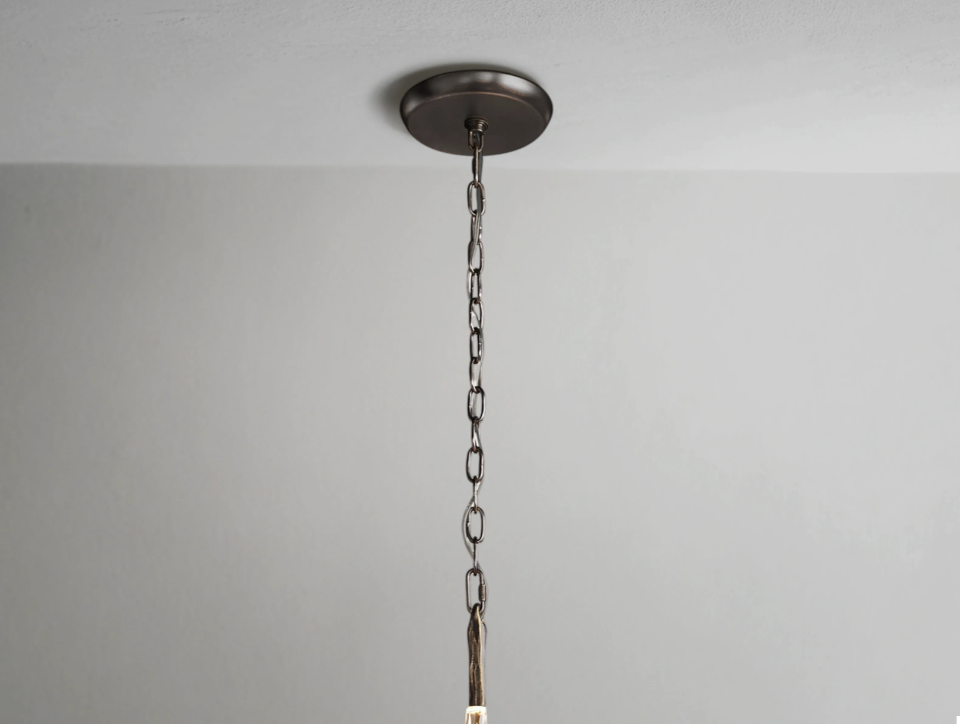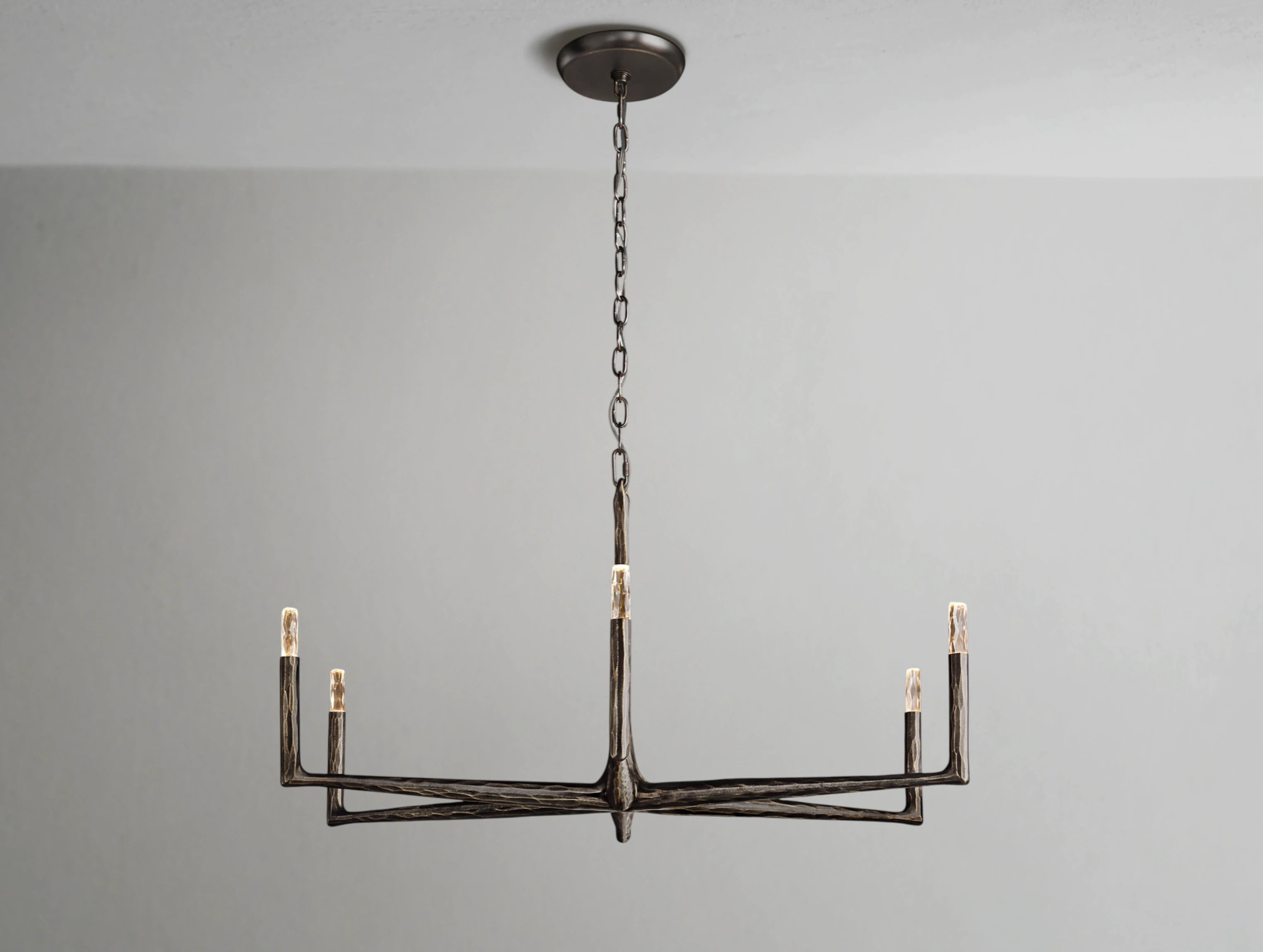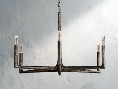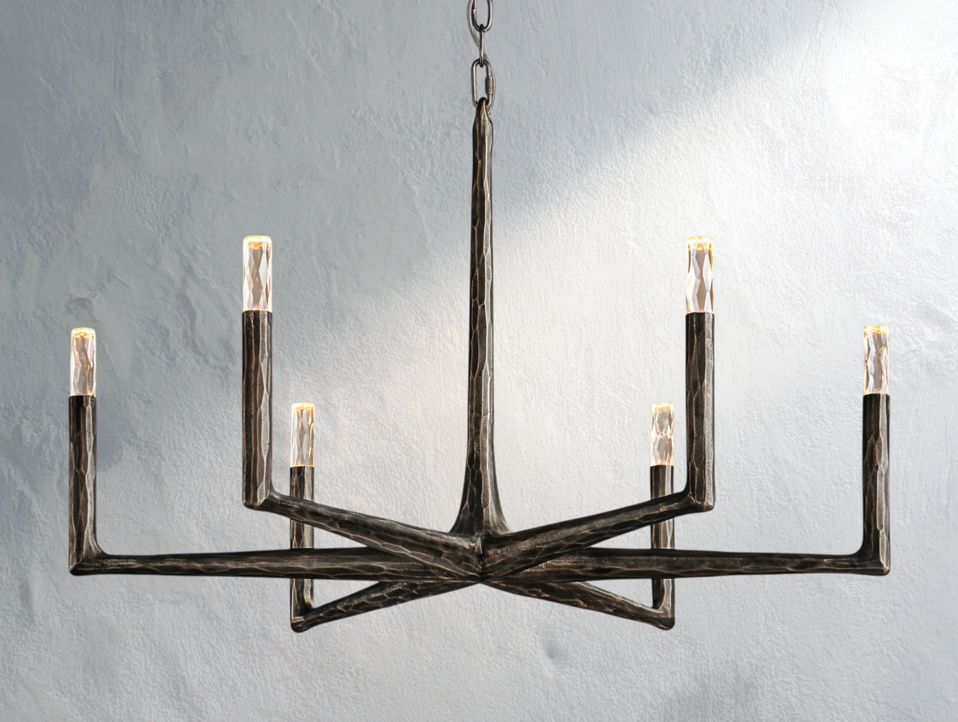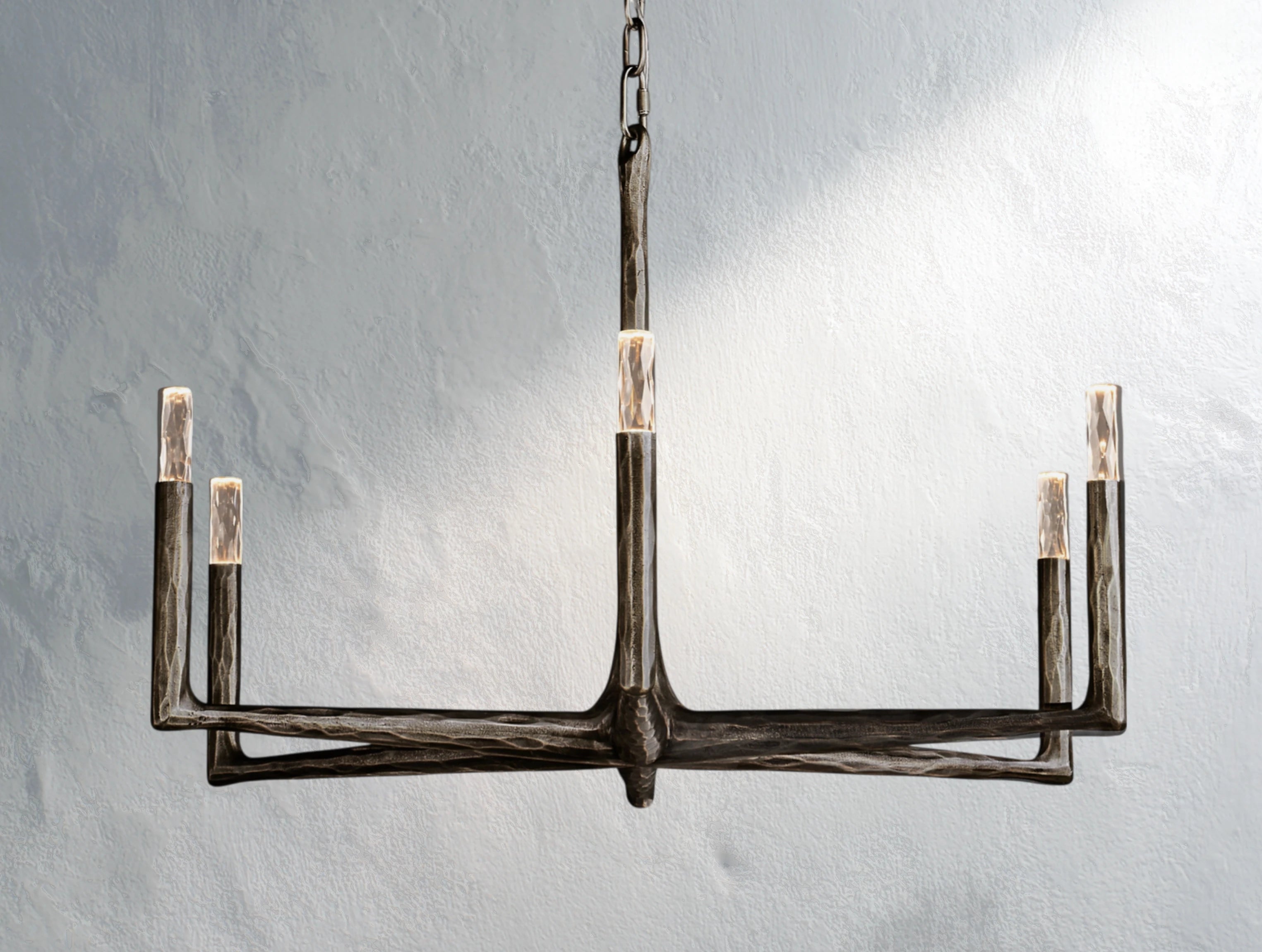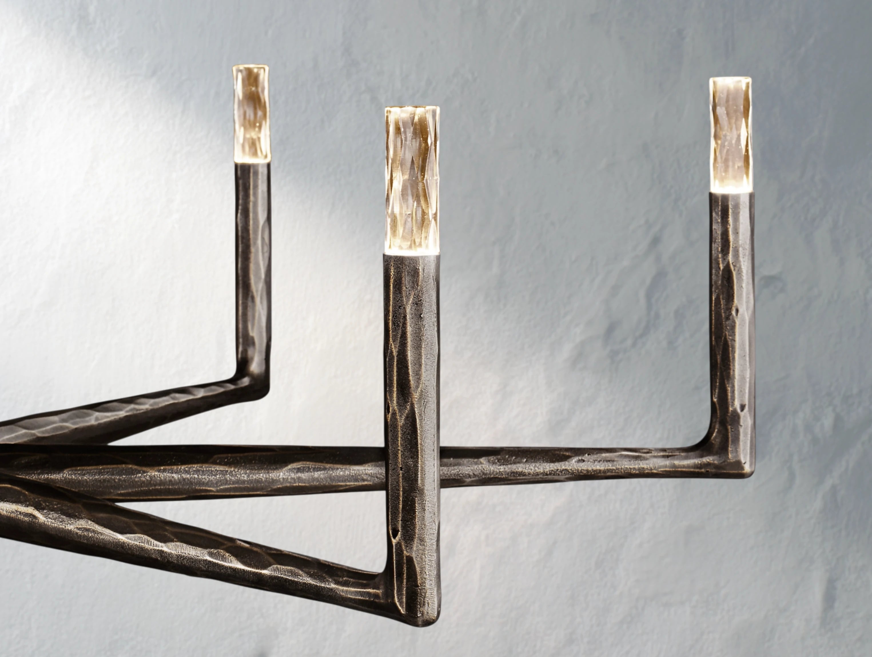Sculptural and textural, this chandelier draws inspiration from the works of Dalí and Giacometti. Artisans employ an ancient forging process, hand-hammering solid brass or steel into slender, tapered frames with alive, organic texture. Faceted cast glass shades echo the hammered surfaces, scattering a warm glow across dining rooms, living areas, or grand entryways. Each piece is one of a kind, celebrating its handcrafted nature.