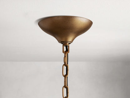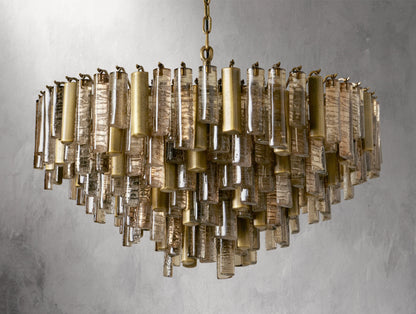 Inspired by traditional Italian Murano fixtures, this round chandelier blends cast glass and metal into a richly layered, sculptural form. When illuminated, the K9 glass elements capture and diffuse light with depth and texture, creating a refined yet expressive presence. The mixed-material construction brings artisanal character to dining rooms, living areas, or spaces with vaulted ceilings.