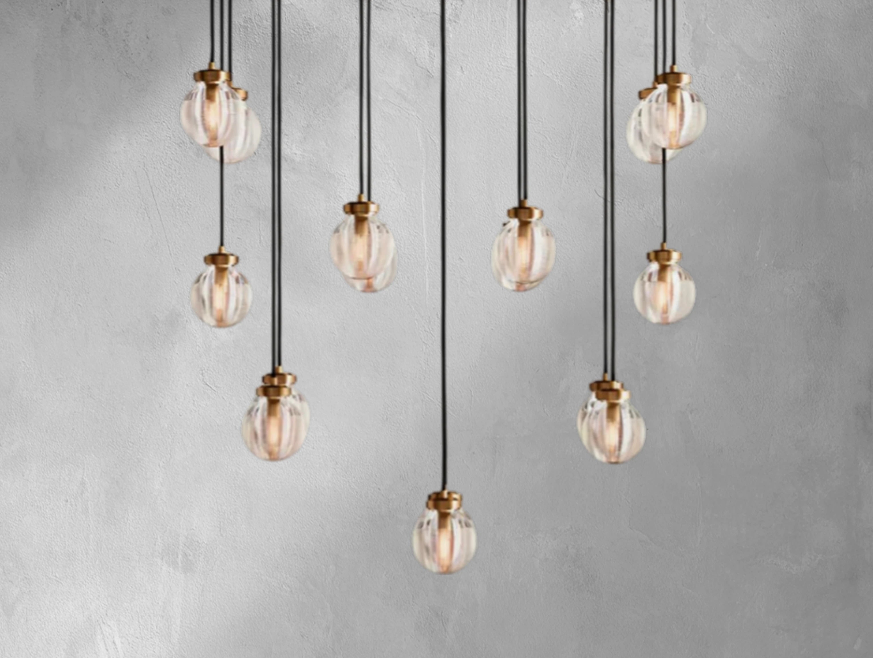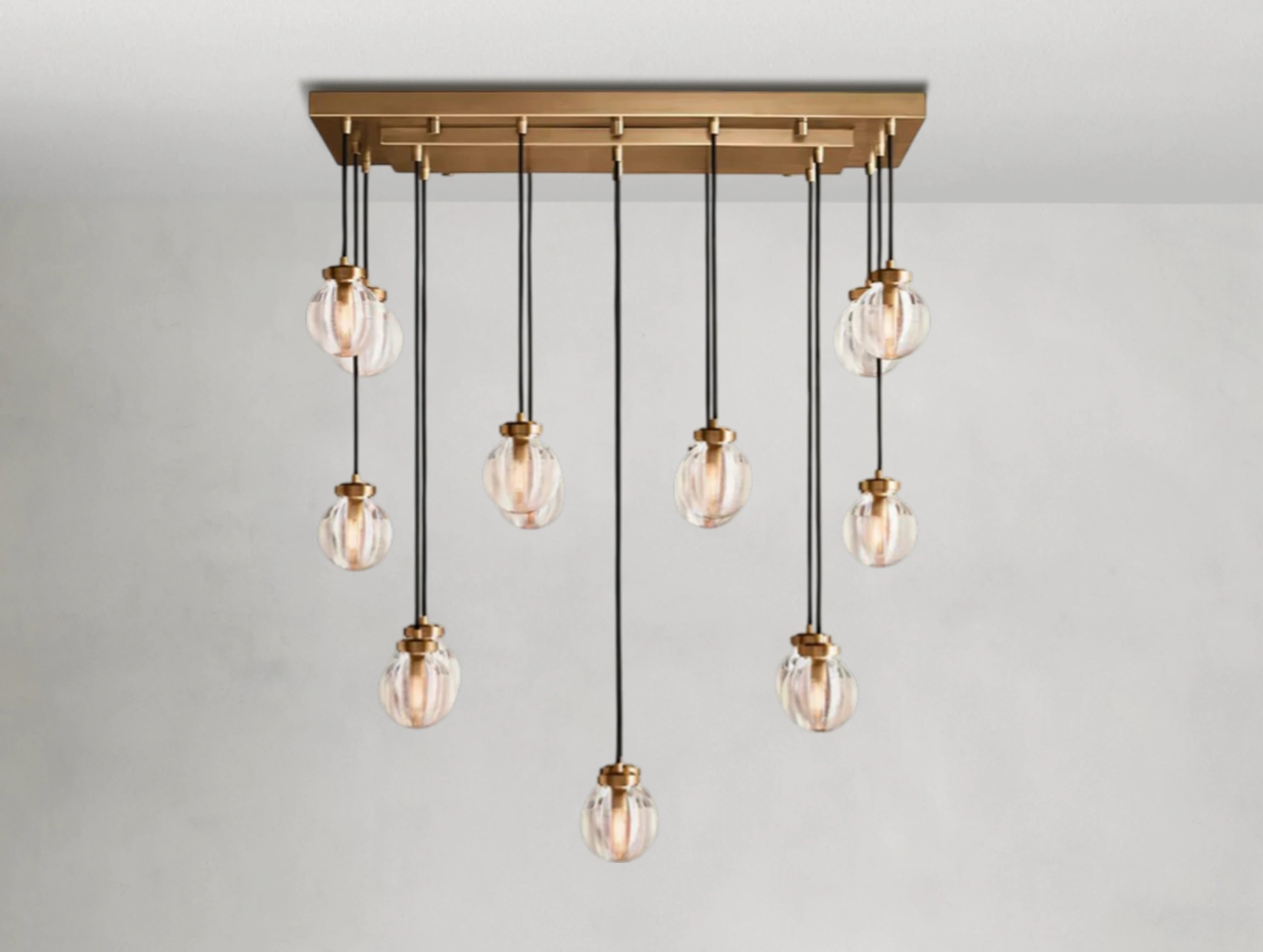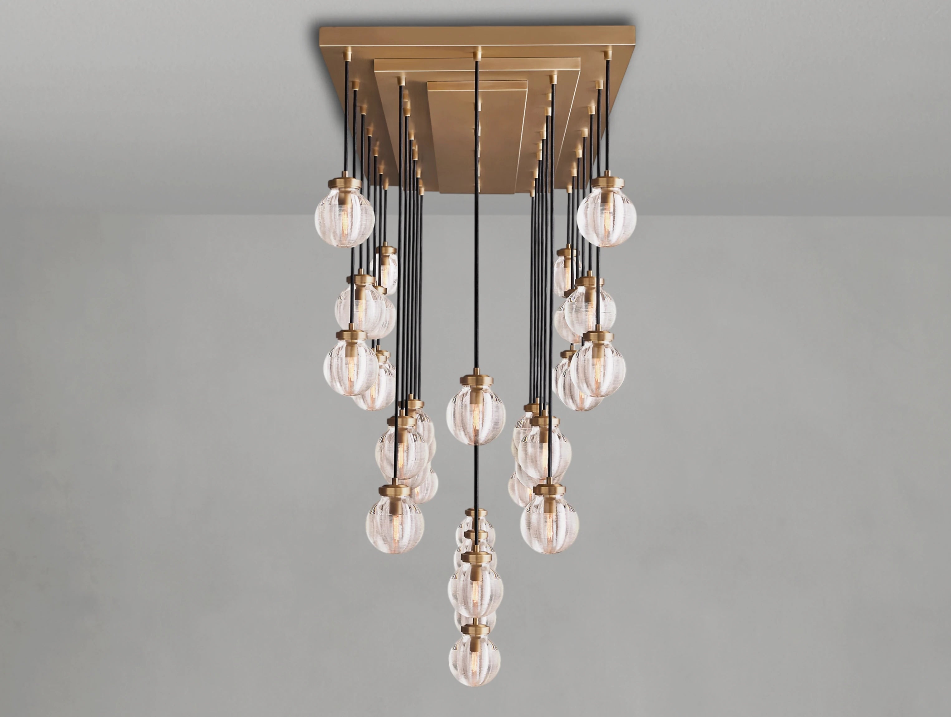 The Pearl Balls Rectangular Chandelier brings the radiance of the sea indoors. Inspired by the Venetian inciso technique, each crystal “pearl” is hand-carved with delicate grooves that filter and refract the light, producing shimmering layers of illumination that feel both ethereal and intimate.