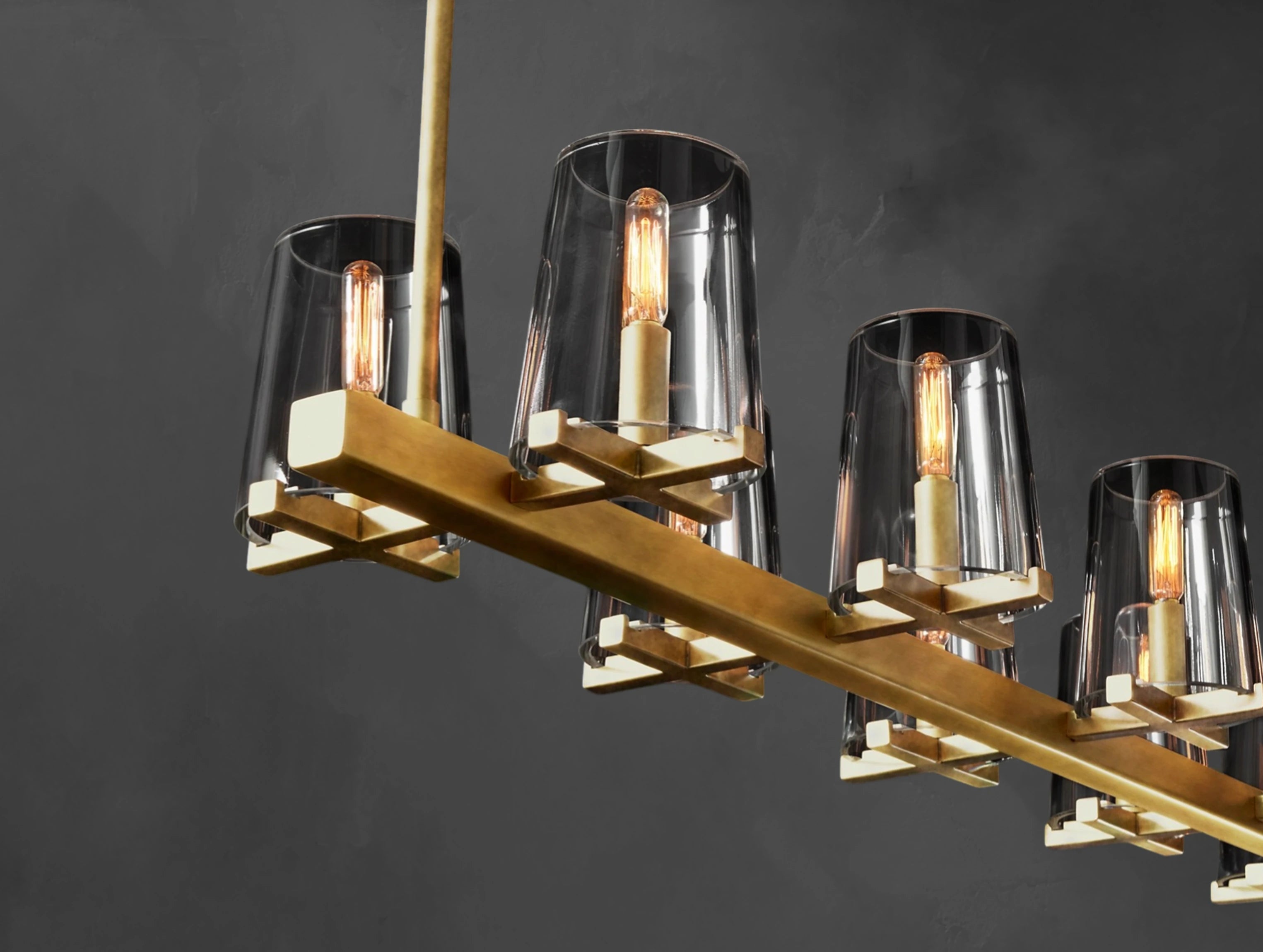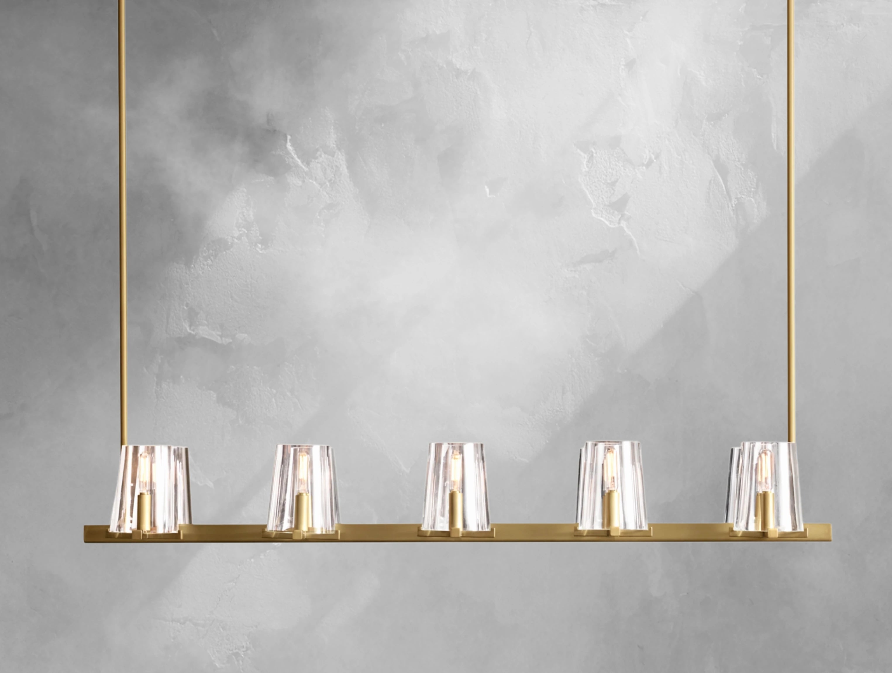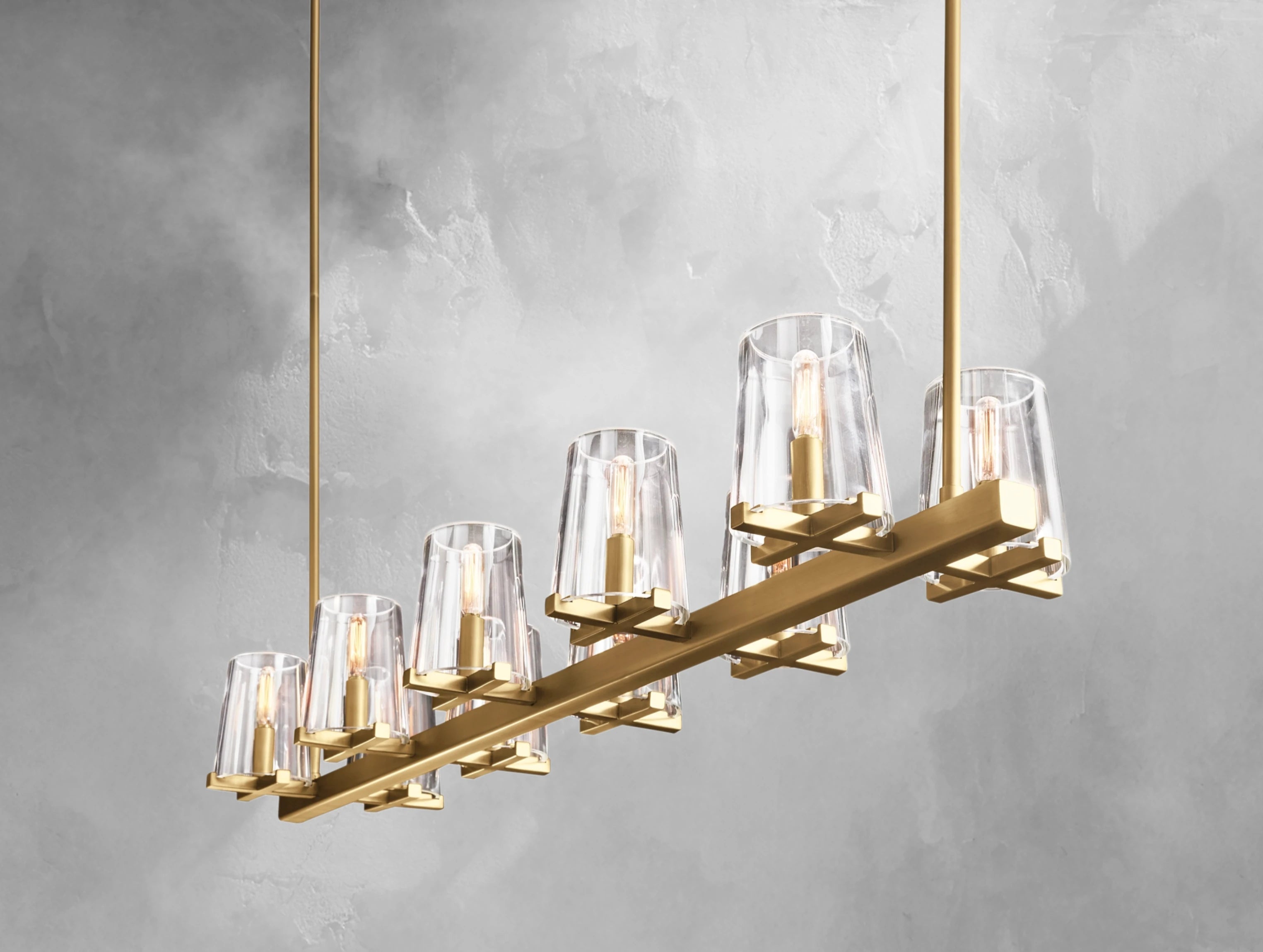 Balancing weight and lightness, this chandelier draws inspiration from elegant French designs of the 1940s. Handblown tapered glass shades rest delicately atop bold X-shaped brass frames, combining sculptural mass with refined airiness. Its elongated form makes it an ideal centerpiece for dining tables, kitchen islands, or long living spaces.