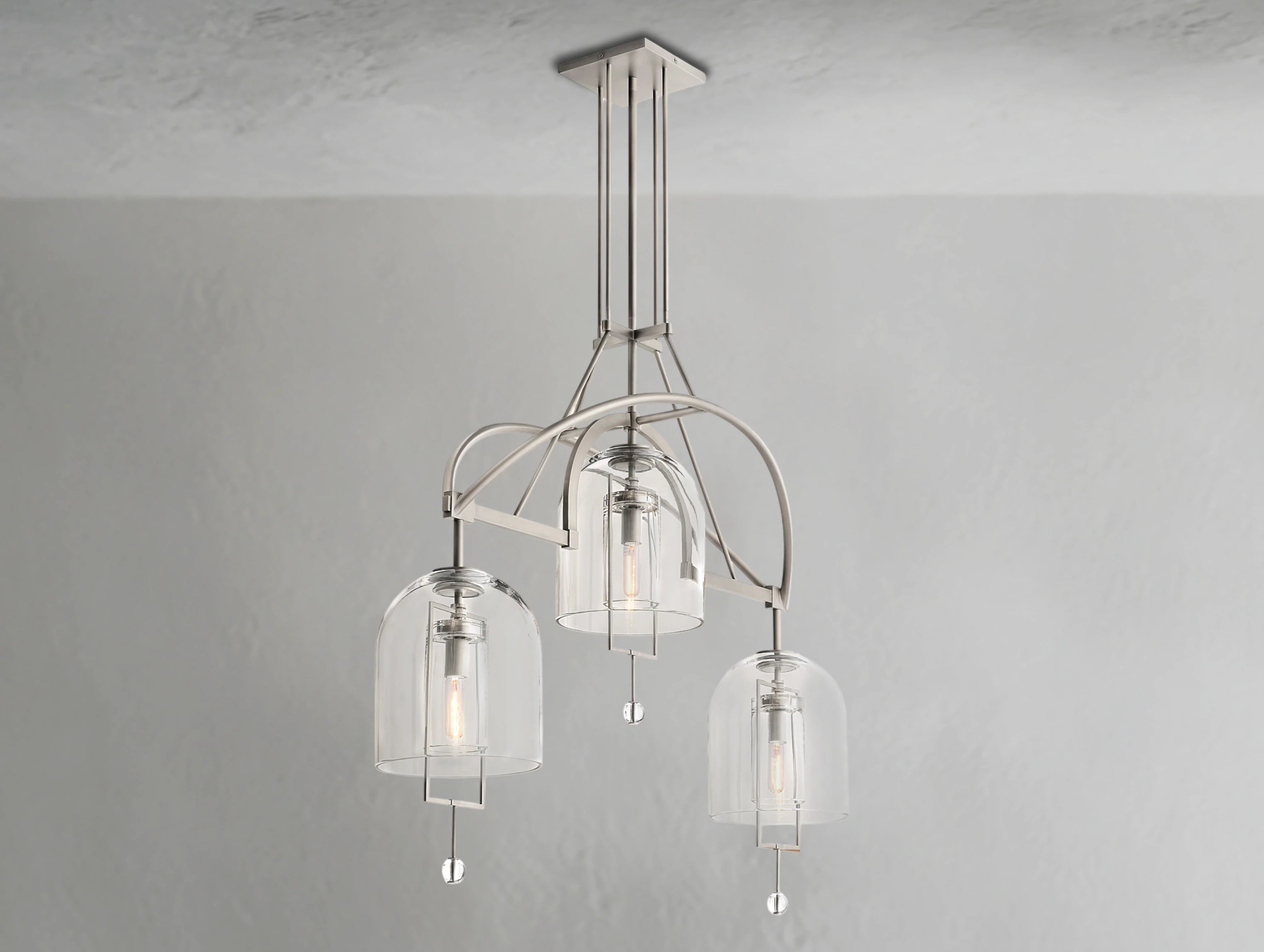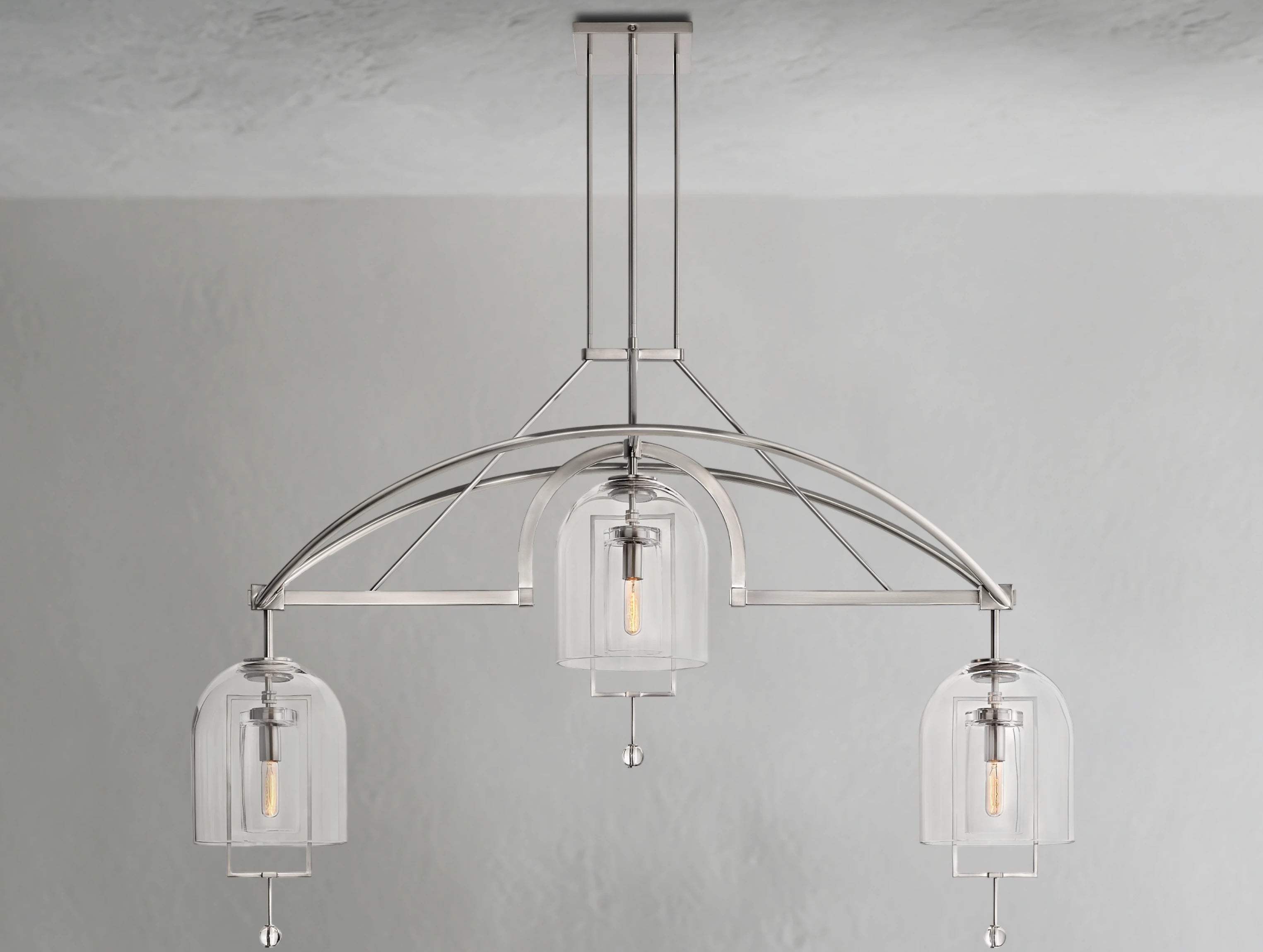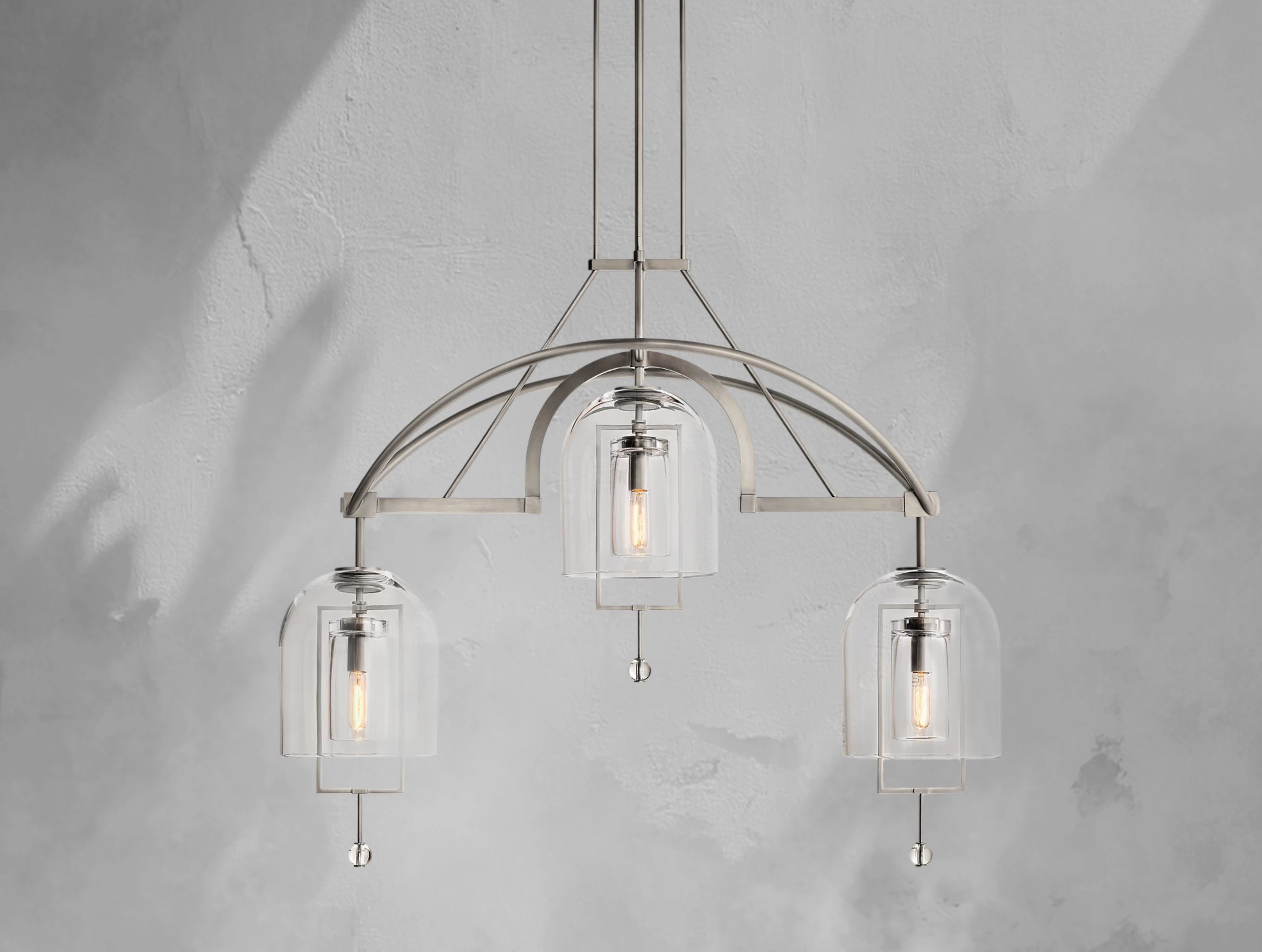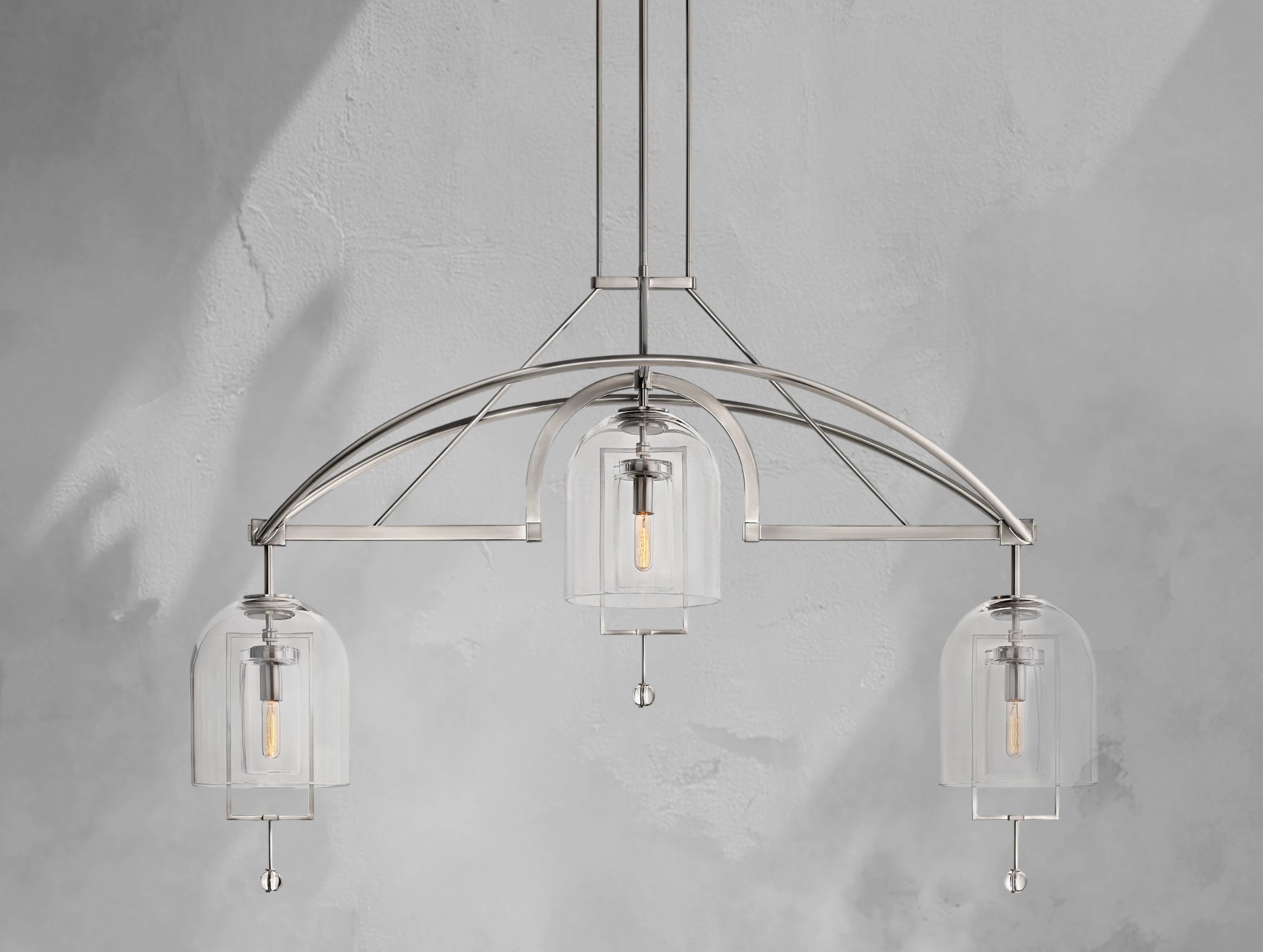 The Pivot Linear Chandelier balances art and illumination, featuring three thick, hand-blown glass shades suspended from a solid brass frame. Each glass form reflects the artisan’s touch, with subtle bubbles or slight asymmetry making every piece one of a kind. A radiant focal point, this chandelier adds sculptural elegance to dining rooms, kitchens, or long spaces.