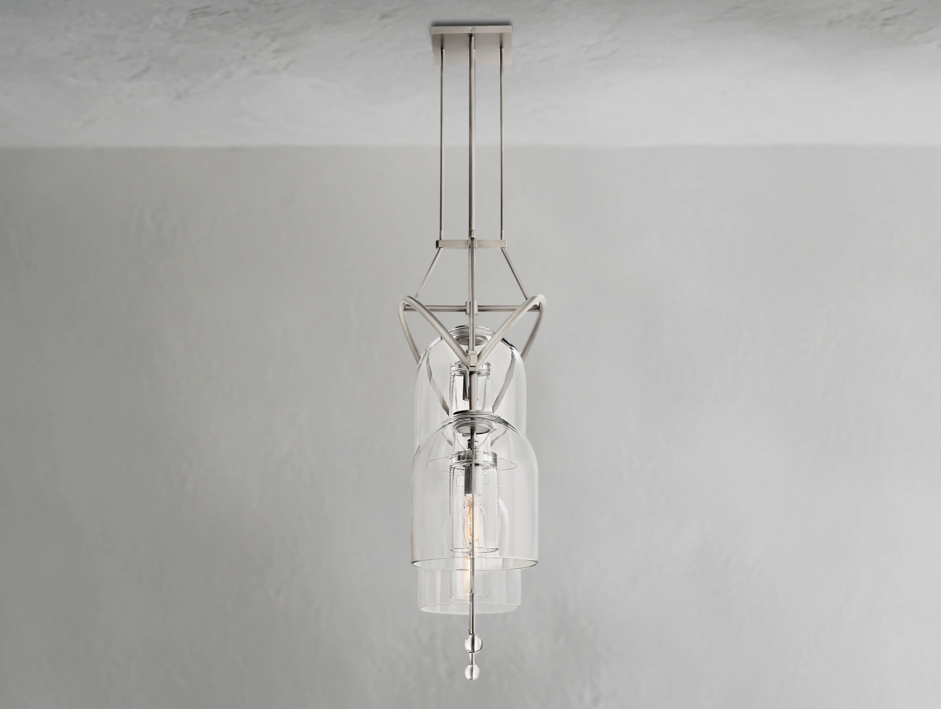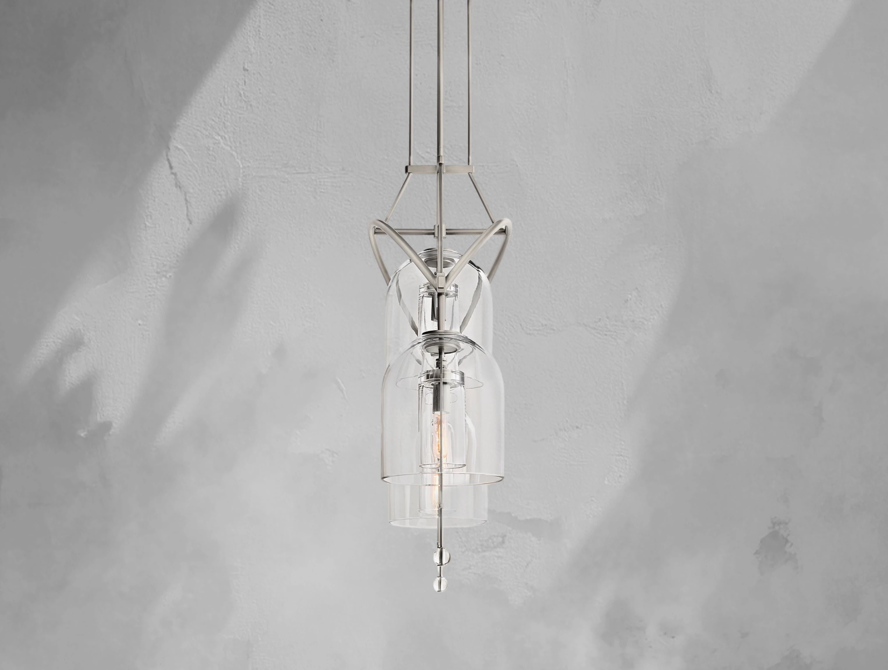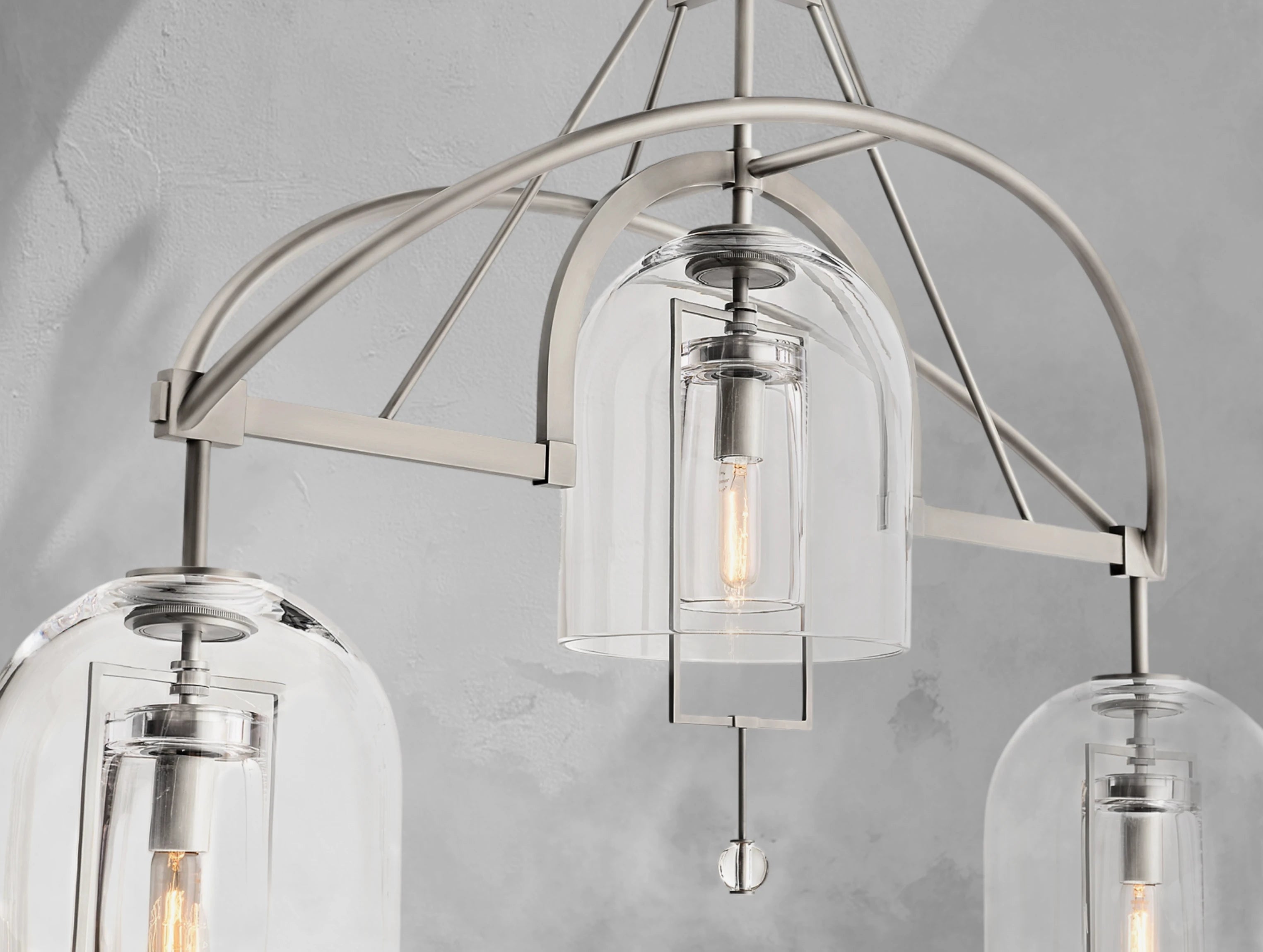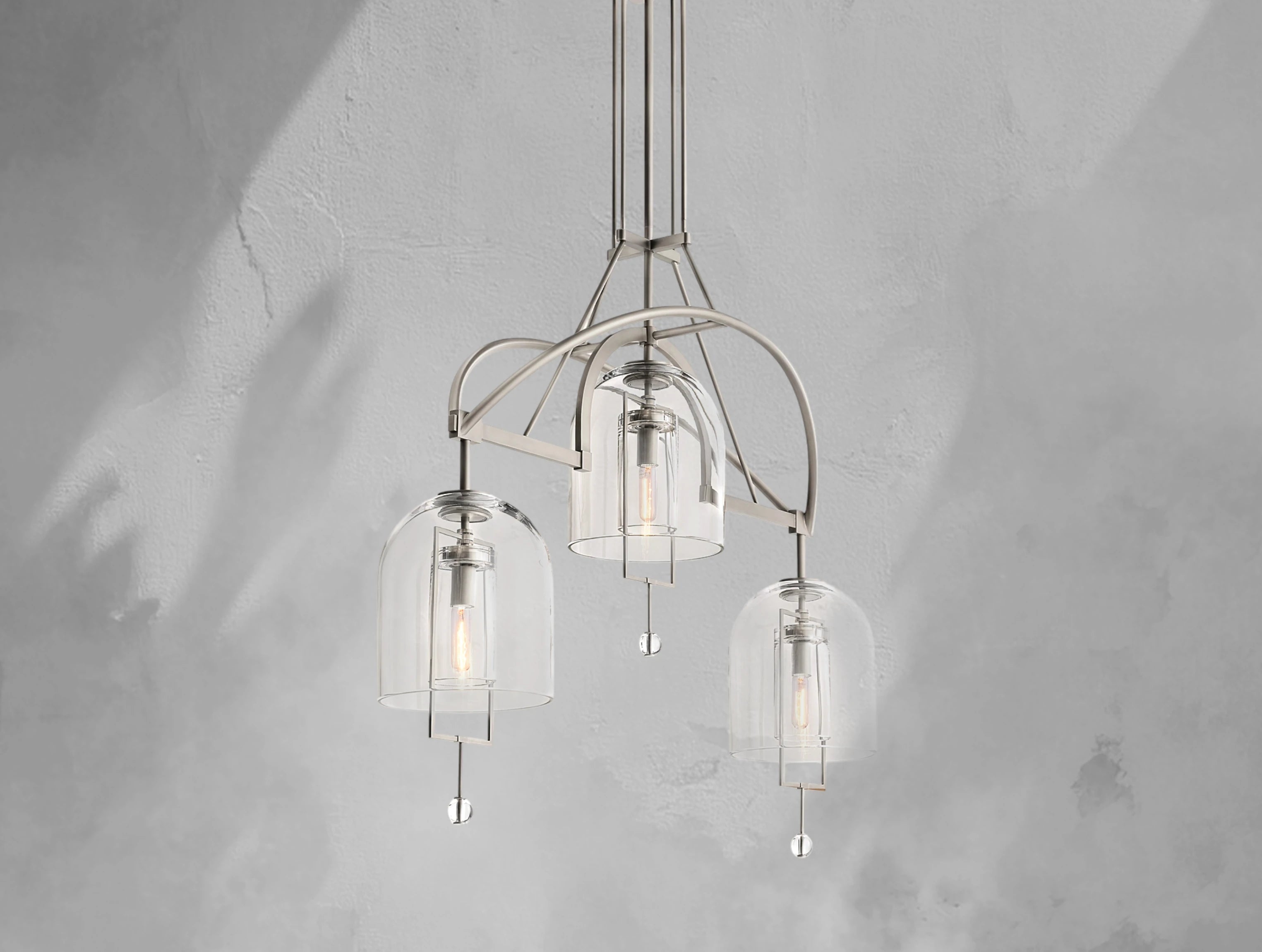 The Pivot Linear Chandelier balances art and illumination, featuring three thick, hand-blown glass shades suspended from a solid brass frame. Each glass form reflects the artisan’s touch, with subtle bubbles or slight asymmetry making every piece one of a kind. A radiant focal point, this chandelier adds sculptural elegance to dining rooms, kitchens, or long spaces.