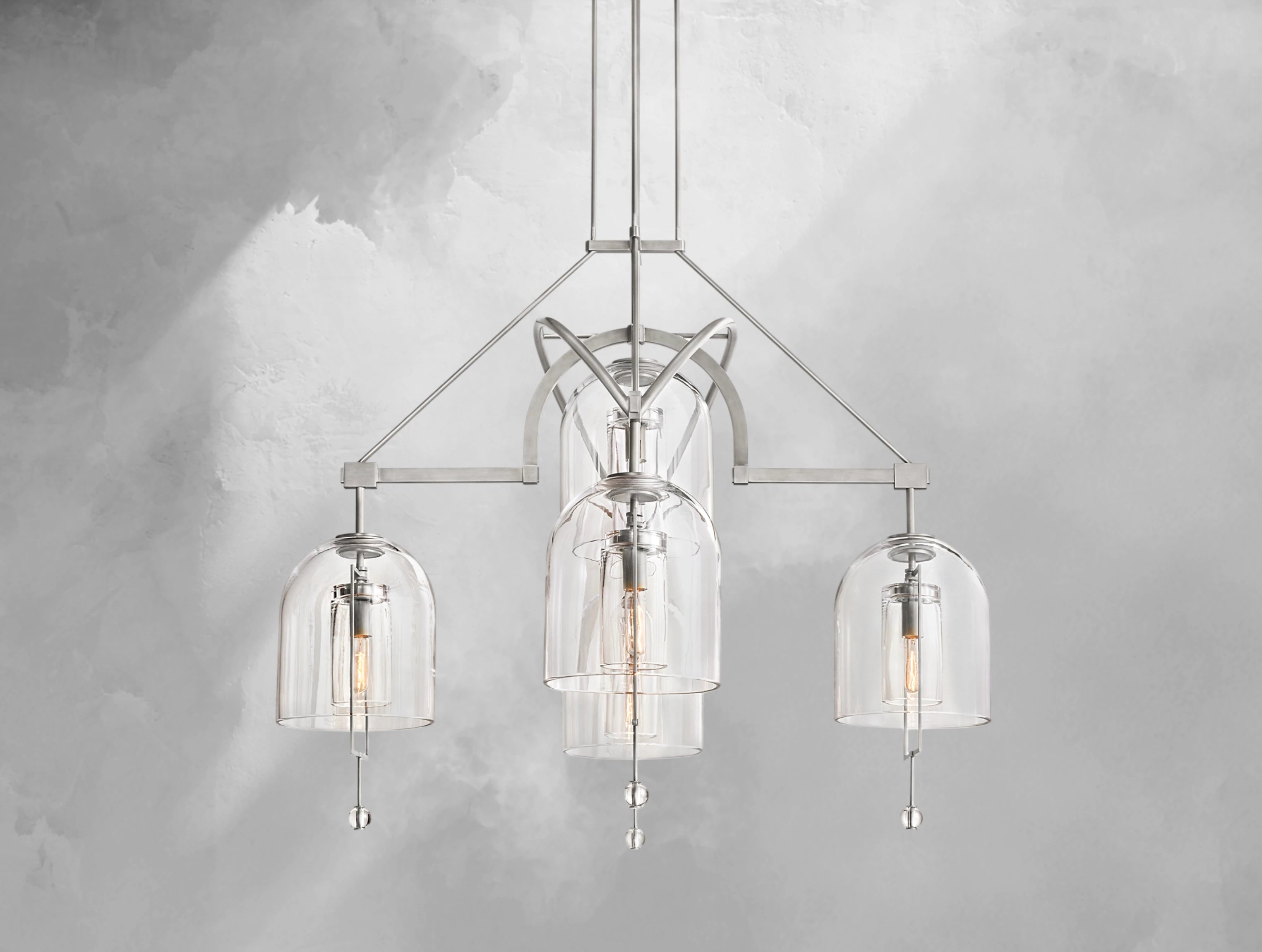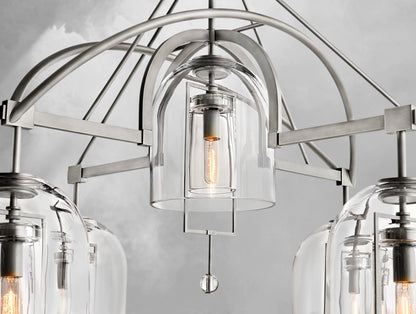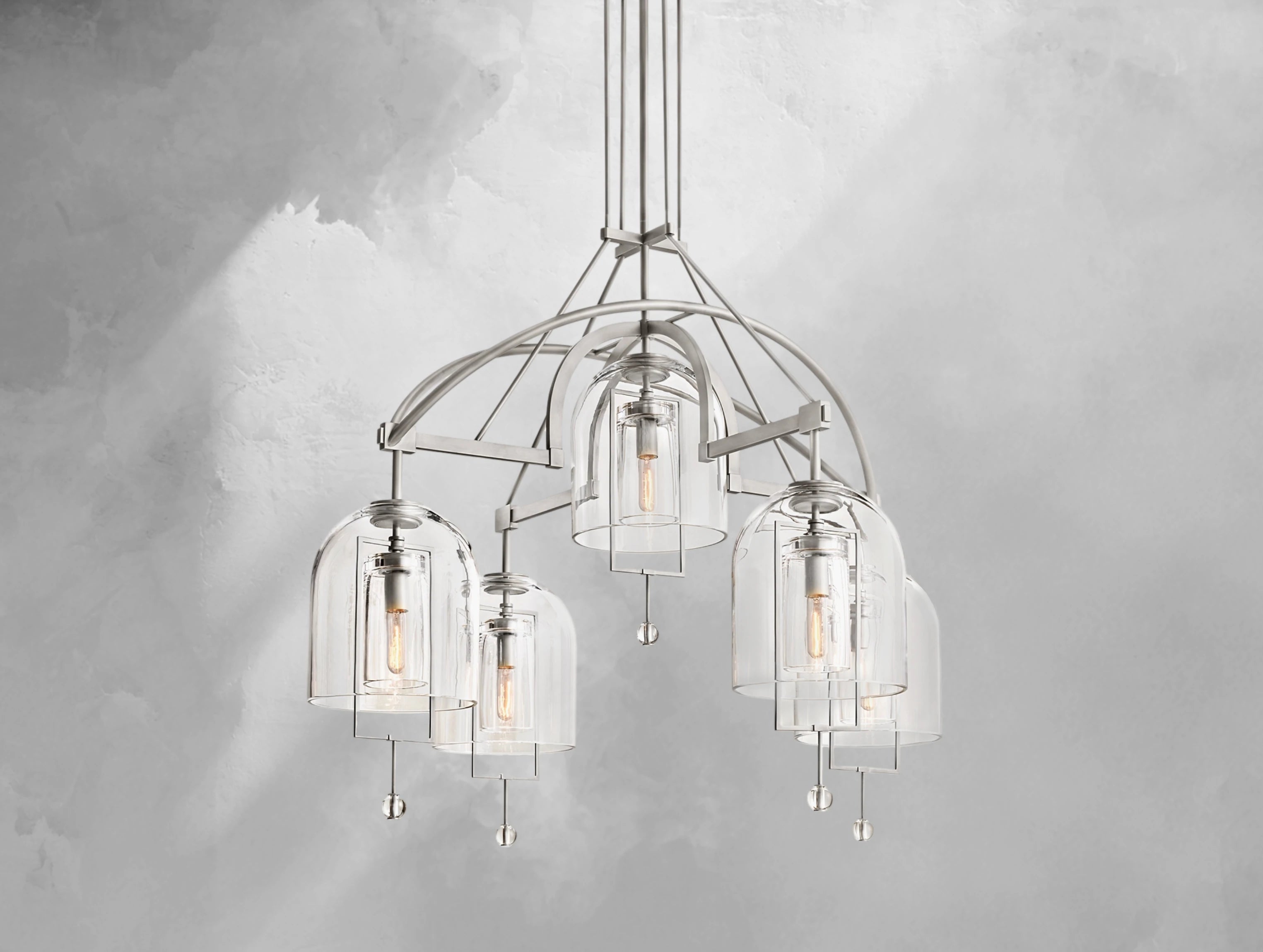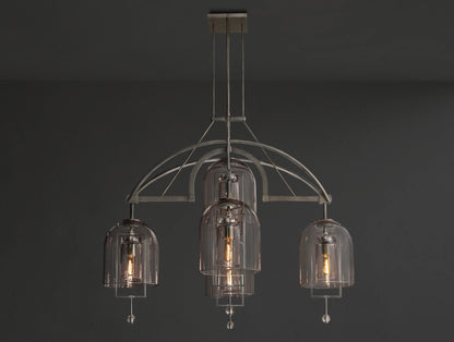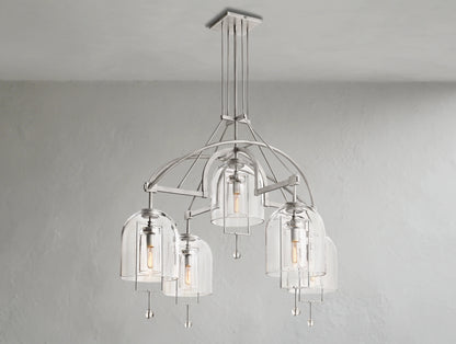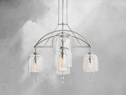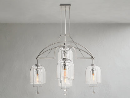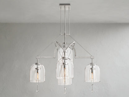 The Pivot Round Chandelier merges artistry and balance, featuring five thick, hand-blown glass shades suspended from a solid brass frame. Each glass form, with subtle air bubbles or slight asymmetry, reflects the artisan’s touch and one-of-a-kind character. Blurring the line between sculpture and light, this chandelier is both radiant and symbolic.