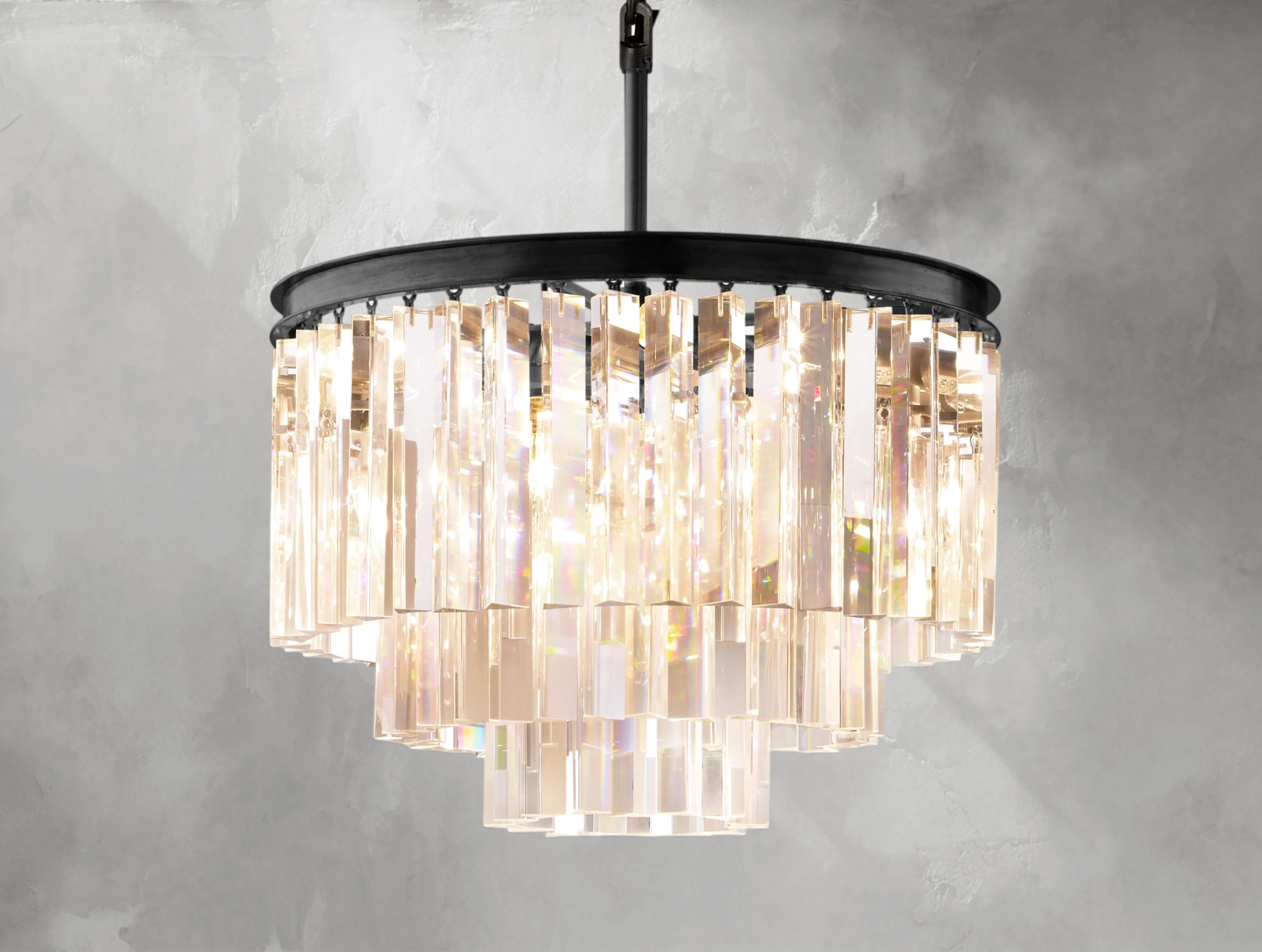 Inspired by the Art Deco glamour of 1920s Paris, this chandelier celebrates geometric form and luminous brilliance. Hundreds of faceted K9 glass prisms hang like fringe from a multi-ring iron frame, refracting light with dramatic sparkle. Combining industrial strength with timeless elegance, it makes a stunning centerpiece for dining rooms, living spaces, or grand entryways.