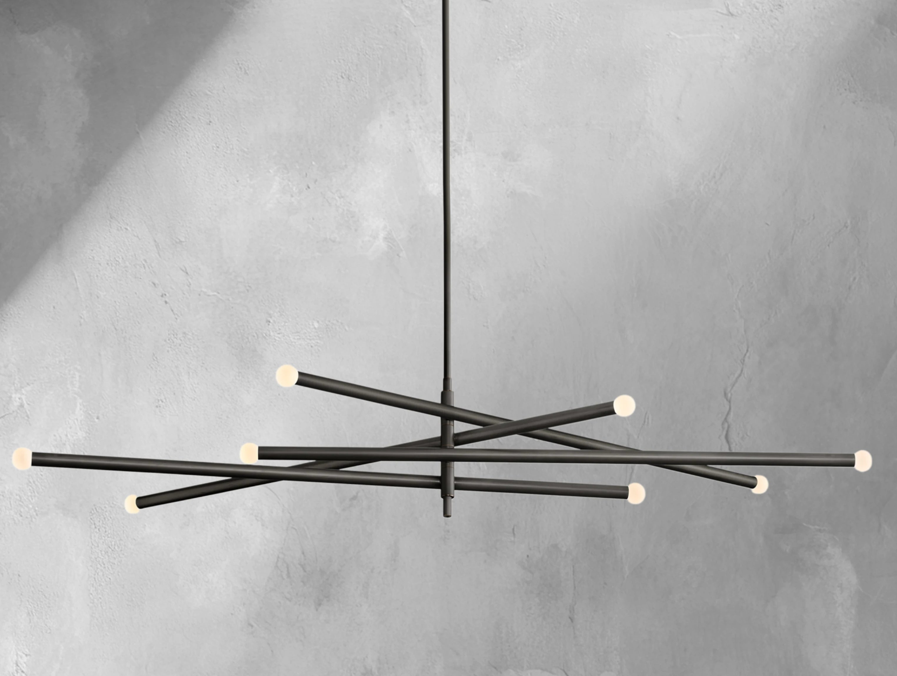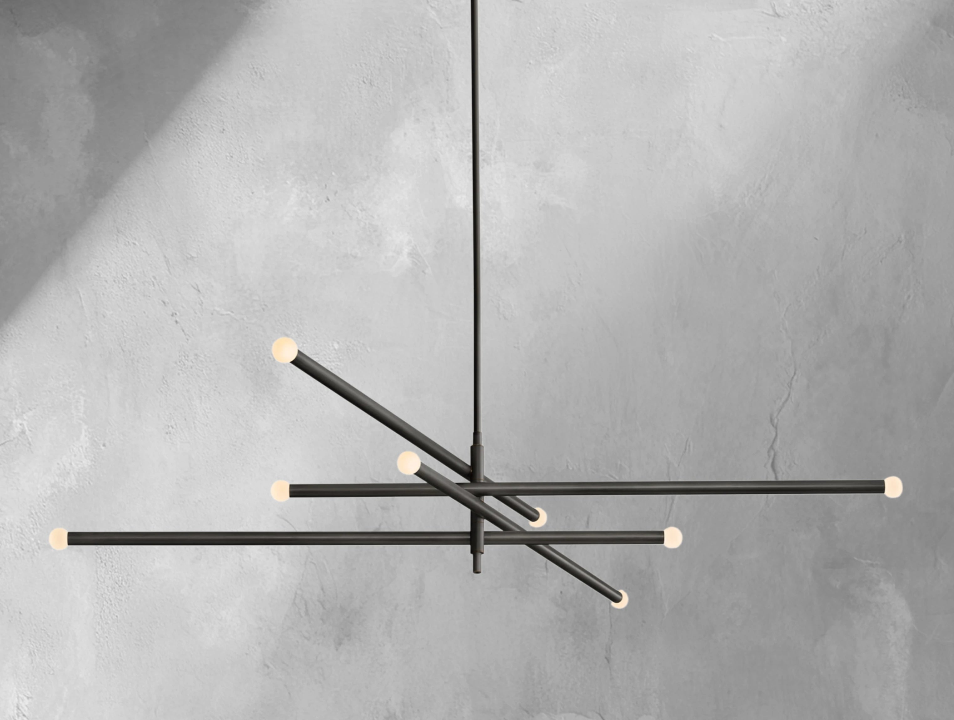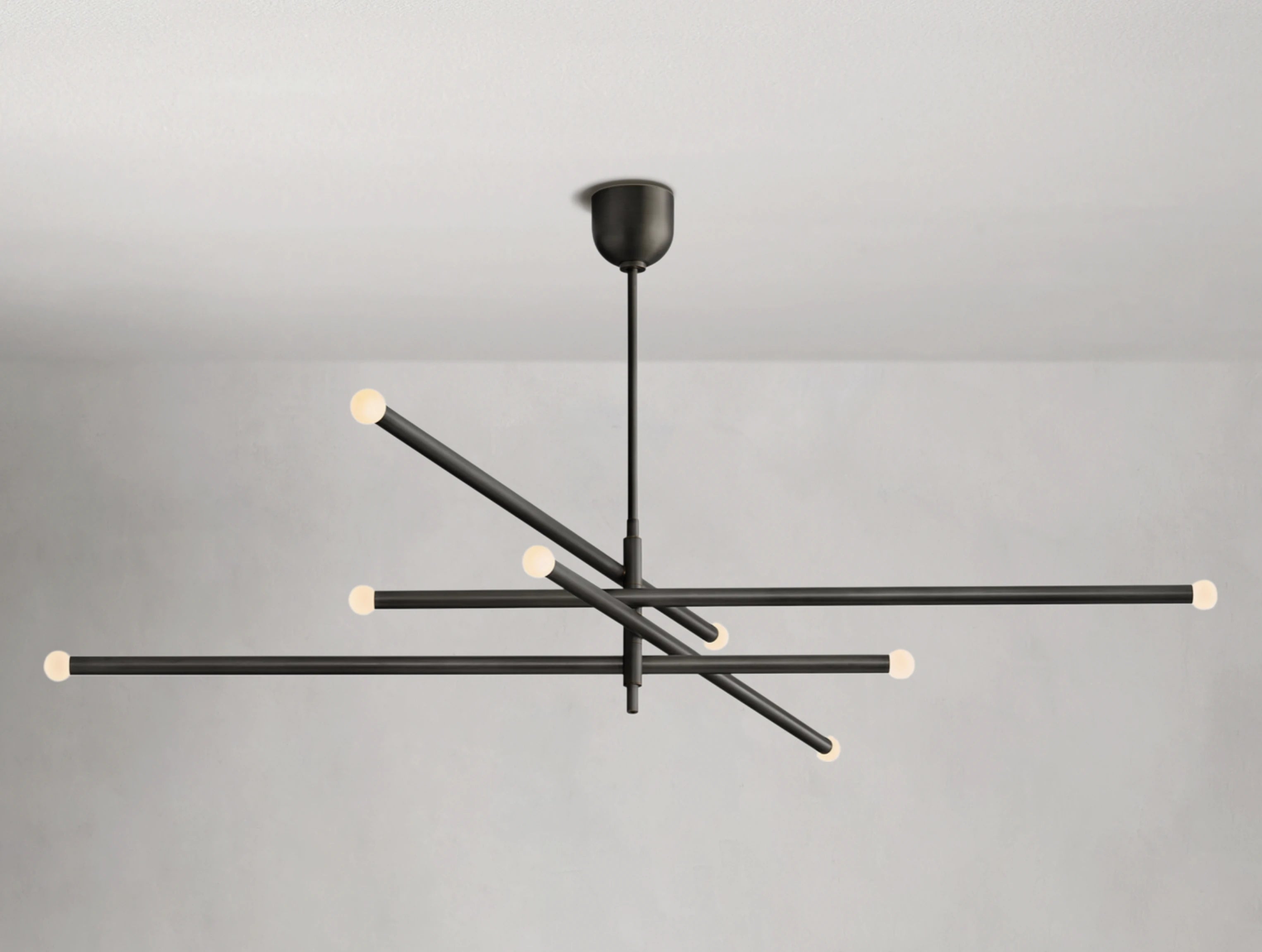 Inspired by minimalist midcentury Italian design, this chandelier reimagines reductionist form in a refined, contemporary silhouette. Each end of its slender brass arms holds an etched glass shade with an integrated LED bulb, diffusing a soft, warm glow when illuminated. A harmonious blend of precision craftsmanship and sculptural elegance, this fixture enhances modern interiors with effortless sophistication.