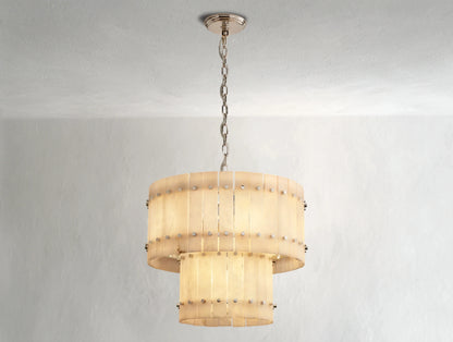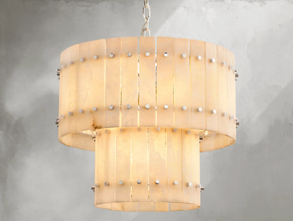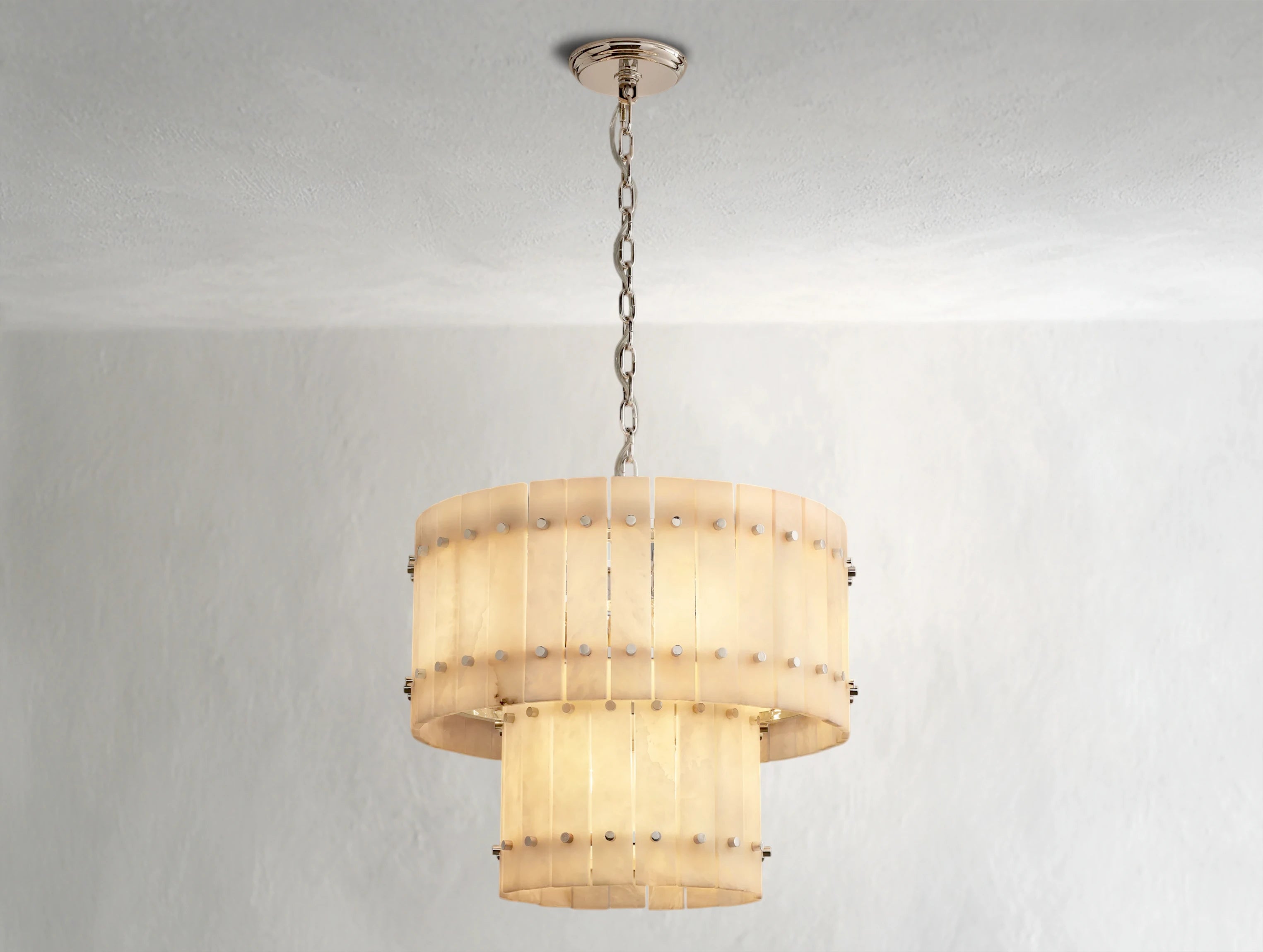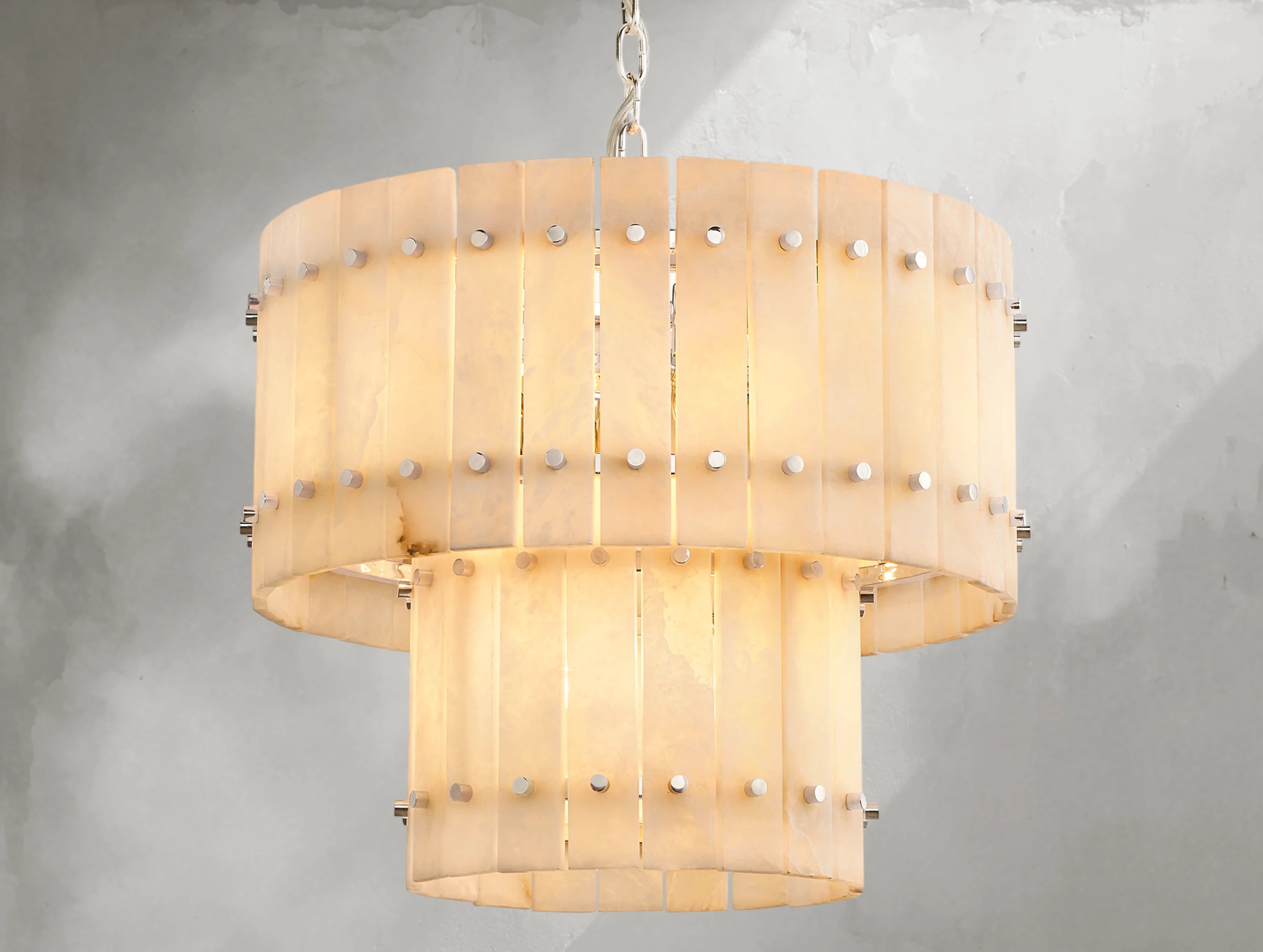 The Royce alabaster round tiered chandelier recalls the elegance of 1960s Italian lighting with its sculptural form and radiant glow. Dozens of translucent alabaster panels are hand-set into a sleek steel frame, creating depth, drama, and a softly diffused light. Available in 22", 37", 48", and 60", this tiered silhouette makes a bold statement in dining rooms, entryways, and great rooms.
