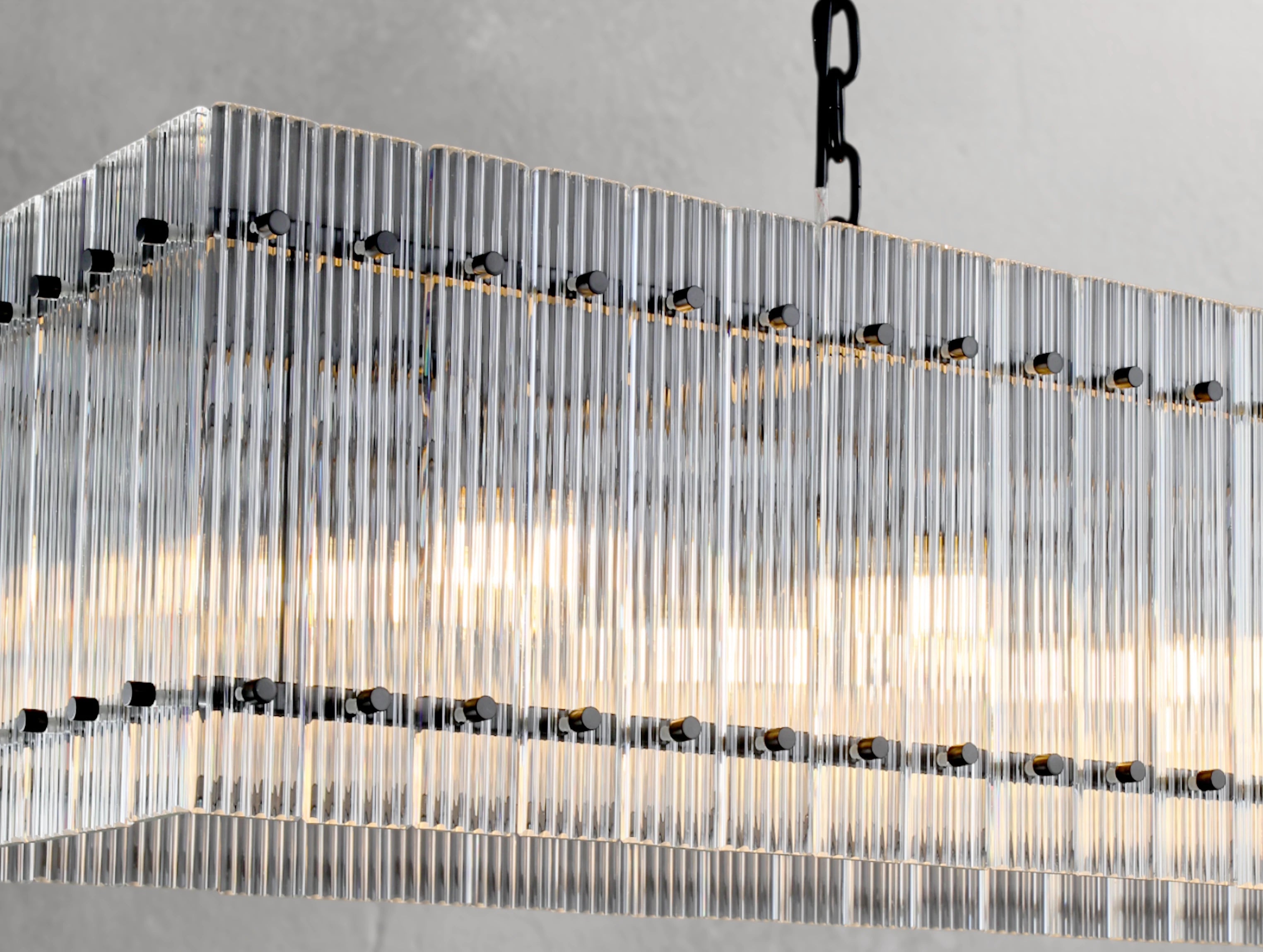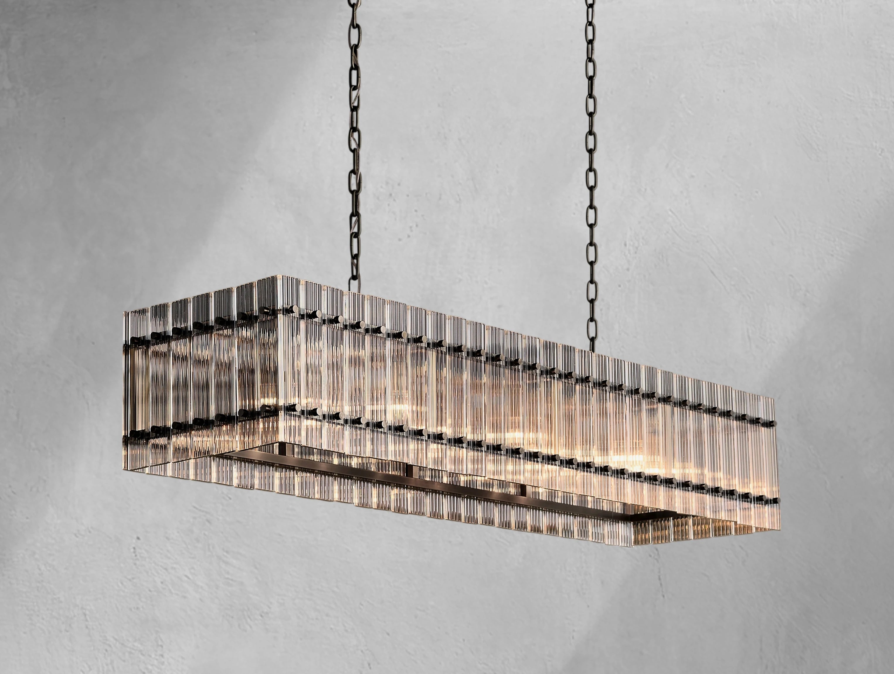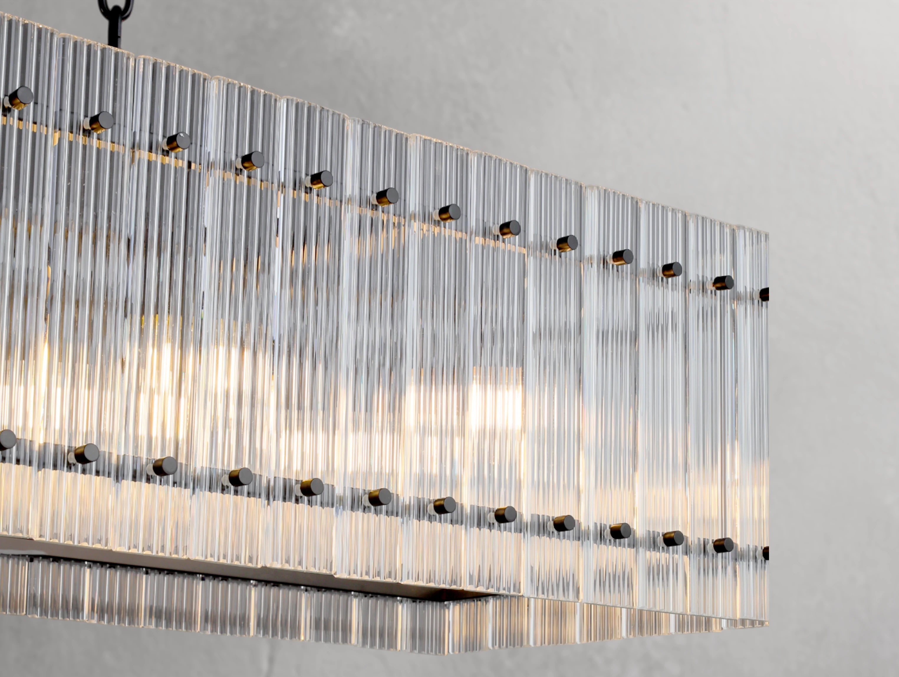 The Royce rectangular chandelier brings the glamour of 1960s Italian glass lighting into modern interiors. Hand-raked fluted glass panels are meticulously set within a sleek steel frame, creating dynamic reflections and a softly diffused glow. Available in 54" and 72", this elongated silhouette is ideal for dining tables, kitchen islands, and large entertaining spaces.