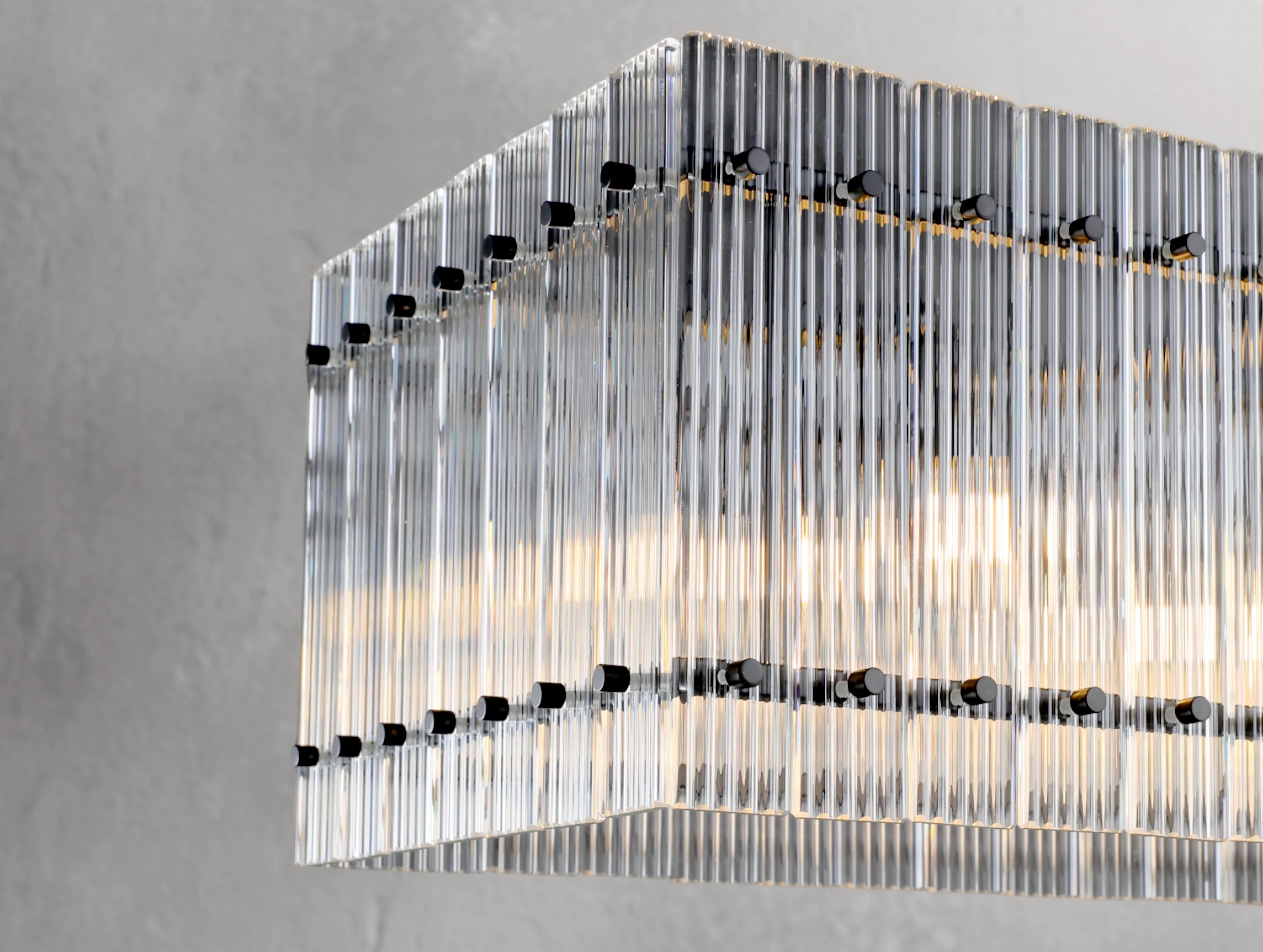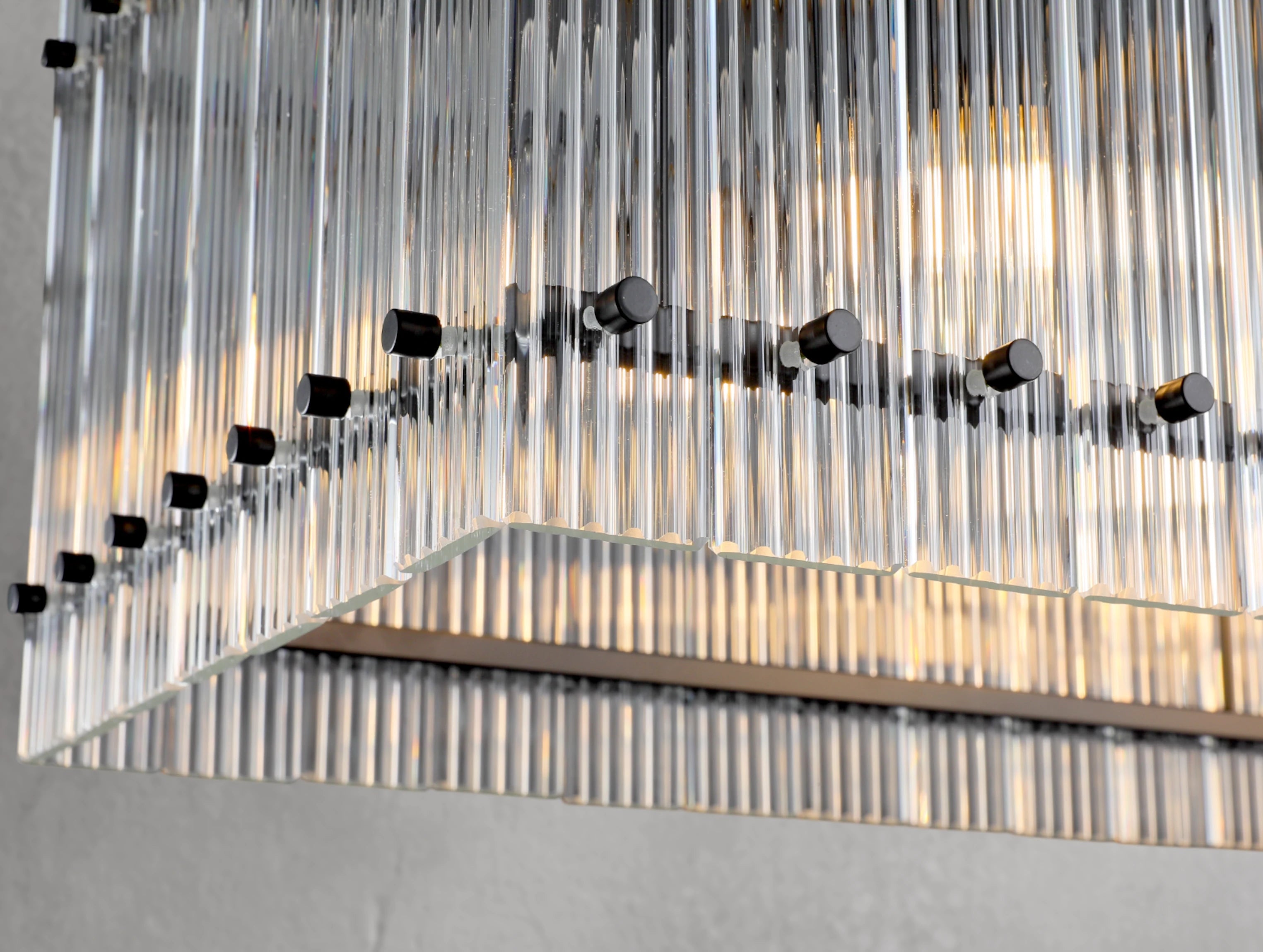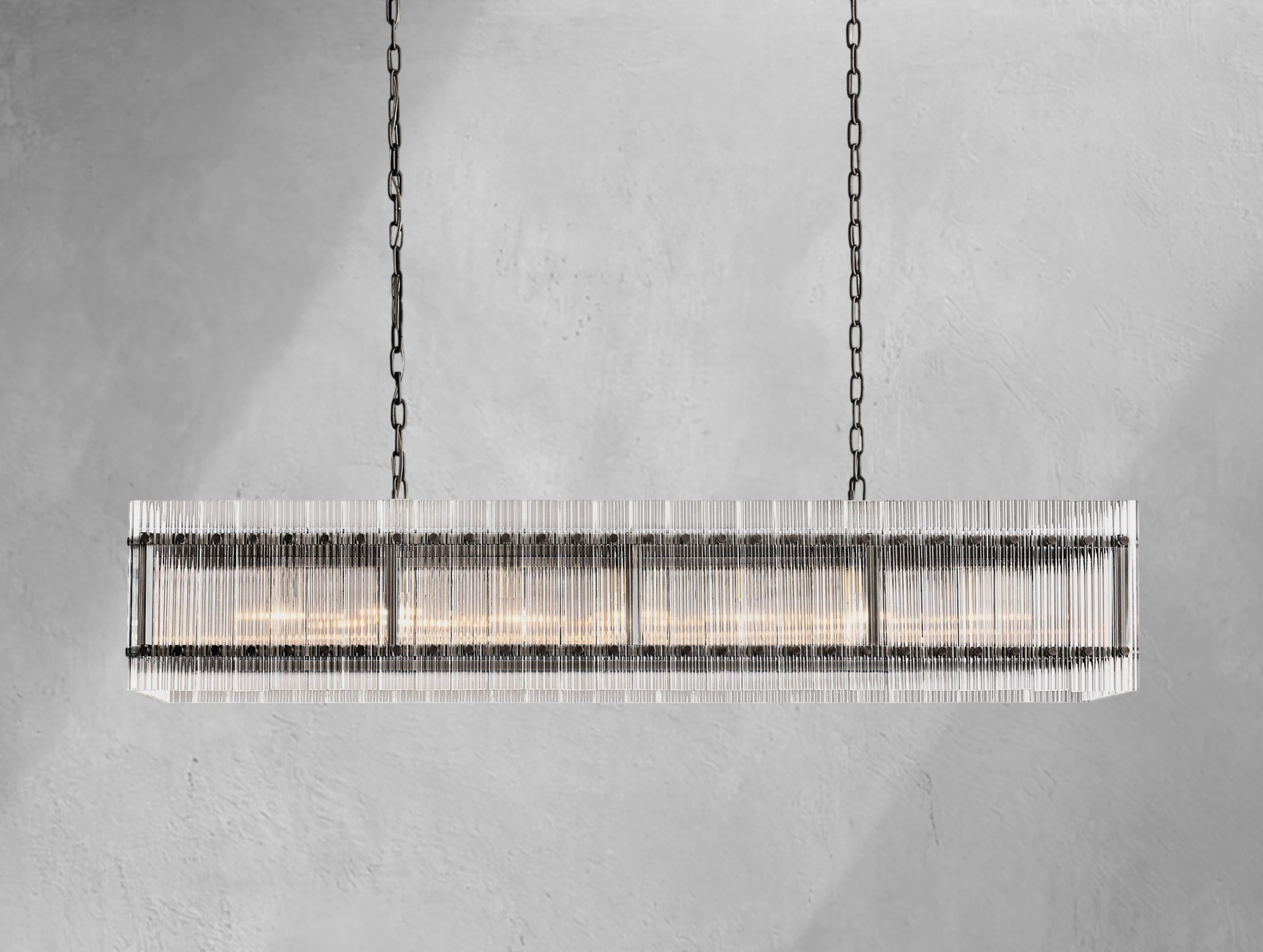 The Royce rectangular chandelier brings the glamour of 1960s Italian glass lighting into modern interiors. Hand-raked fluted glass panels are meticulously set within a sleek steel frame, creating dynamic reflections and a softly diffused glow. Available in 54" and 72", this elongated silhouette is ideal for dining tables, kitchen islands, and large entertaining spaces.