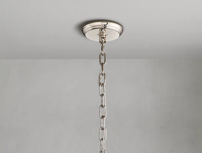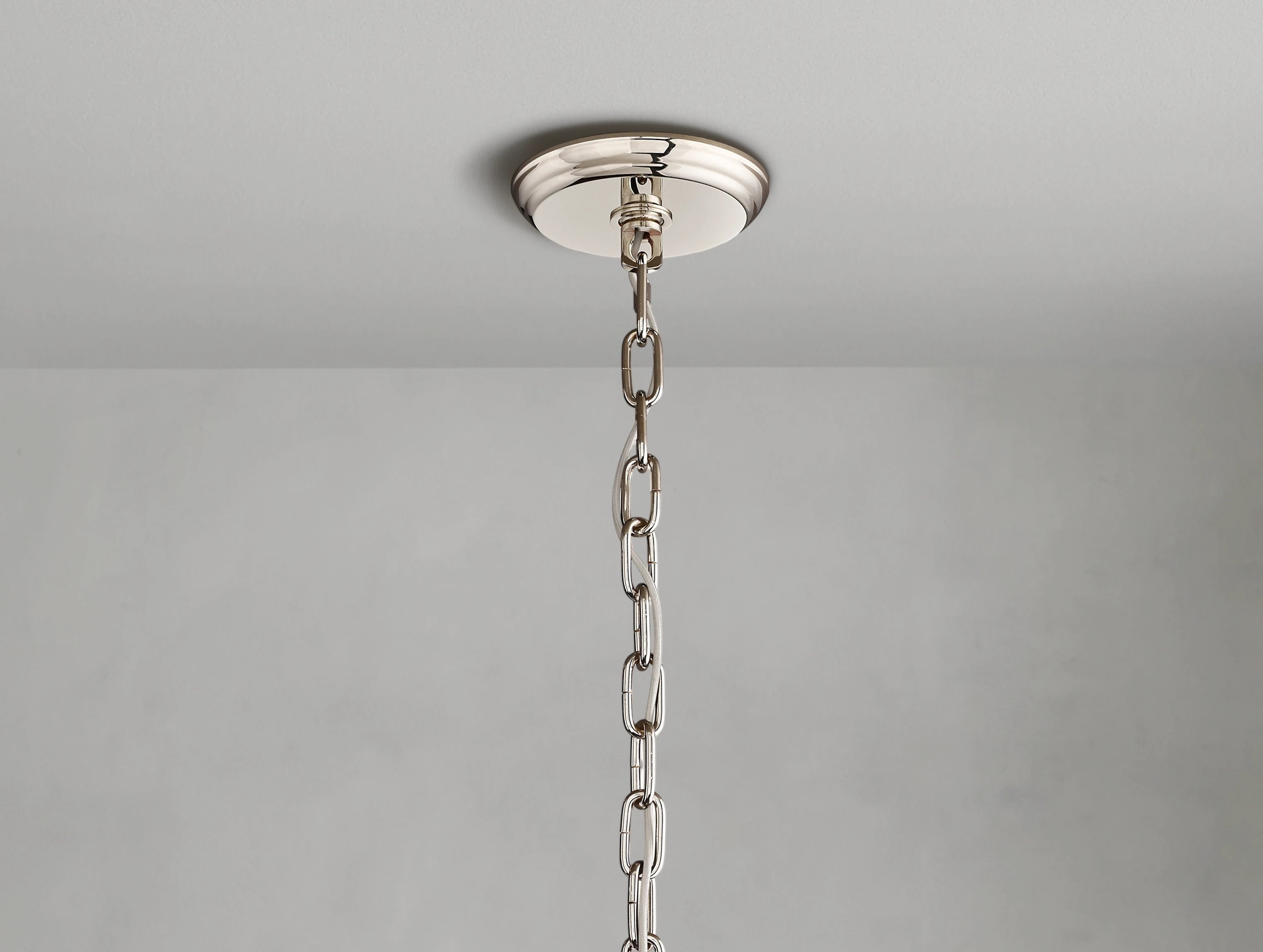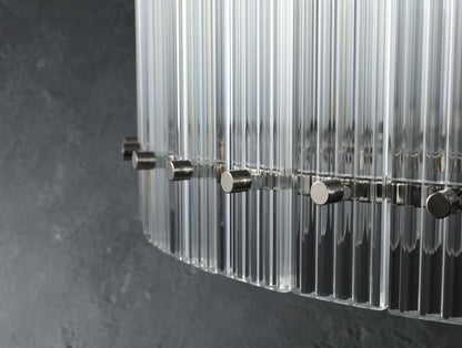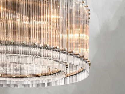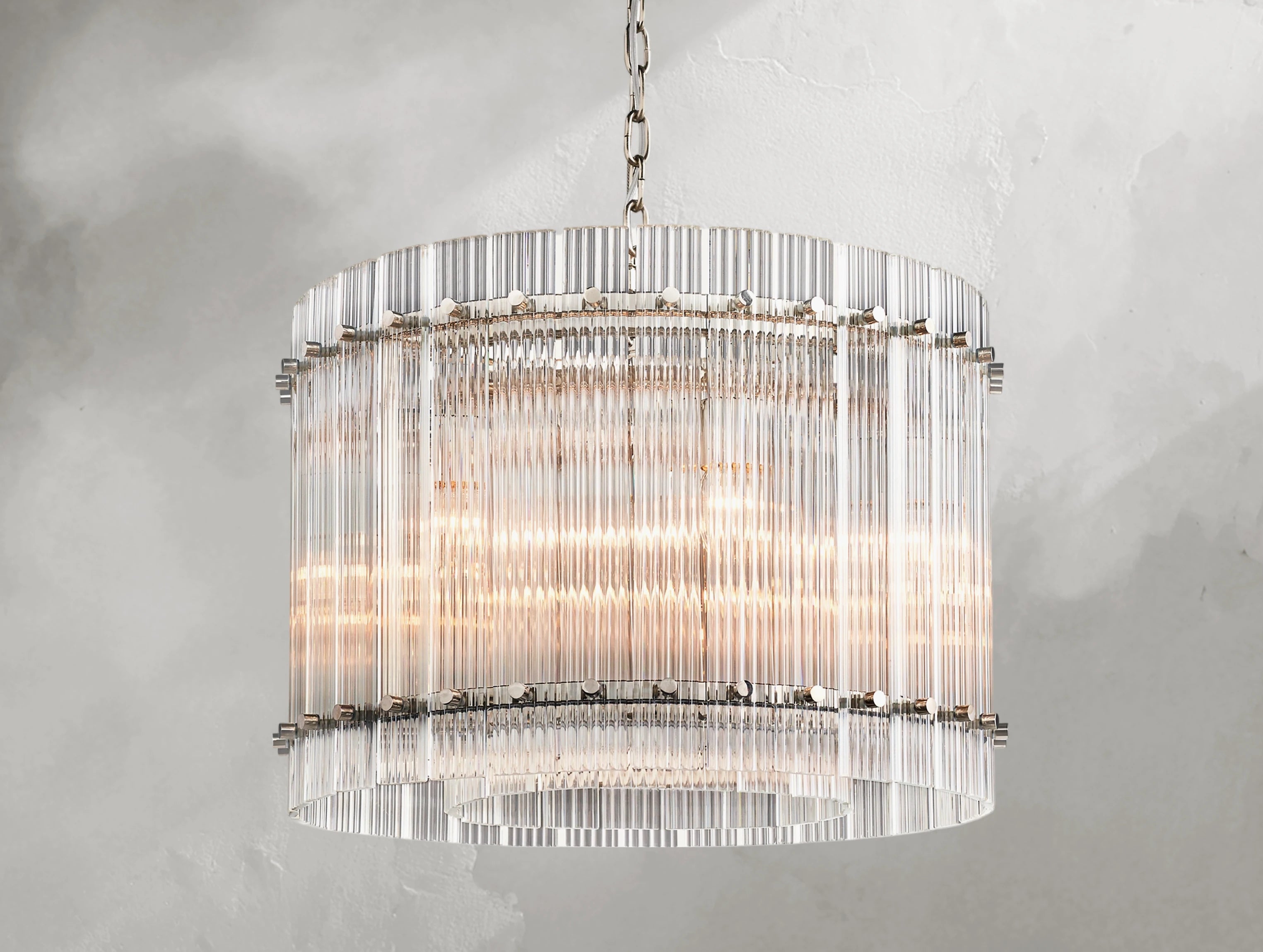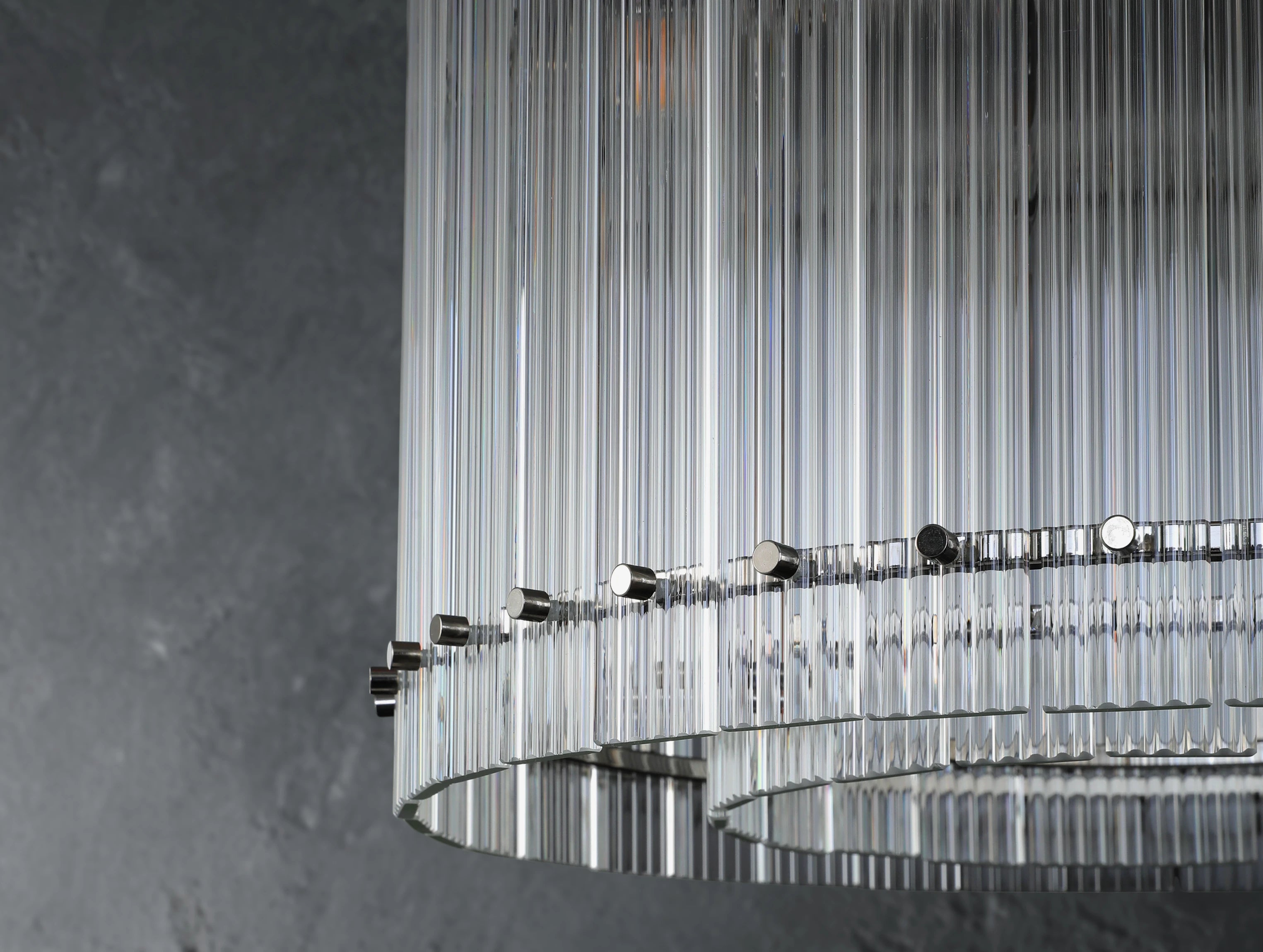 The Royce round chandelier recalls the glamour of 1960s Italian glass lighting, designed with dramatic presence and soft radiance. Each fixture is crafted with dozens of hand-raked fluted glass panels, set within a sleek steel frame to create a play of light and refined texture. Available in multiple sizes, it delivers timeless elegance to dining rooms, living spaces, and grand entryways.