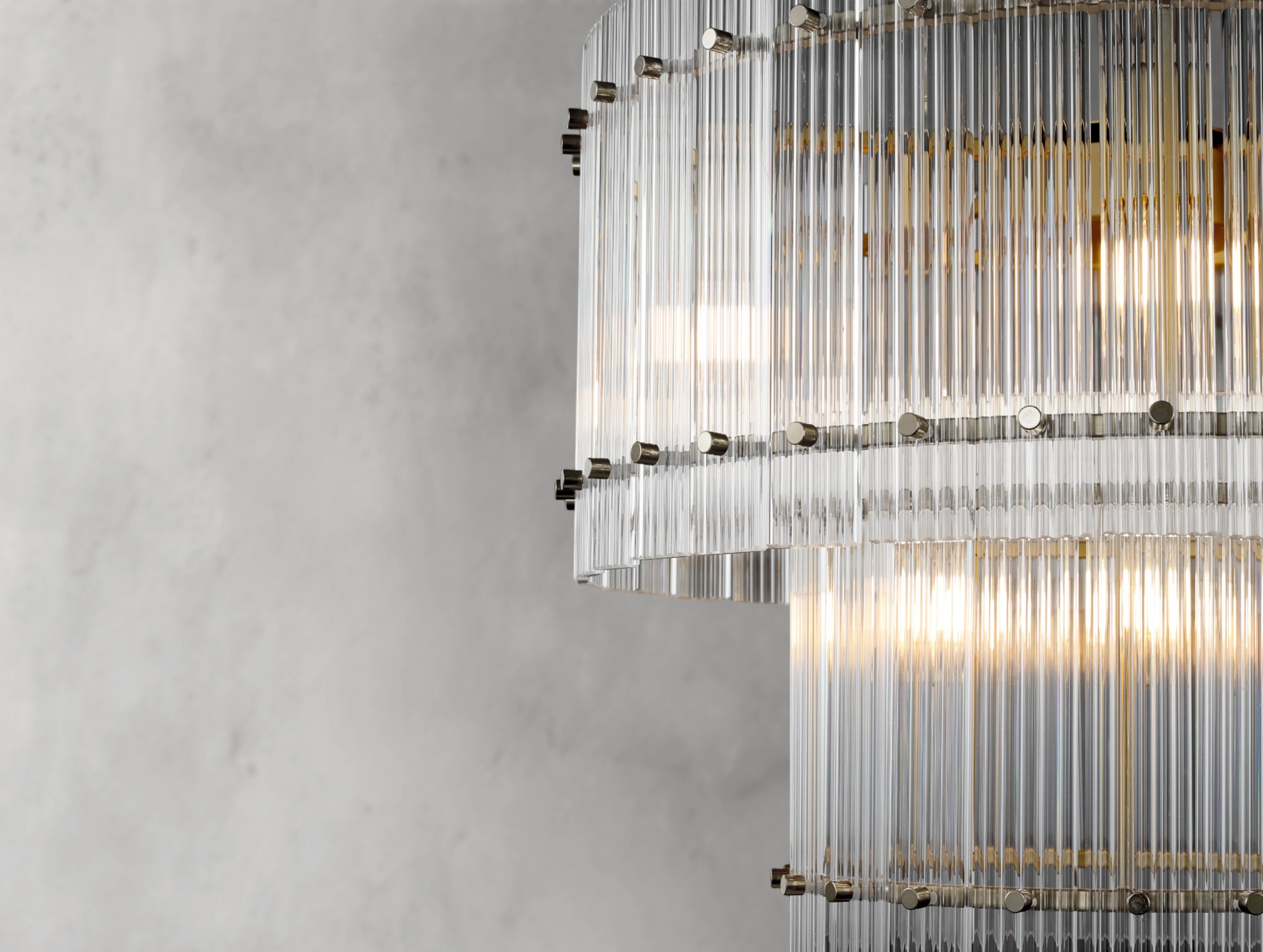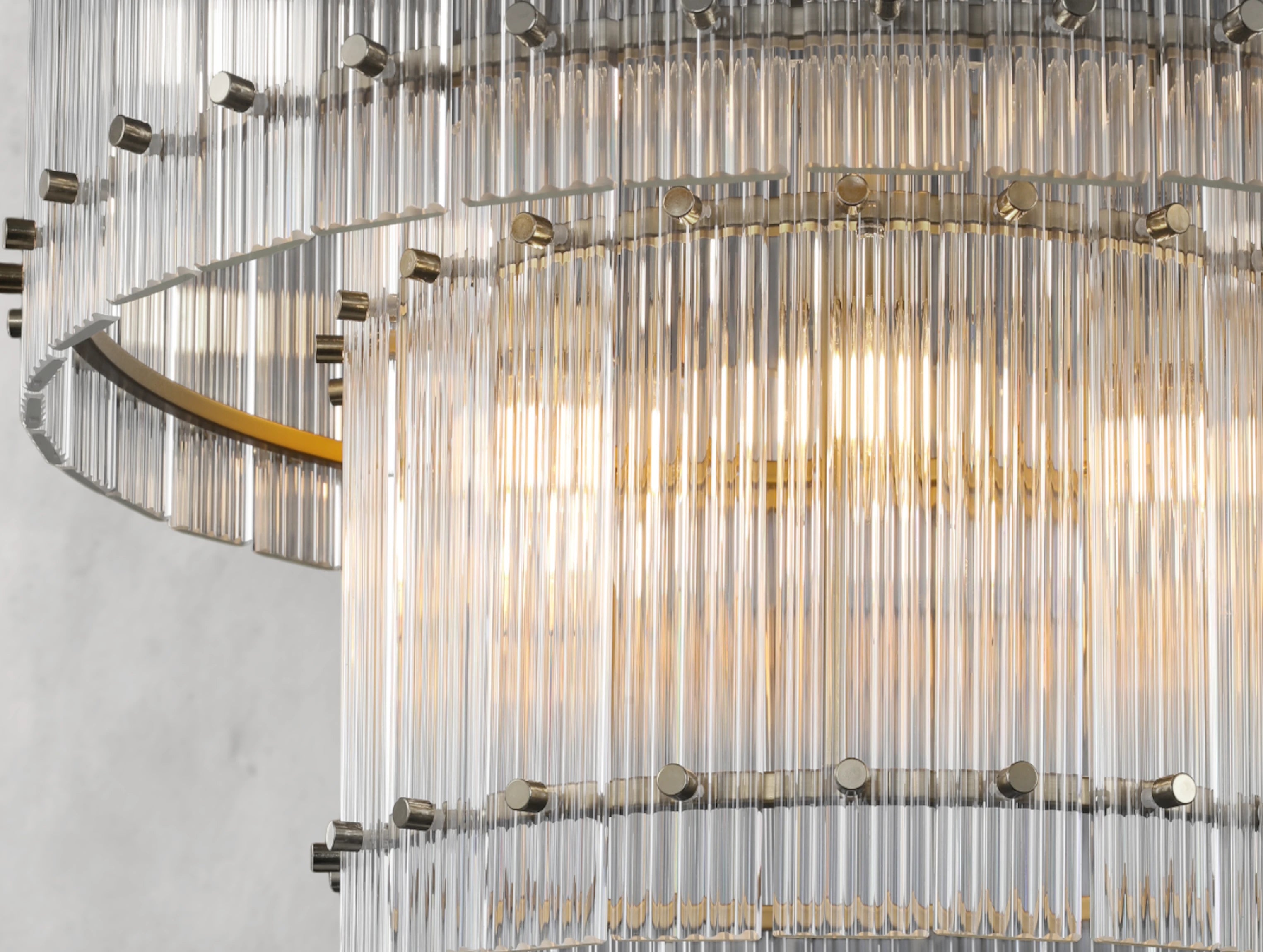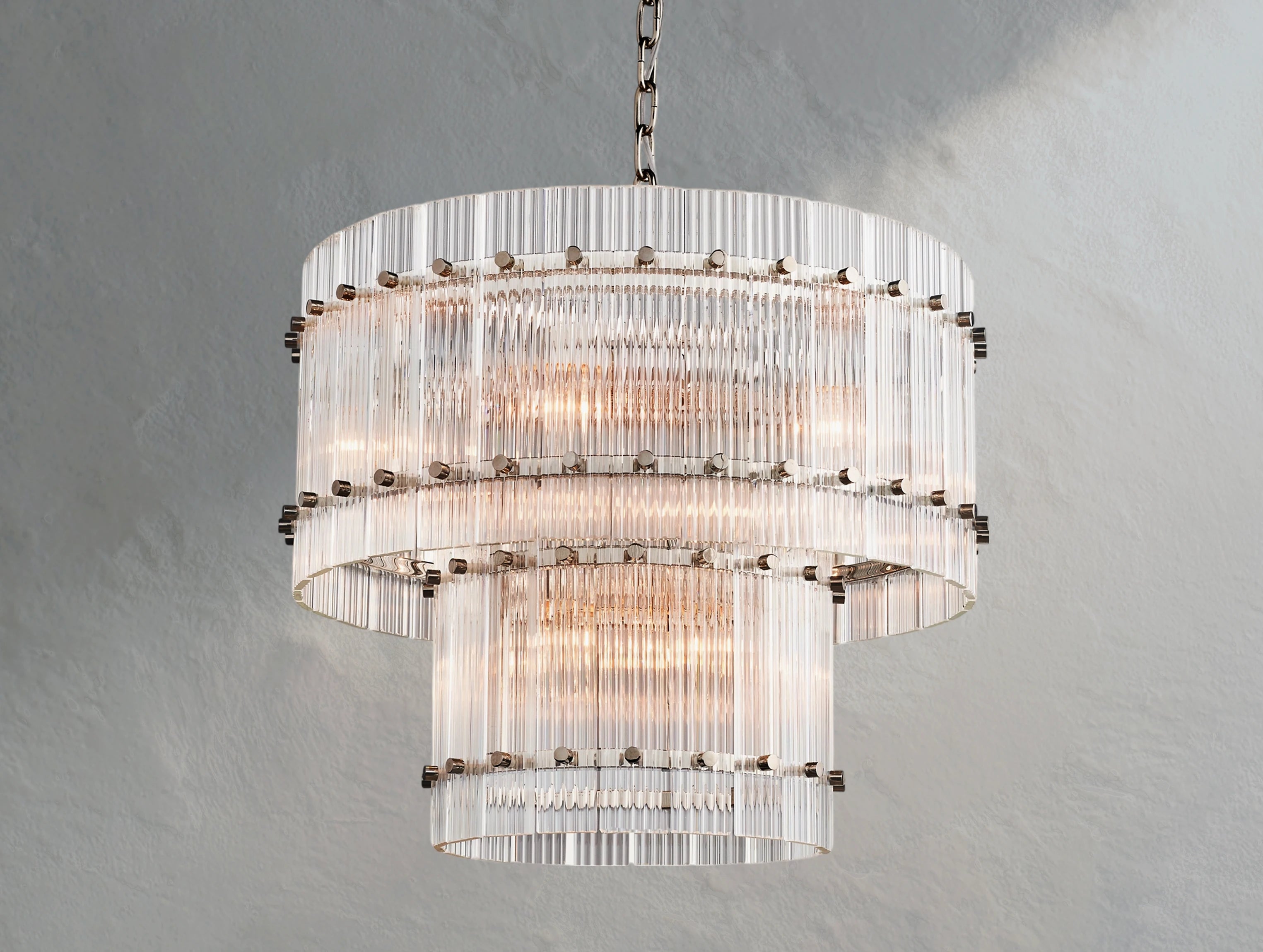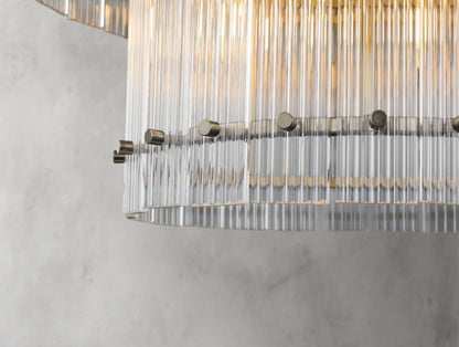 The Royce two-tier round chandelier channels the glamour of 1960s Italian glass lighting in a grand, sculptural form. Dozens of hand-raked fluted glass panels are set within a sleek steel frame, creating dramatic light play and a softly diffused glow. Available in four sizes, this double-tiered design offers bold presence for dining rooms, living areas, or grand entryways.
