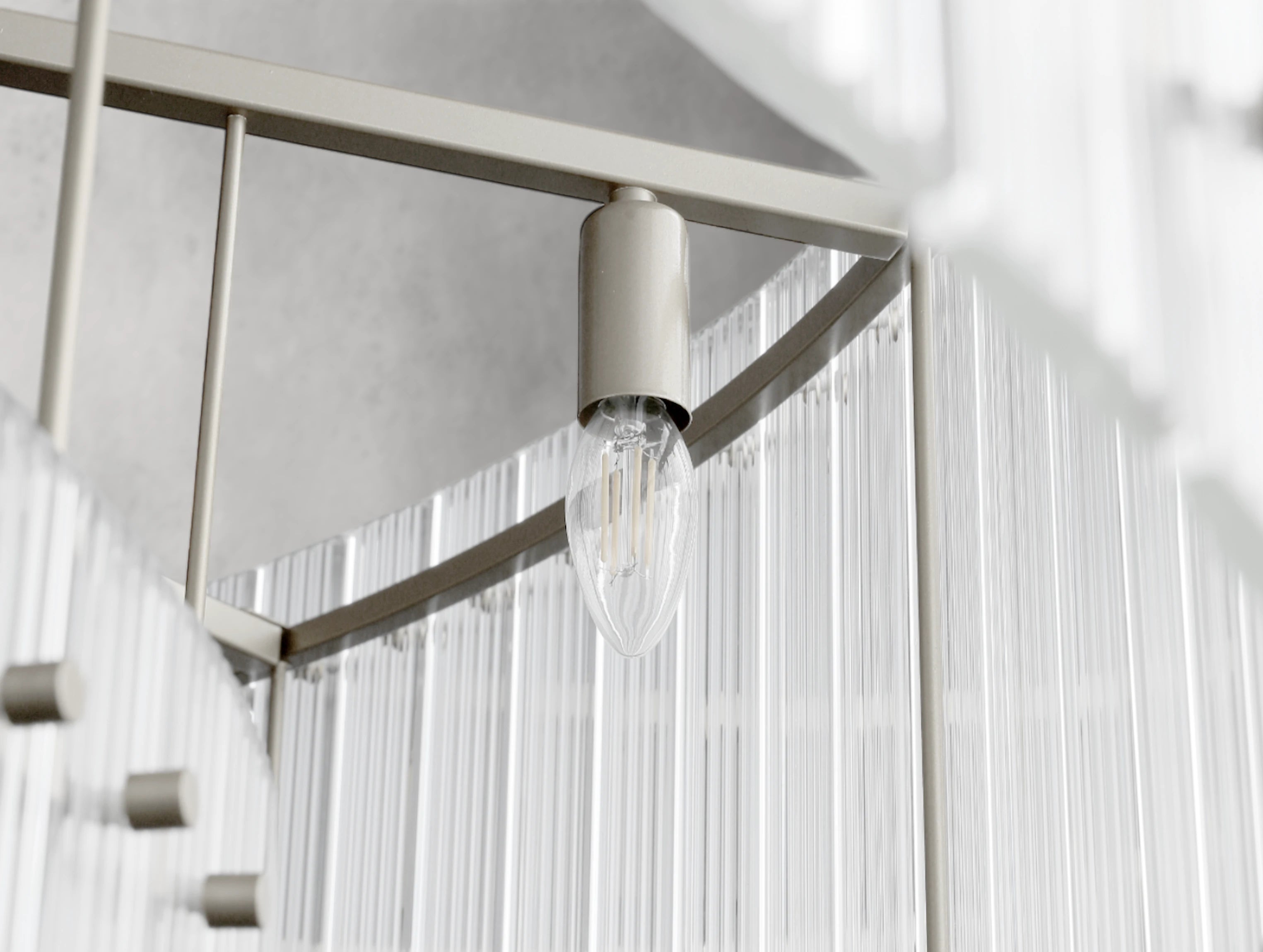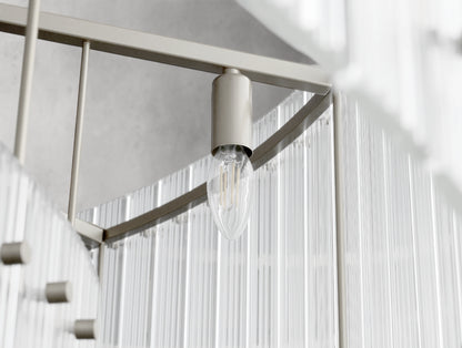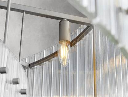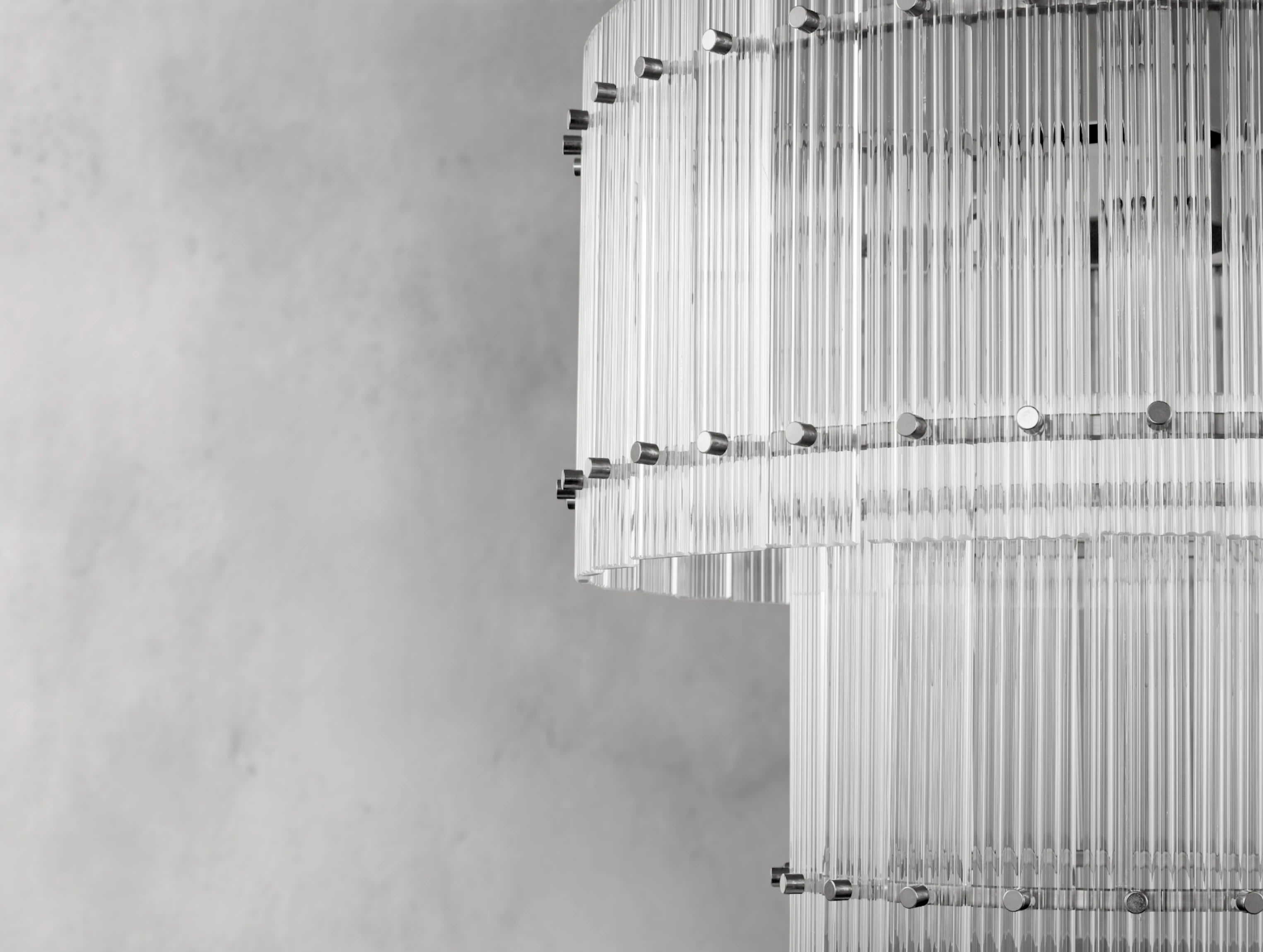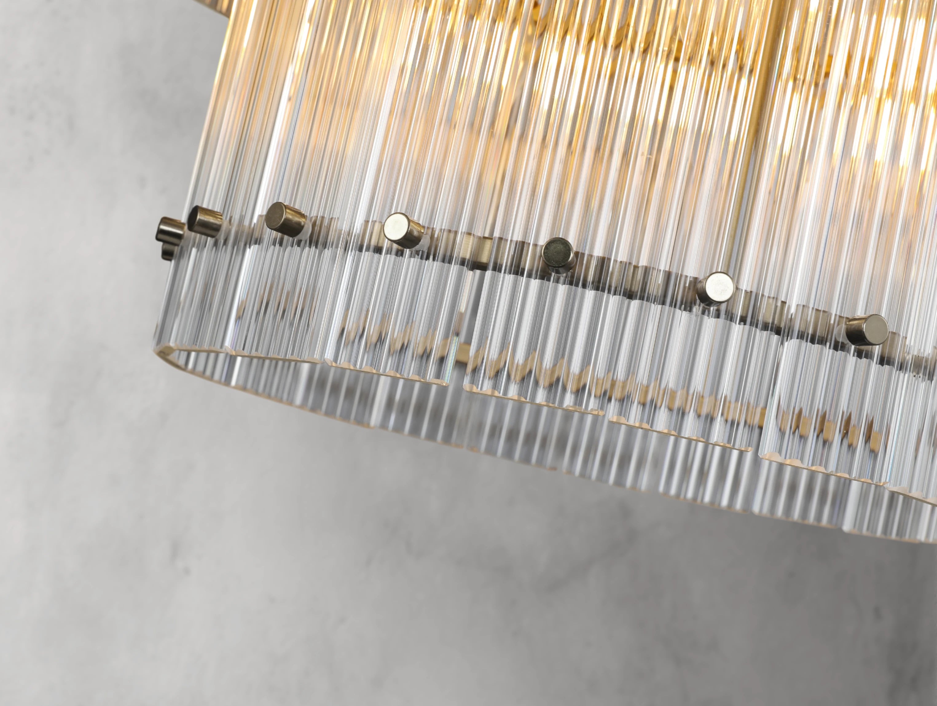 The Royce two-tier round chandelier channels the glamour of 1960s Italian glass lighting in a grand, sculptural form. Dozens of hand-raked fluted glass panels are set within a sleek steel frame, creating dramatic light play and a softly diffused glow. Available in four sizes, this double-tiered design offers bold presence for dining rooms, living areas, or grand entryways.