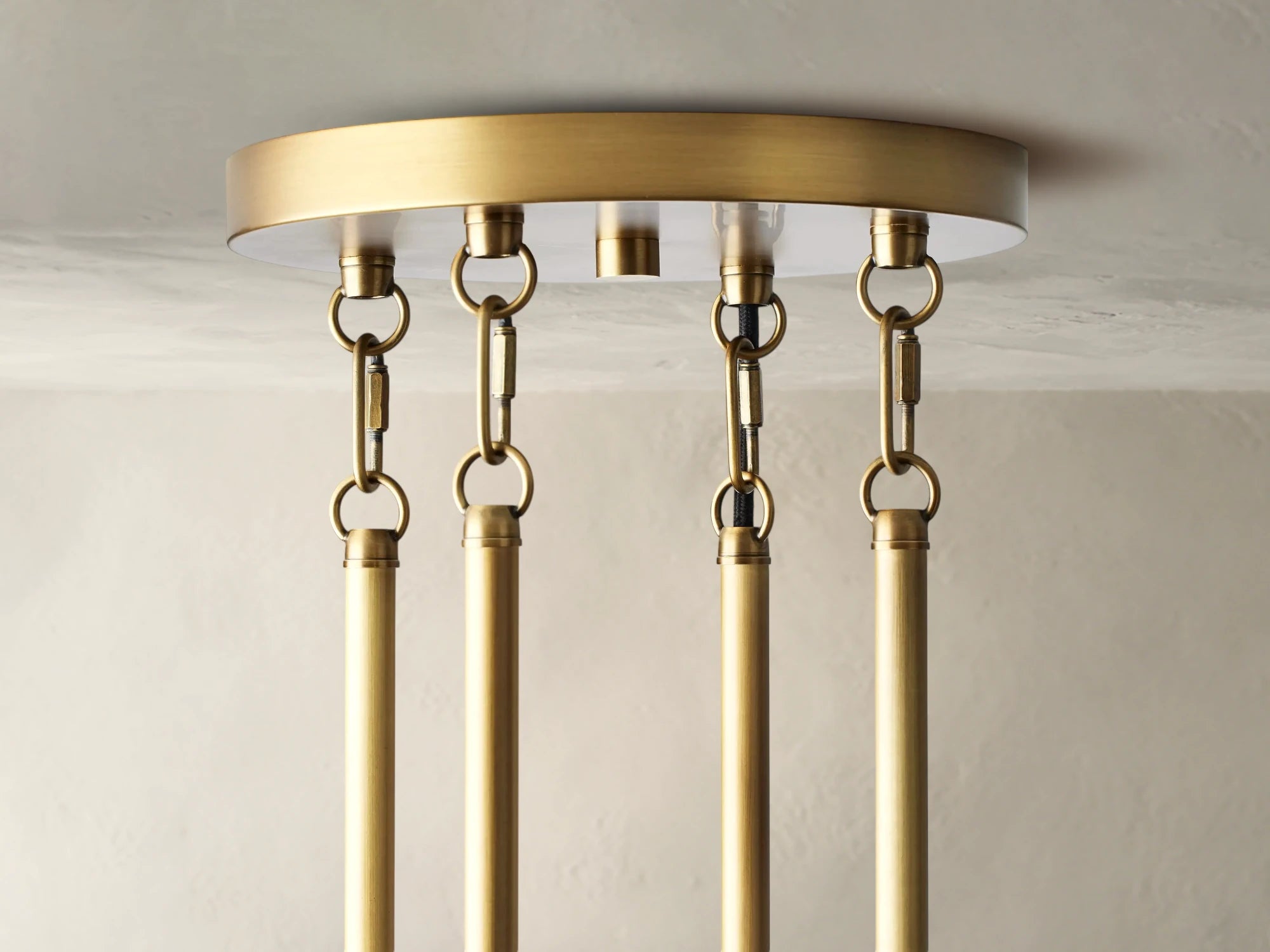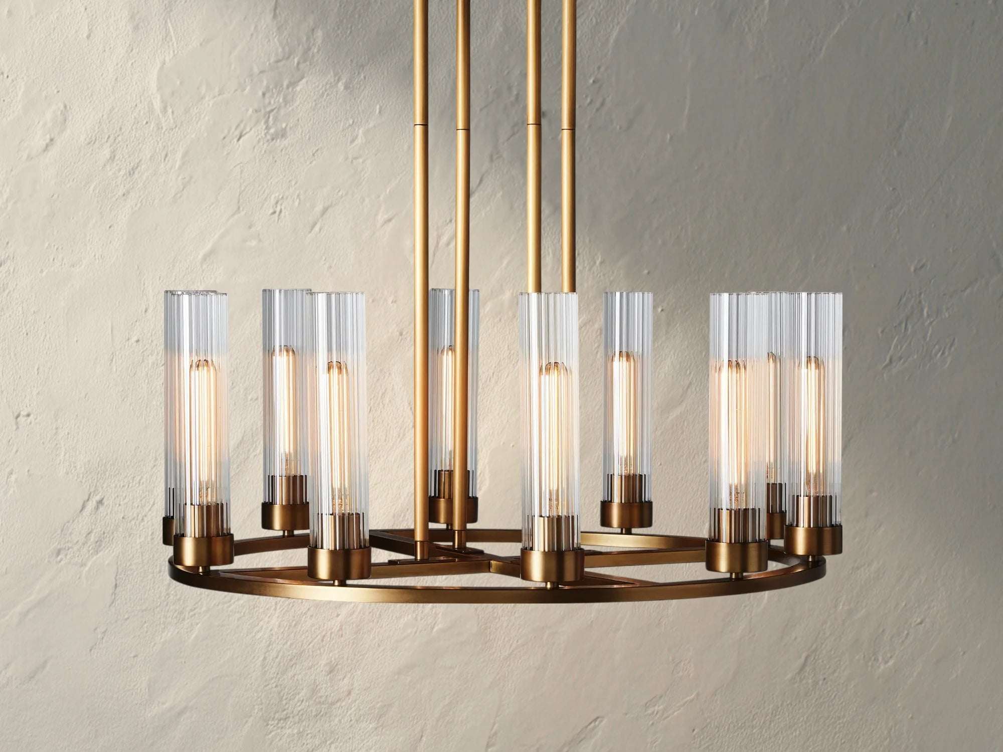 Timeless and dramatic, the Sarina Round Chandelier combines a vintage ring structure with modern precision. Its fluted glass shades cast a soft, radiant glow—perfect for dining rooms, foyers, or double-height spaces.
