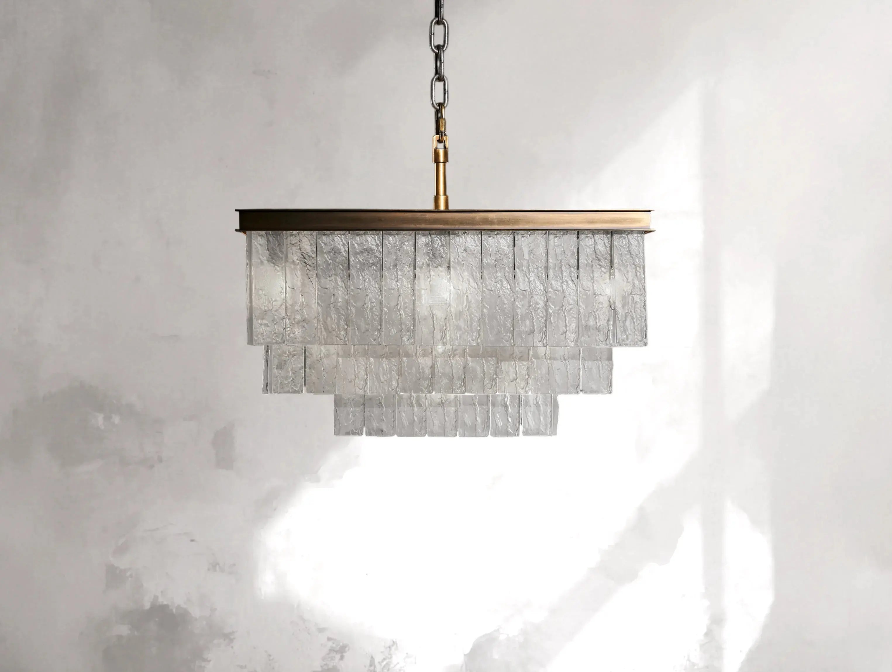 A refined interplay of geometry and texture, the Sylva Chandelier pairs bark-textured cast glass with a matte brass frame. Tiered in concentric rings, the design evokes Art Deco sophistication softened by natural inspiration—bringing quiet elegance to modern interiors.