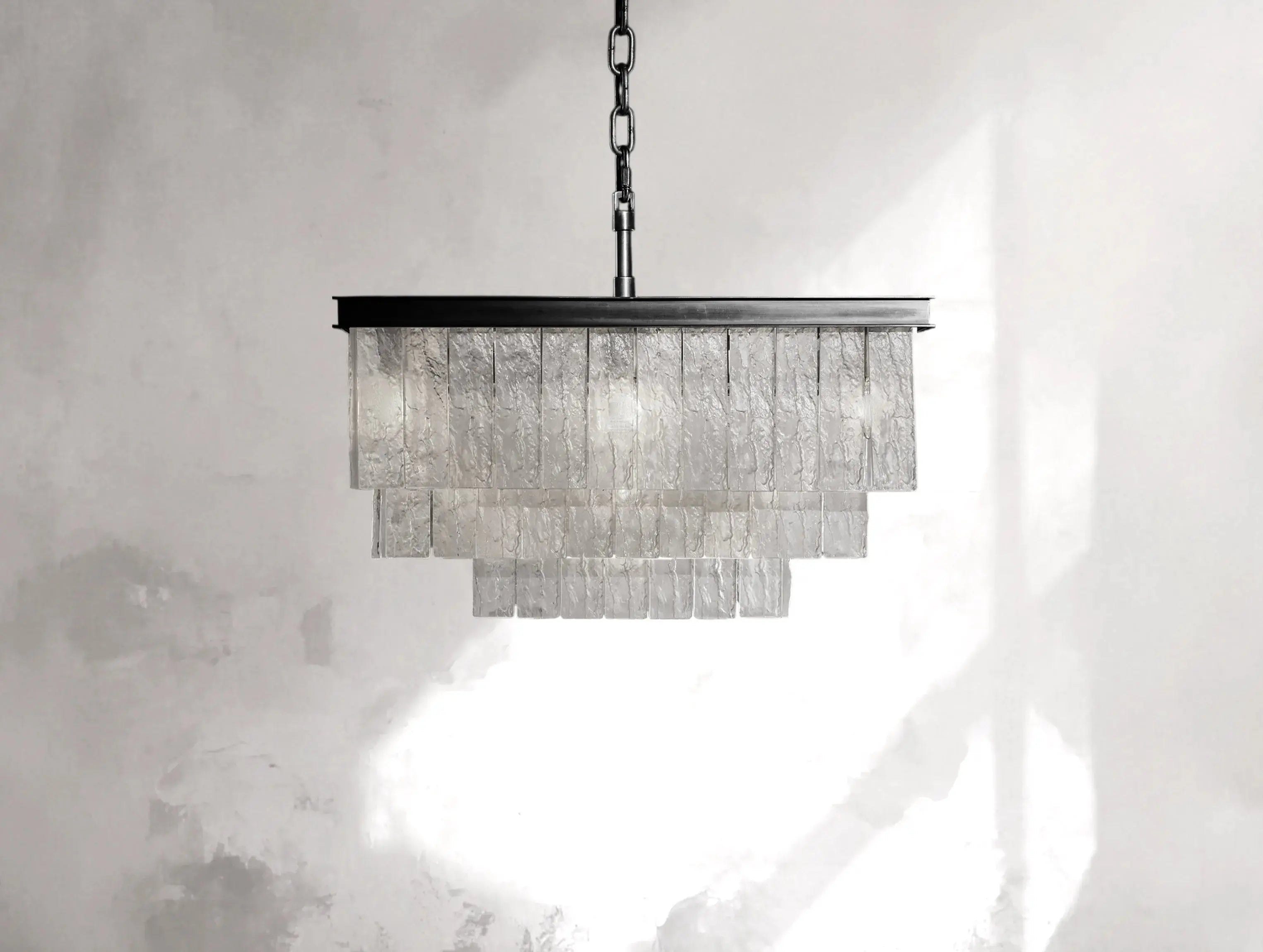 A refined interplay of geometry and texture, the Sylva Chandelier pairs bark-textured cast glass with a matte brass frame. Tiered in concentric rings, the design evokes Art Deco sophistication softened by natural inspiration—bringing quiet elegance to modern interiors.