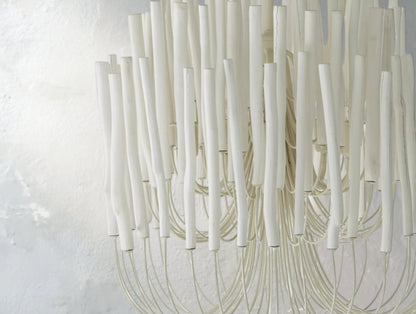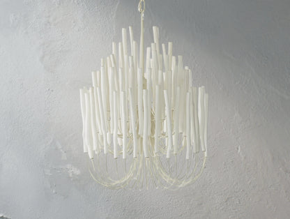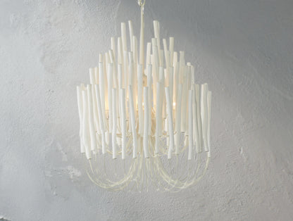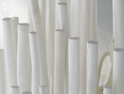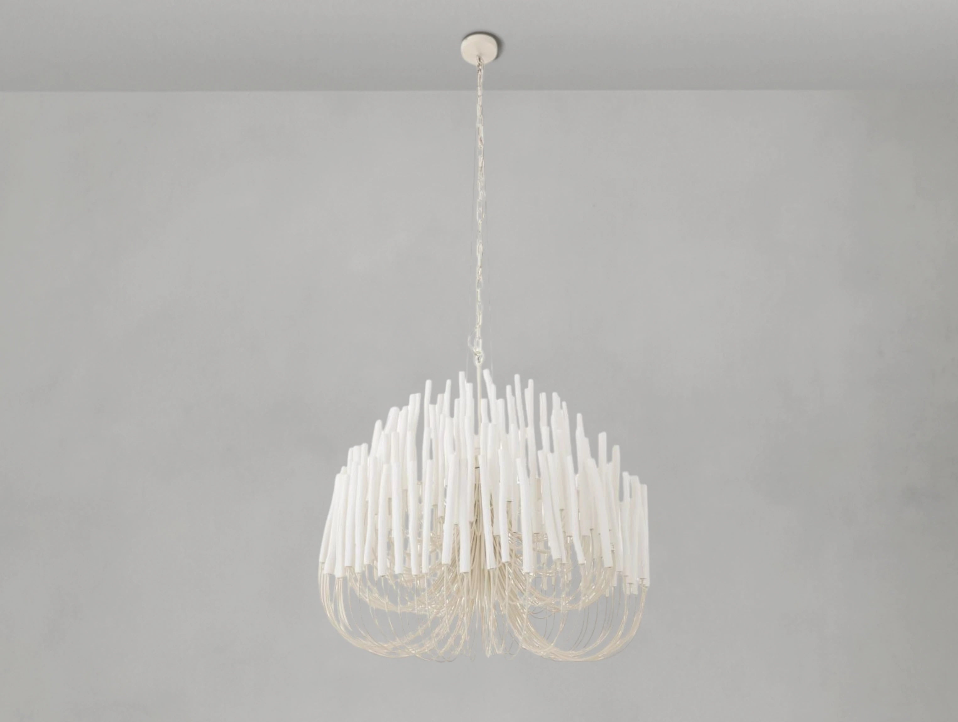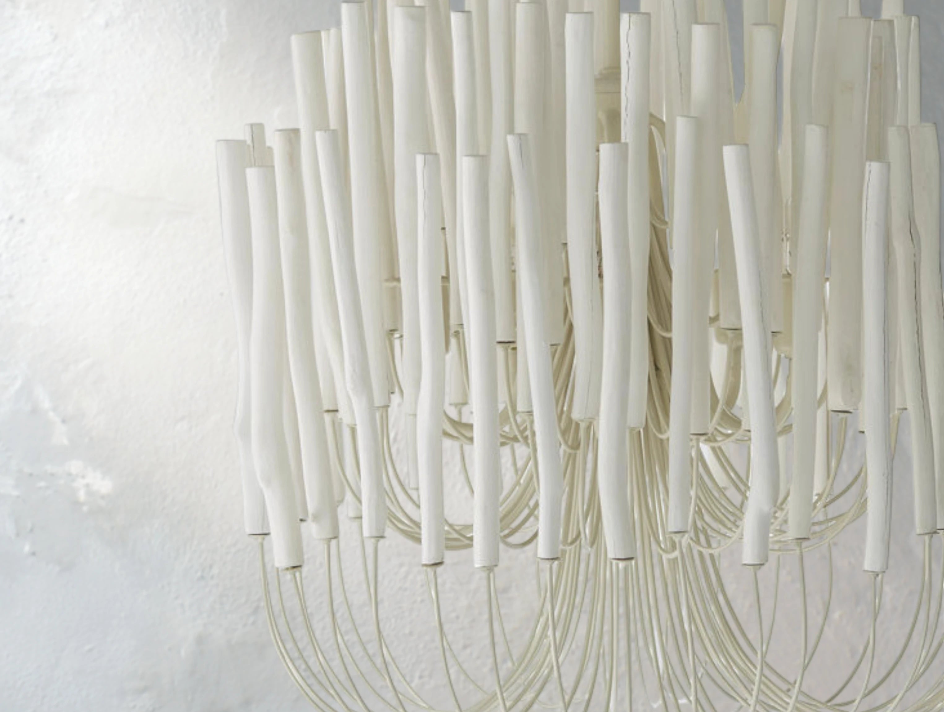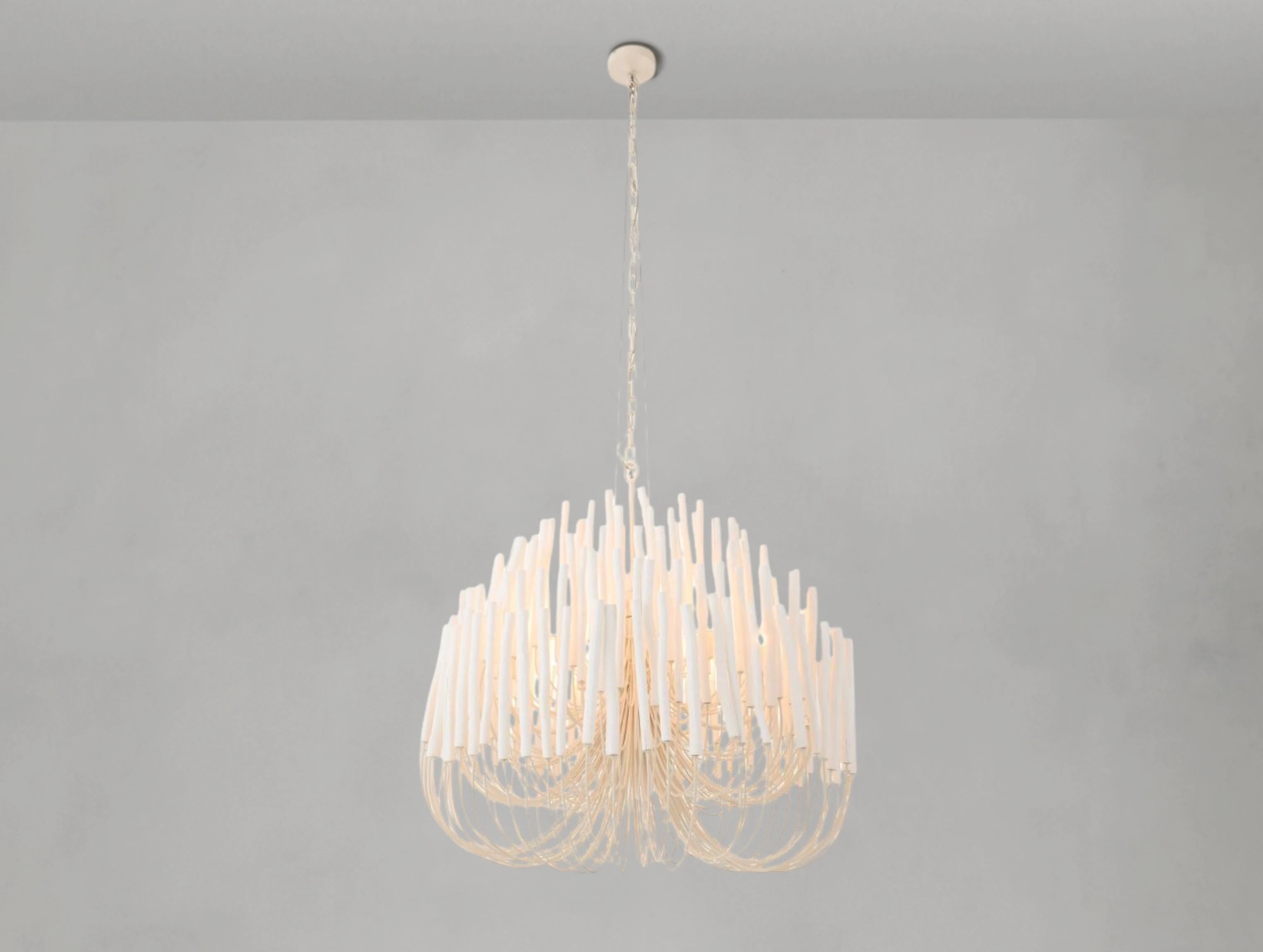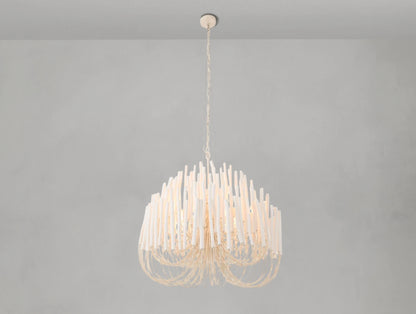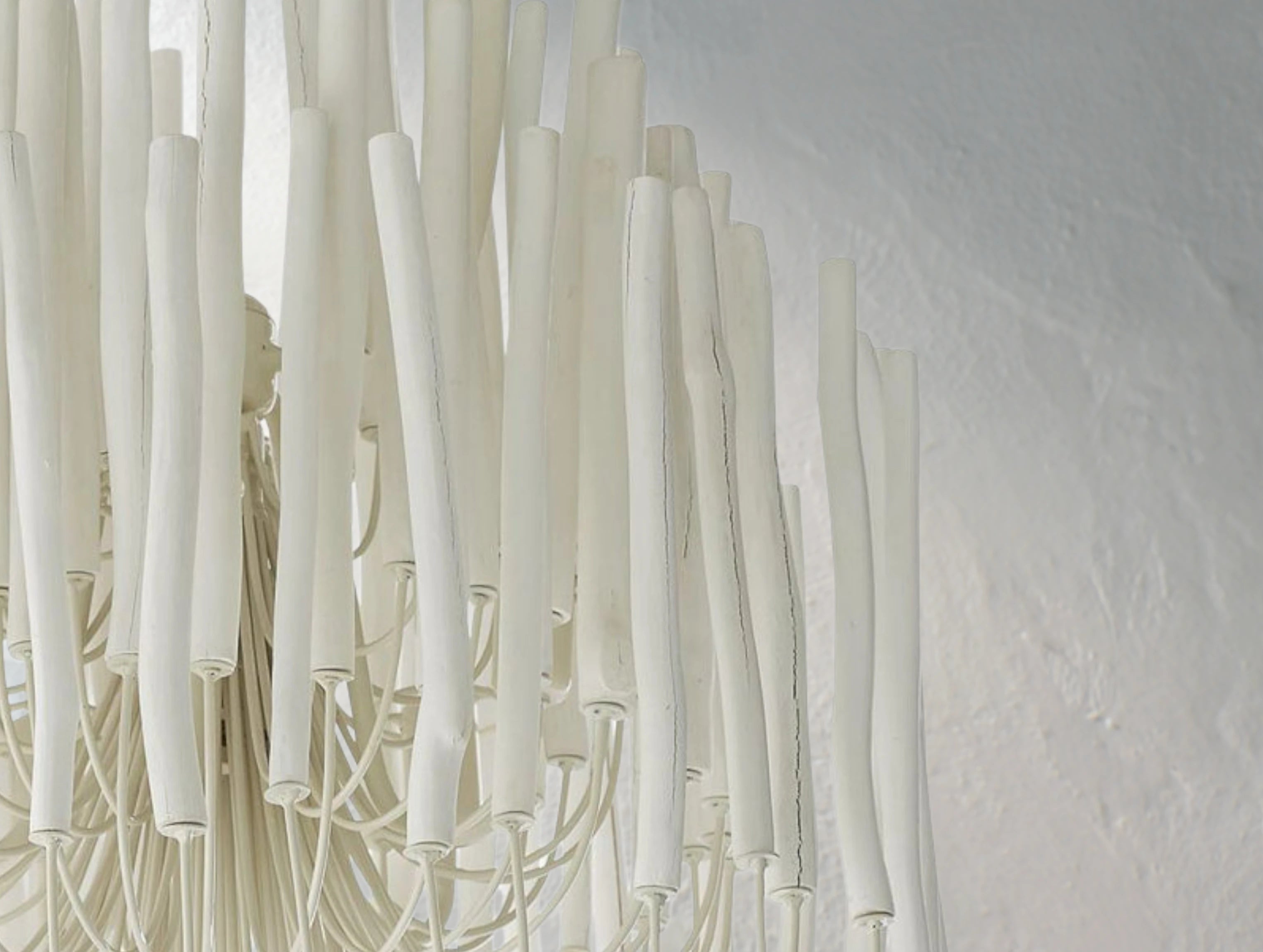 Rustic and refined in equal measure, this chandelier transforms any room with its sculptural presence and organic texture. Curved iron arms support tiers of hand-finished wooden dowels, each painted in soft white and rich with natural fissures that deepen and evolve over time. These variations are not flaws but part of the design’s inherent character—each piece unique, alive, and beautifully imperfect. Adjustable iron arms allow for fine spacing between bulbs and wood elements to maintain both safety and visual balance.