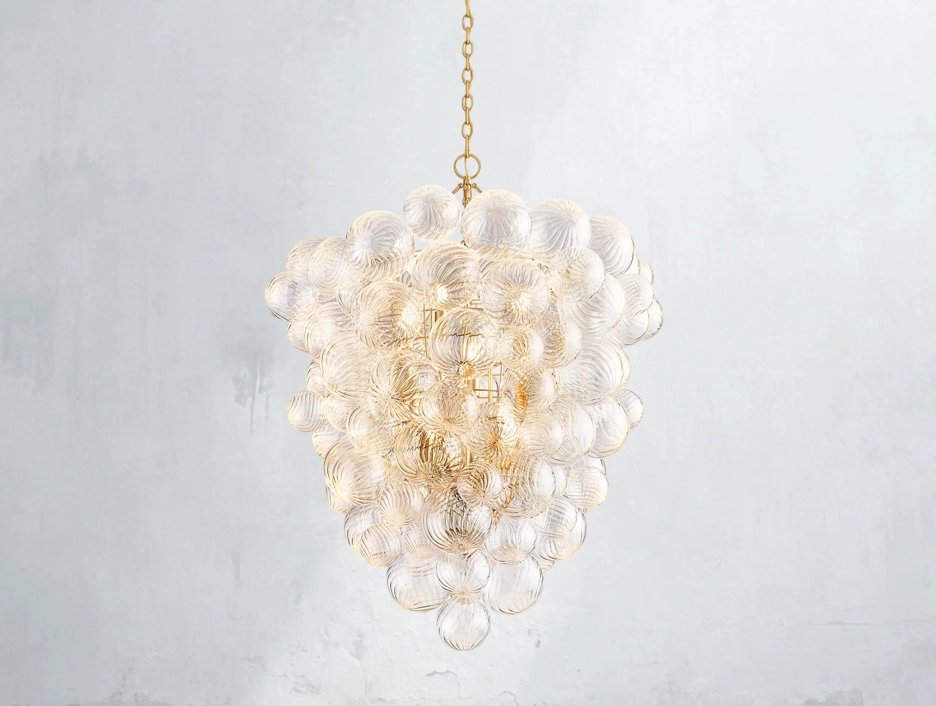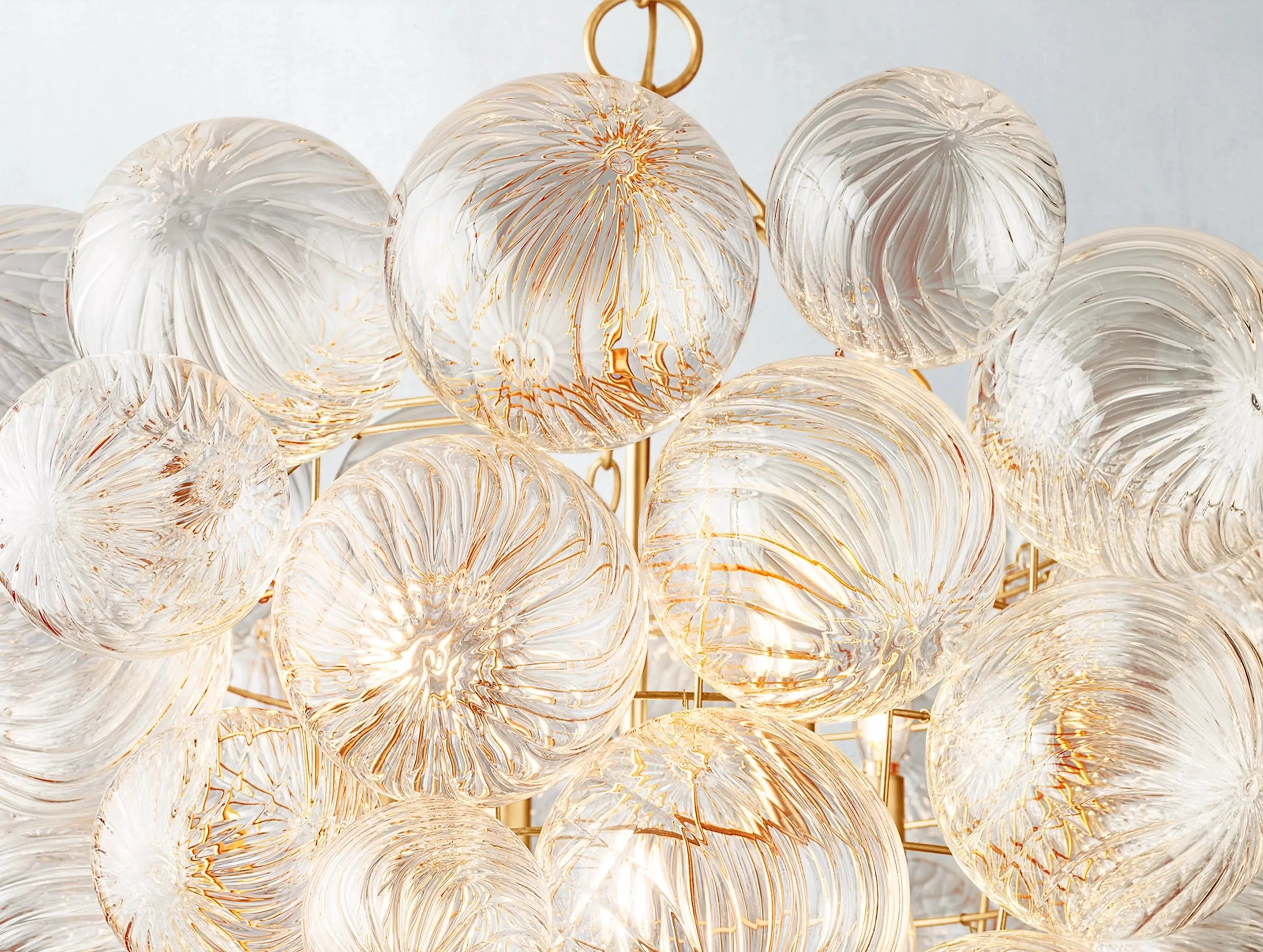 A modern reimagining of classic glass globe lighting. The Tolia Round Chandelier features 107 hand-blown swirled-glass orbs, each suspended in a delicate balance around a sleek metal frame. Like floating bubbles, the orbs shimmer with texture and light, casting gentle ripples across the room. Designed by Julie Neill, this piece blends timeless elegance with sculptural modernity.