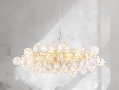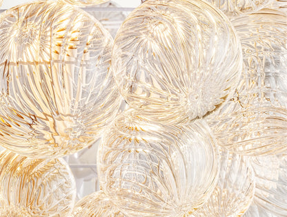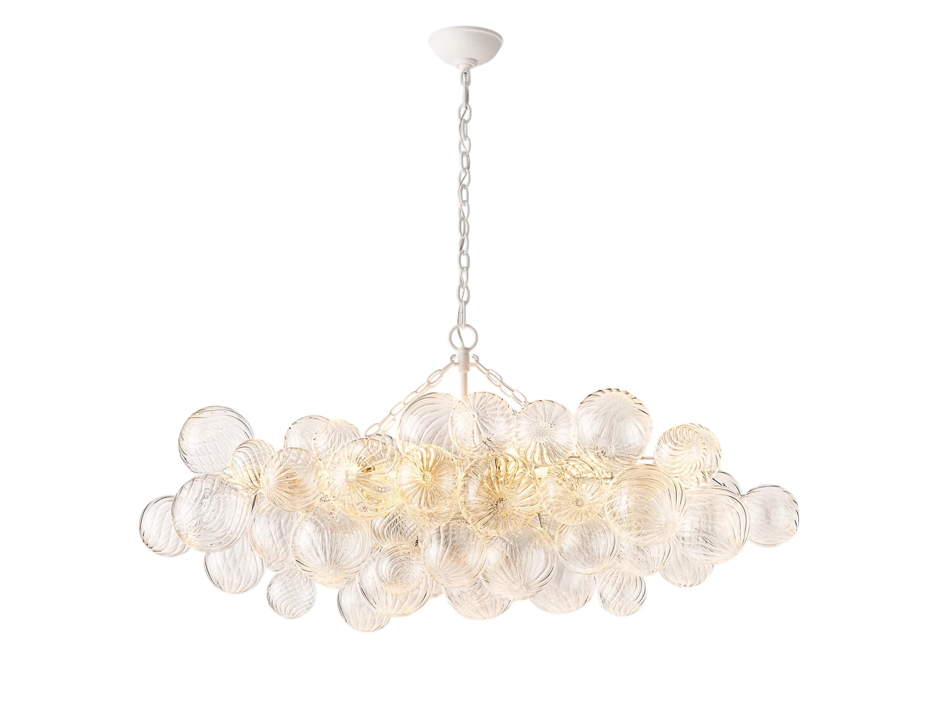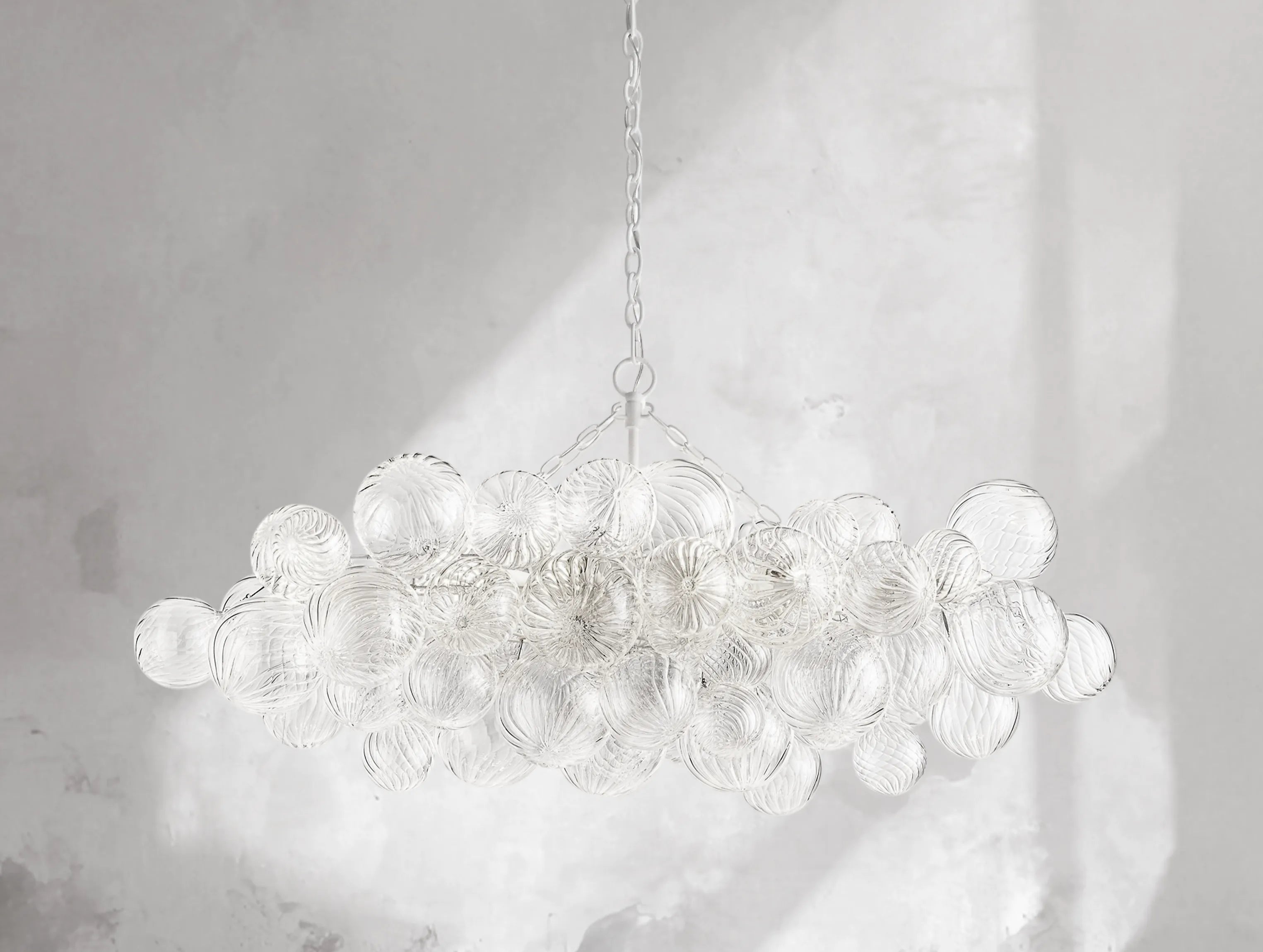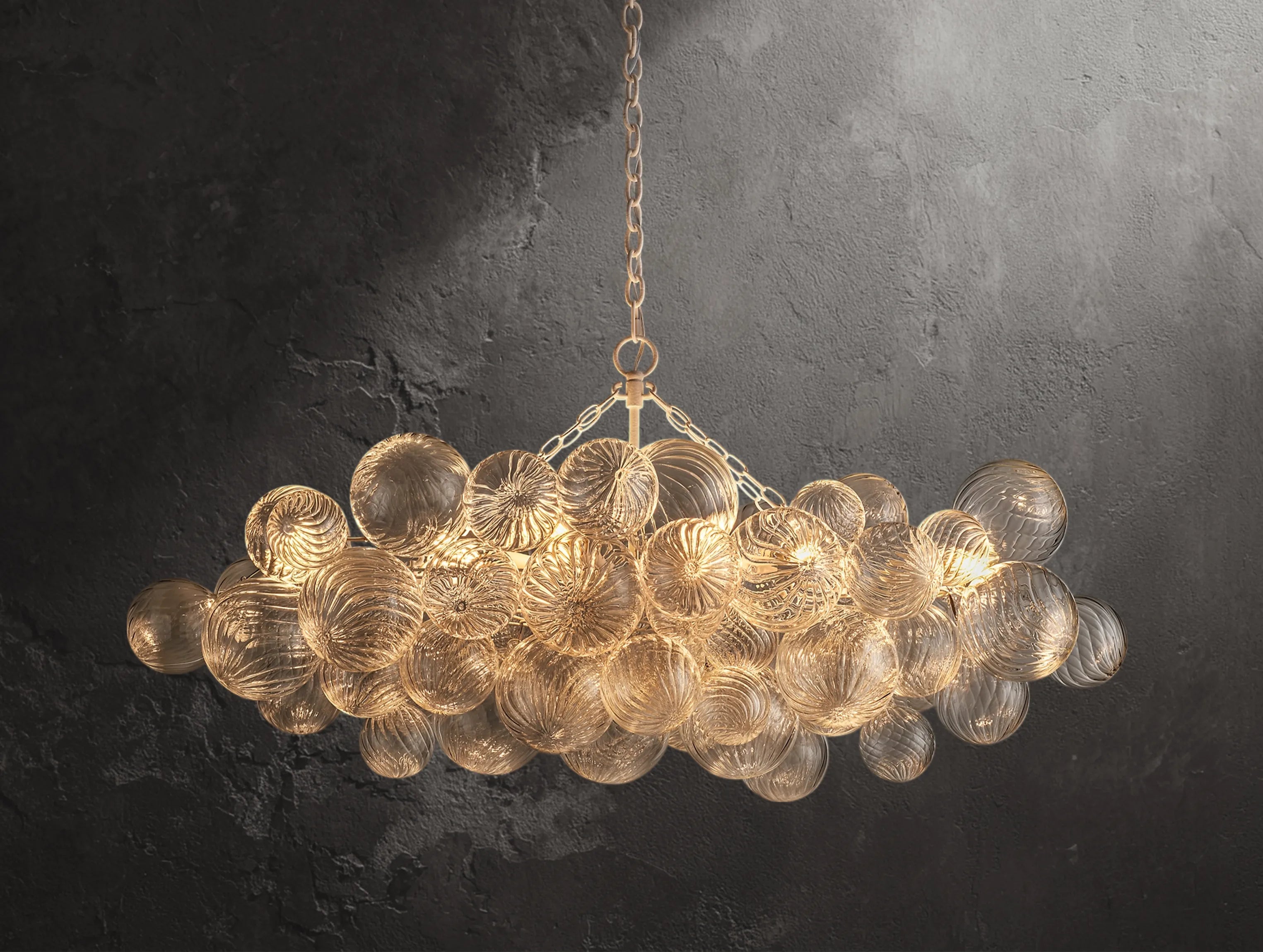 The Tolia chandelier showcases a captivating cluster of 64 hand-blown, swirled-glass orbs that seem to float weightlessly around a sculpted metal frame. Each globe’s rippled surface refracts and reflects light, casting a soft shimmer that brings warmth and movement to any space. Designed with modern elegance and handcrafted artistry, it reinterprets the timeless glass globe chandelier into a refined, contemporary statement piece.