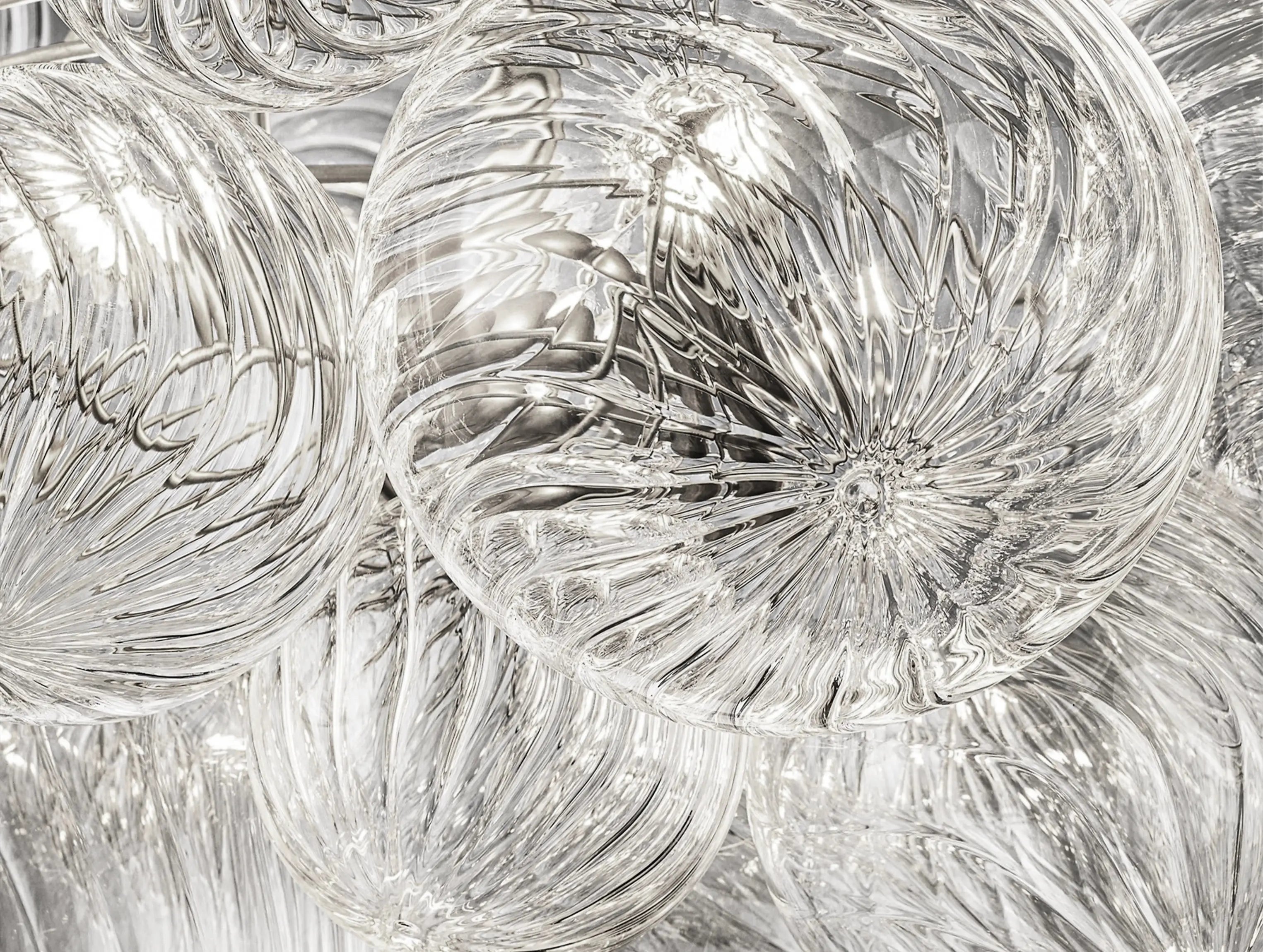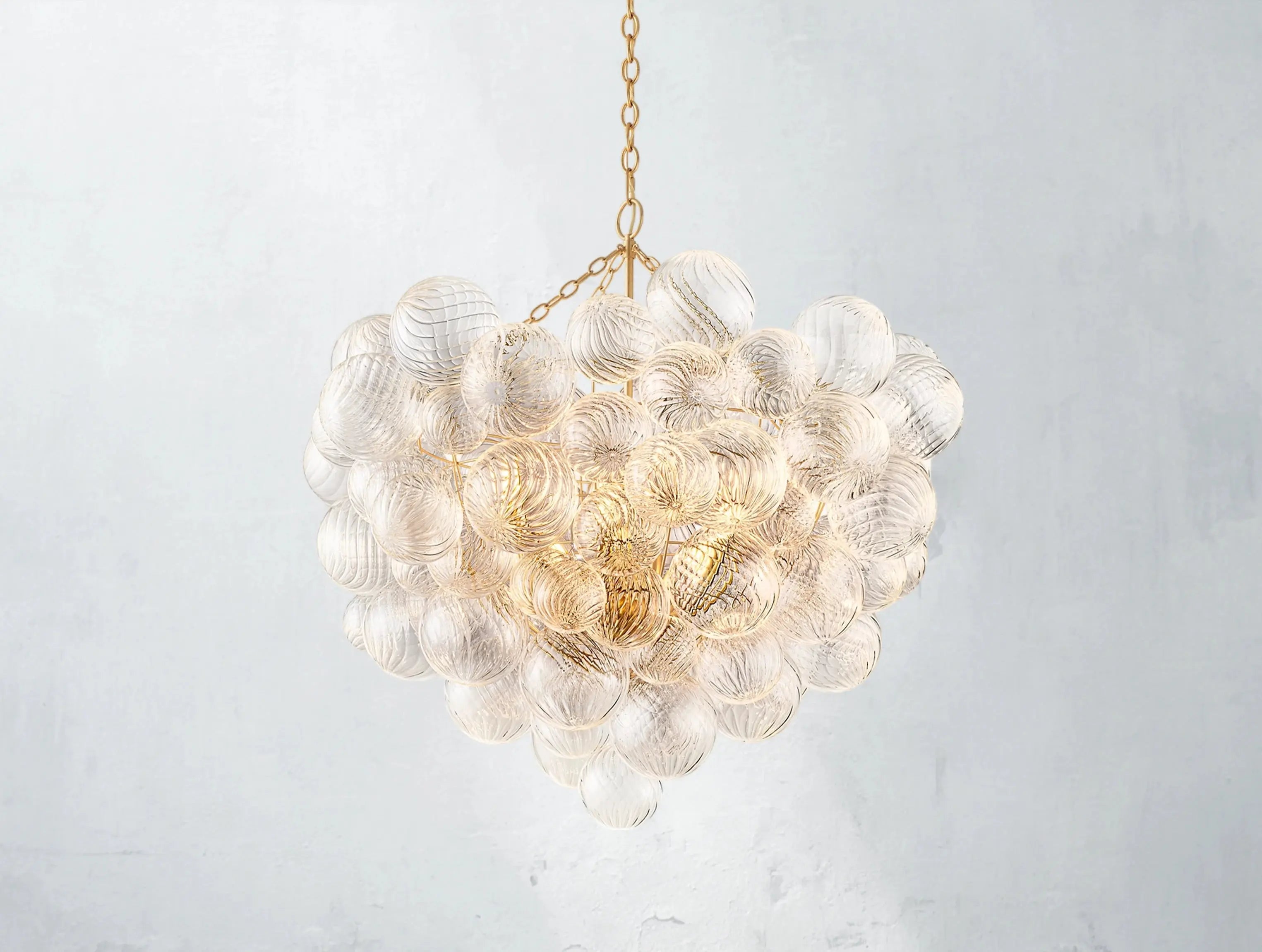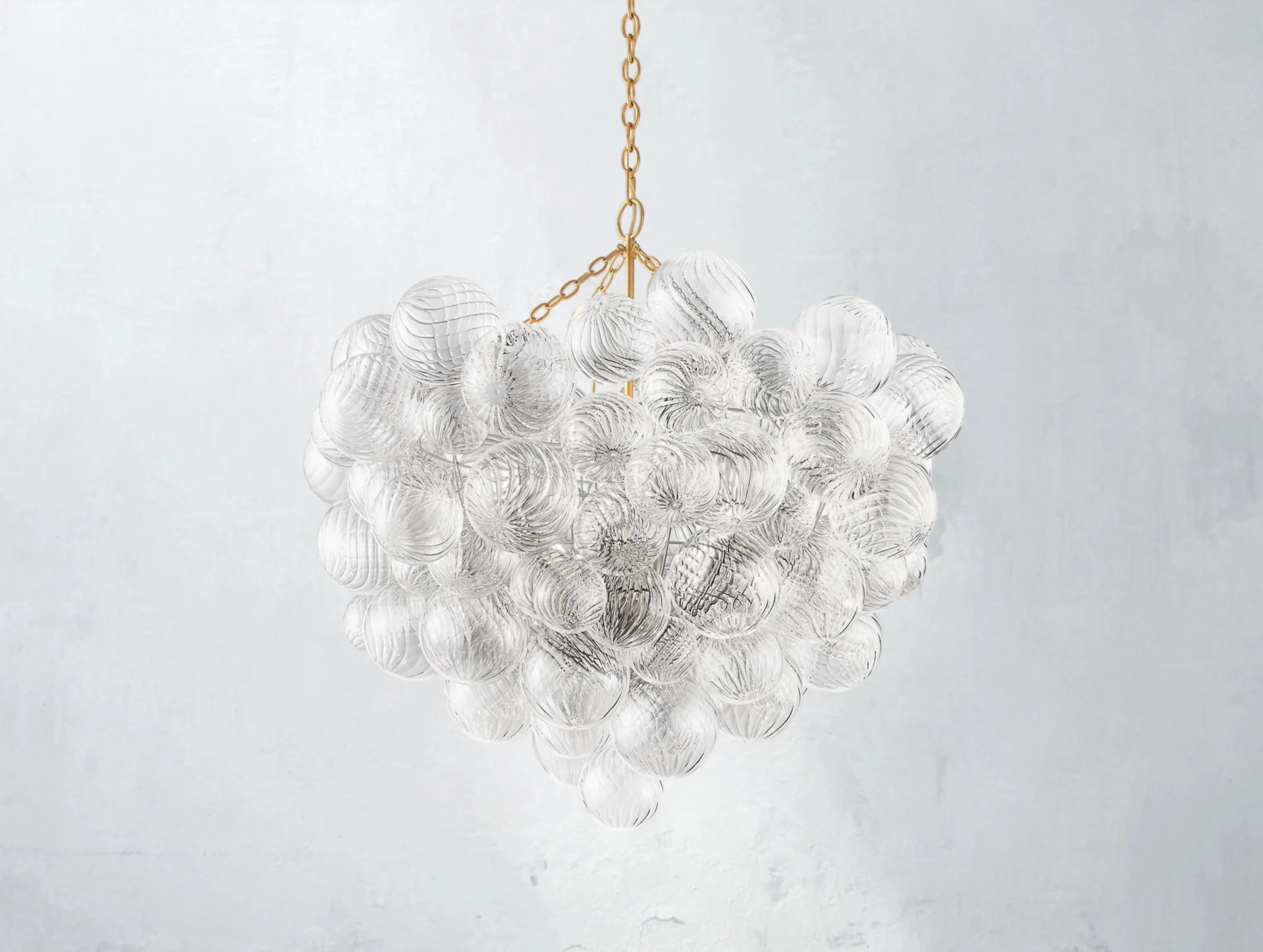 A modern reimagining of classic glass globe lighting. The Tolia Round Chandelier features 87 hand-blown swirled-glass orbs, each suspended in a delicate balance around a sleek metal frame. Like floating bubbles, the orbs shimmer with texture and light, casting gentle ripples across the room. Designed by Julie Neill, this piece blends timeless elegance with sculptural modernity.