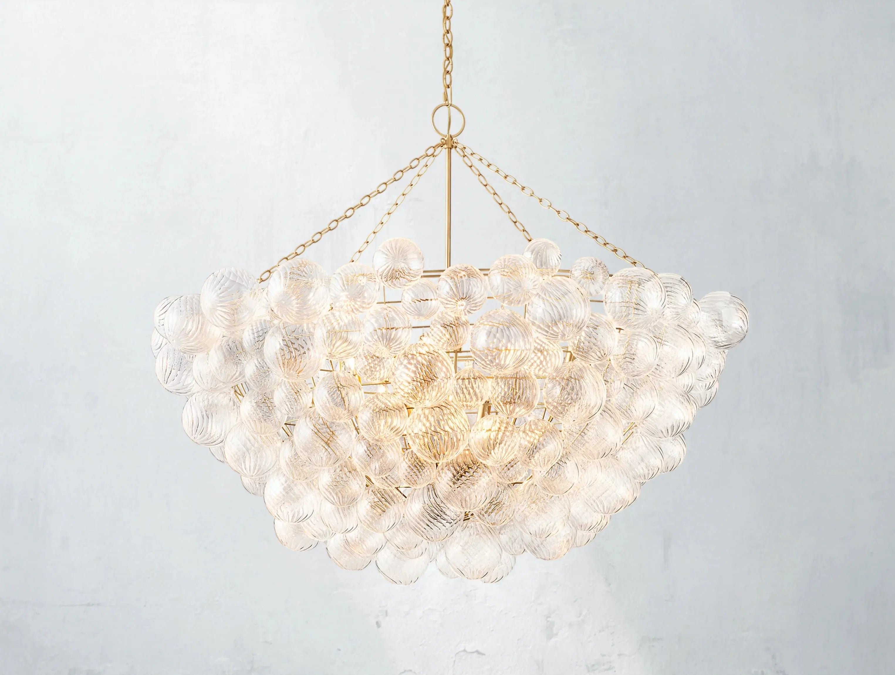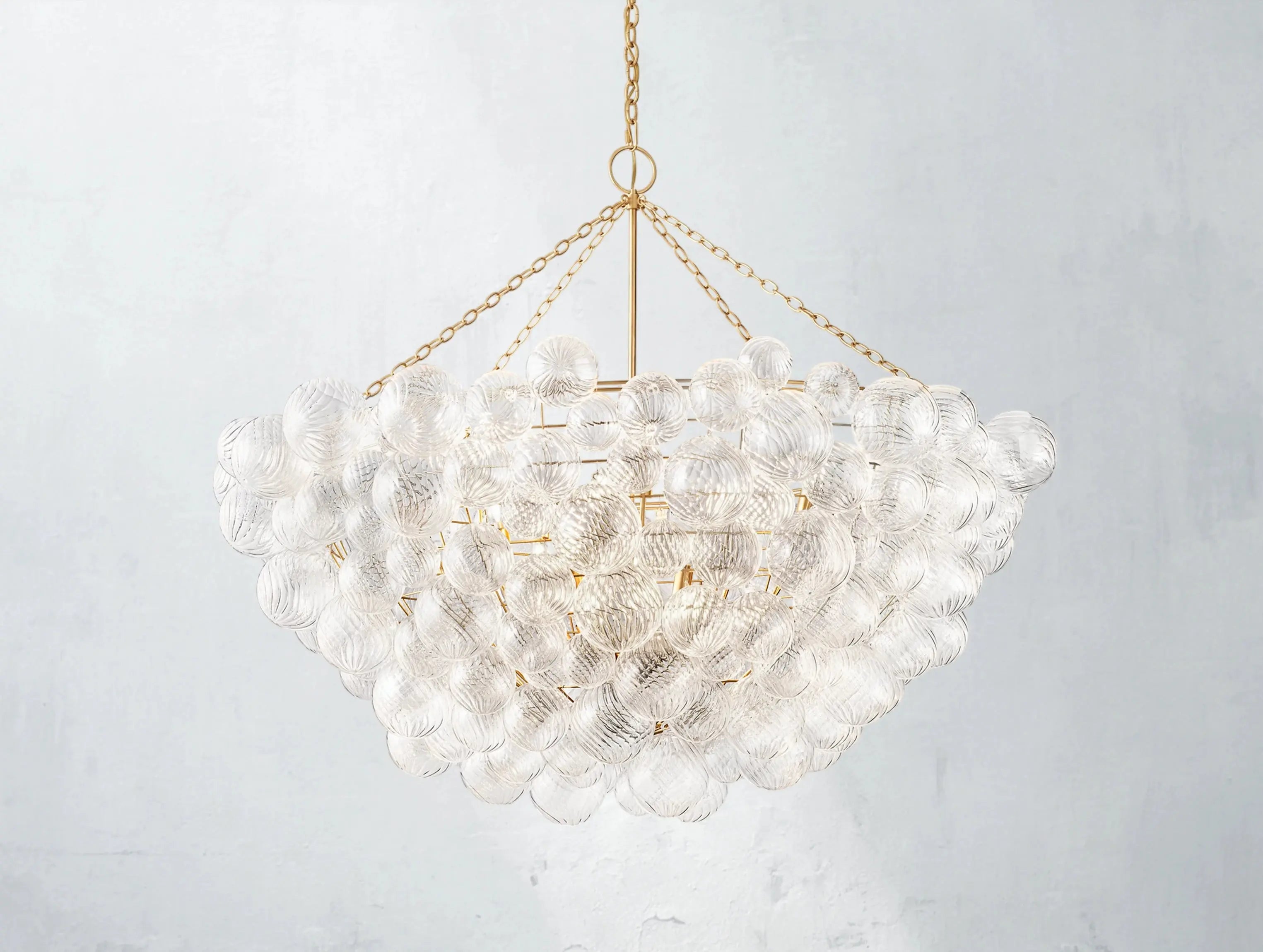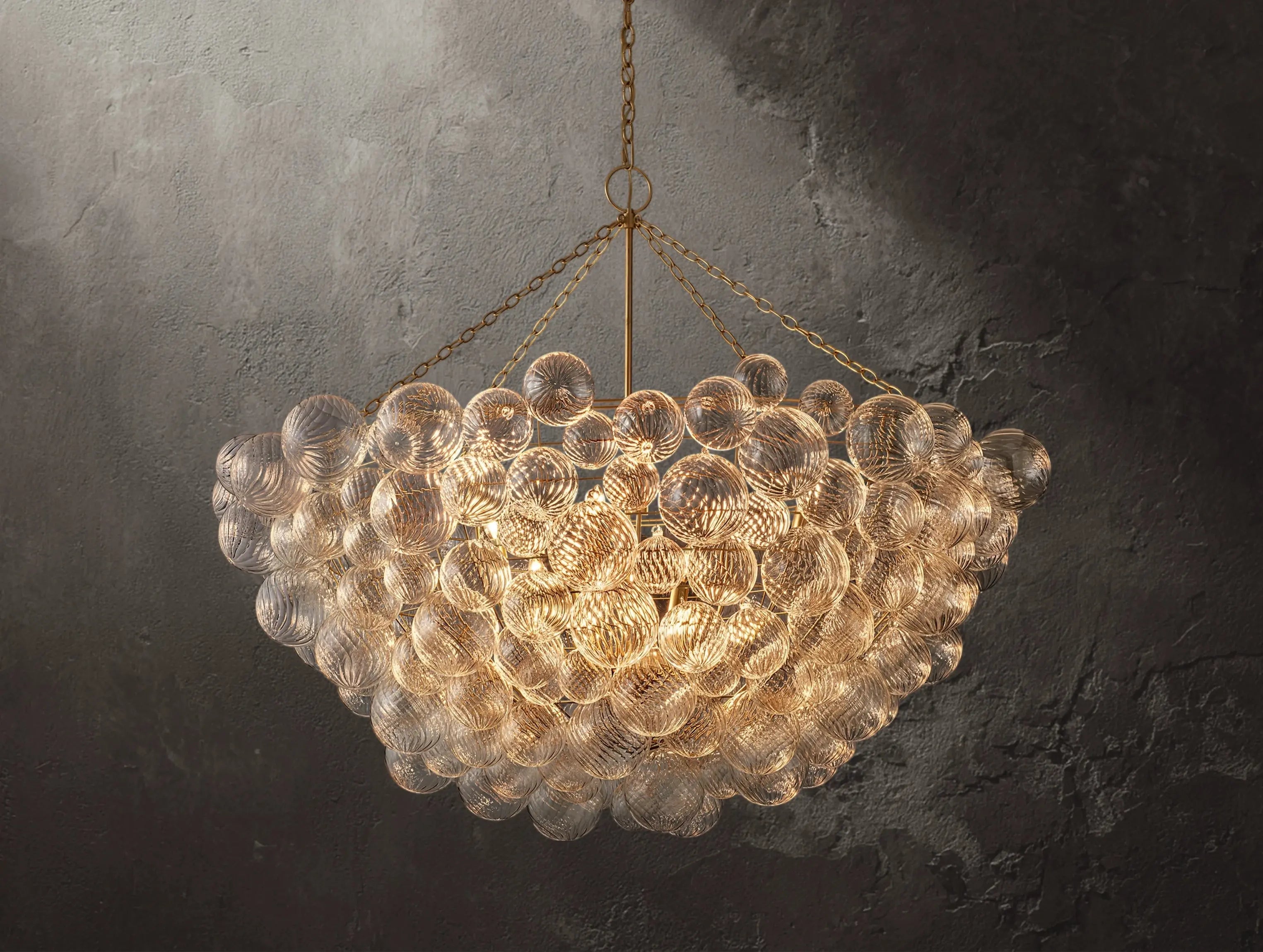 A modern reimagining of classic glass globe lighting. The Tolia Round Chandelier features 183 hand-blown swirled-glass orbs, each suspended in a delicate balance around a sleek metal frame. Like floating bubbles, the orbs shimmer with texture and light, casting gentle ripples across the room. Designed by Julie Neill, this piece blends timeless elegance with sculptural modernity.