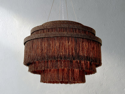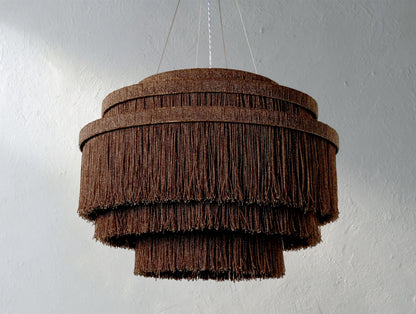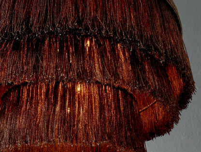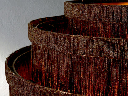This tiered chandelier is meticulously handcrafted by skilled artisans, with millions of glass beads individually strung over several days and arranged in cascading layers. When illuminated, the beads softly refract light, creating a warm, shimmering glow with dramatic vertical presence. Rich in texture and artisanal character, each piece is truly one of a kind—ideal for statement-making spaces with height and volume.