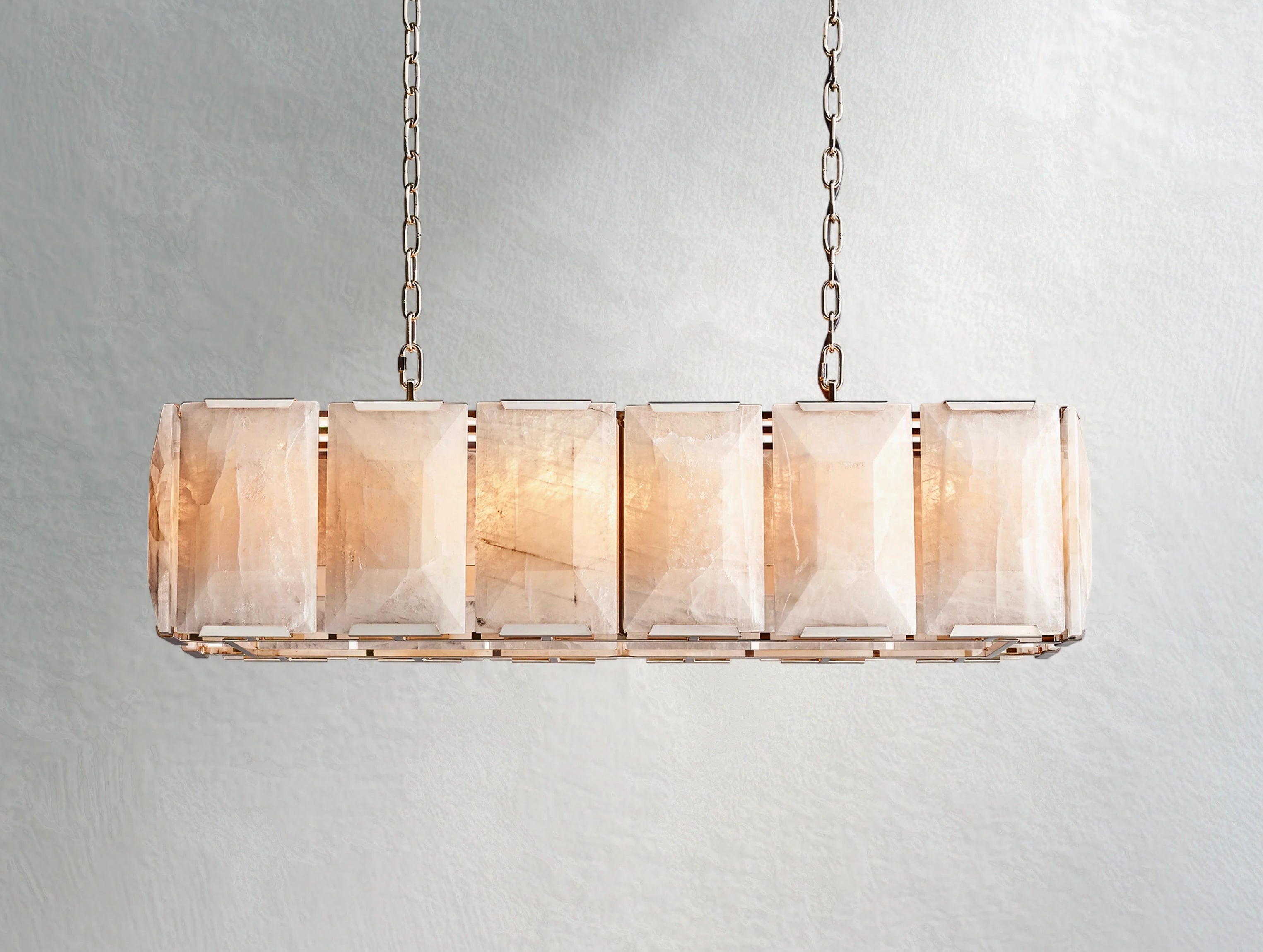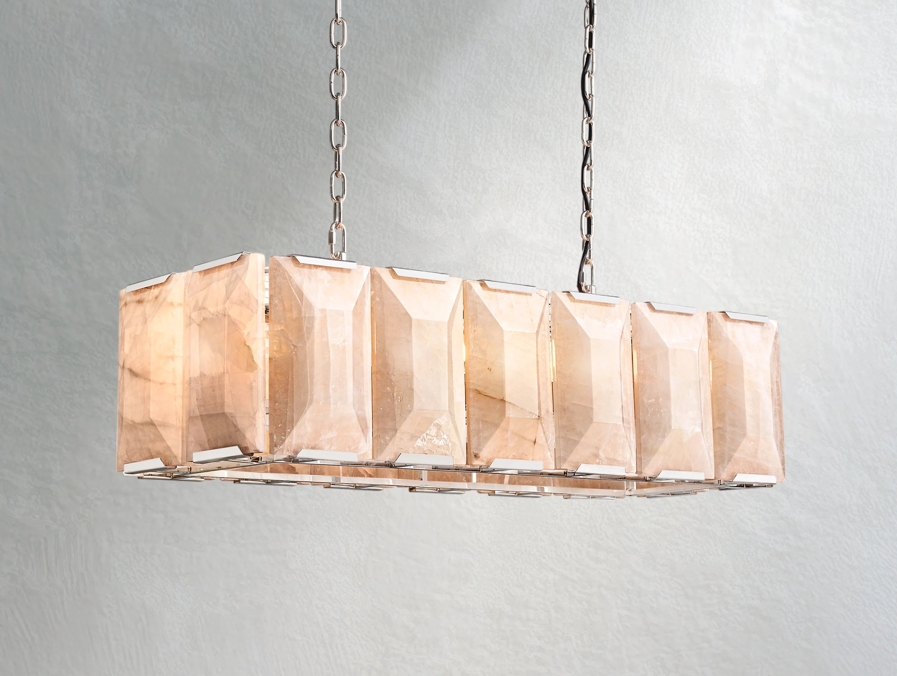 The Valonne Calcite Rectangular Chandelier celebrates the beauty of natural stone in a bold, architectural form. Each translucent calcite prism is hand-cut into faceted slabs and secured by slender metal mounts, allowing warm light to filter through and reveal its organic crystal patterns. Artisan craftsmanship ensures that every chandelier is truly one of a kind.
