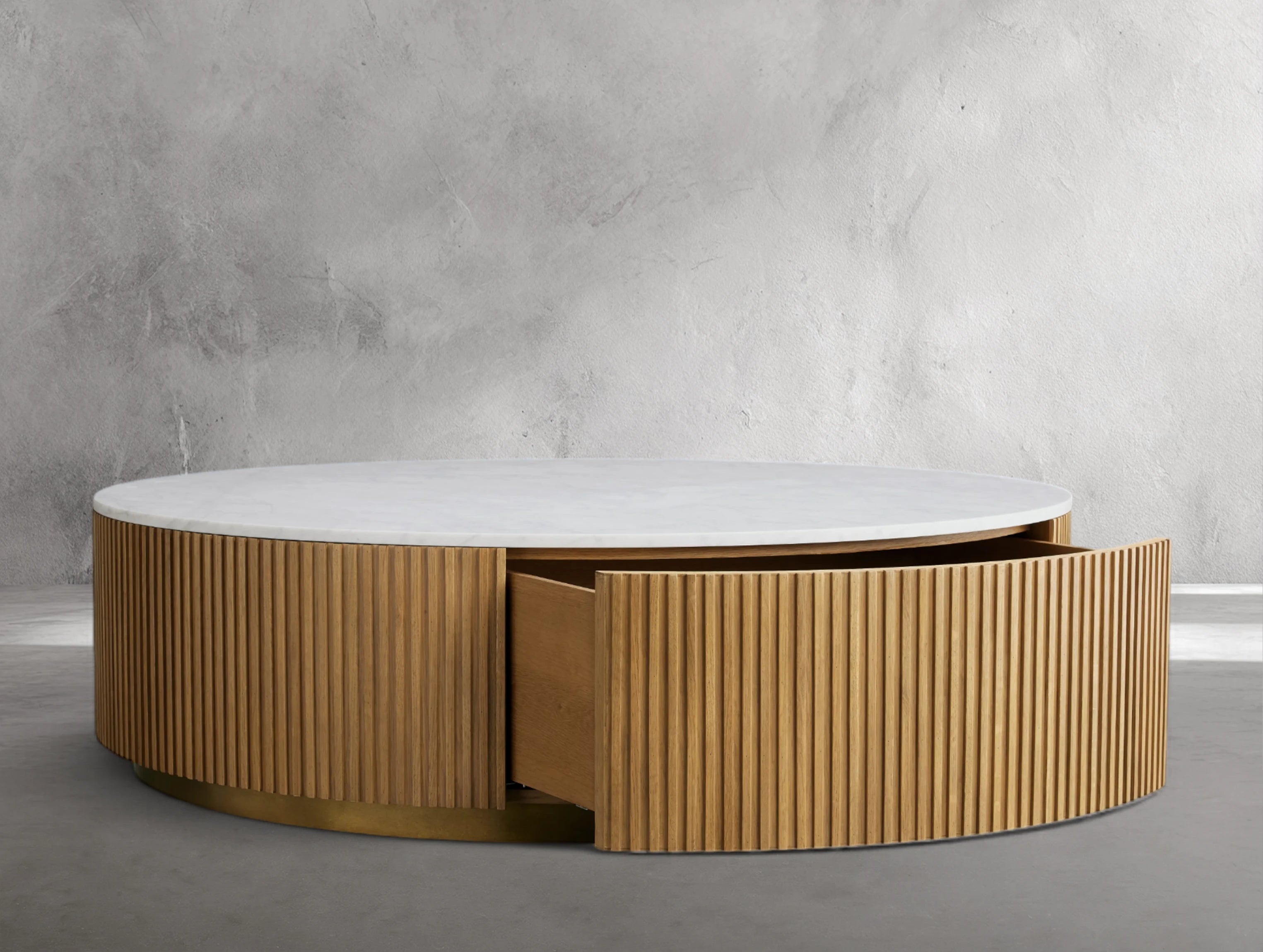 The Rolphin round storage coffee table combines timeless design with practical functionality. Crafted from hand-finished Finnish pine or premium white oak, it features reeded oak detailing, a stone top in your choice of finish, and a brass-finished plinth base. With hidden storage built into its elegant form, this table not only serves as a chic centerpiece but also keeps your living space organized in style.