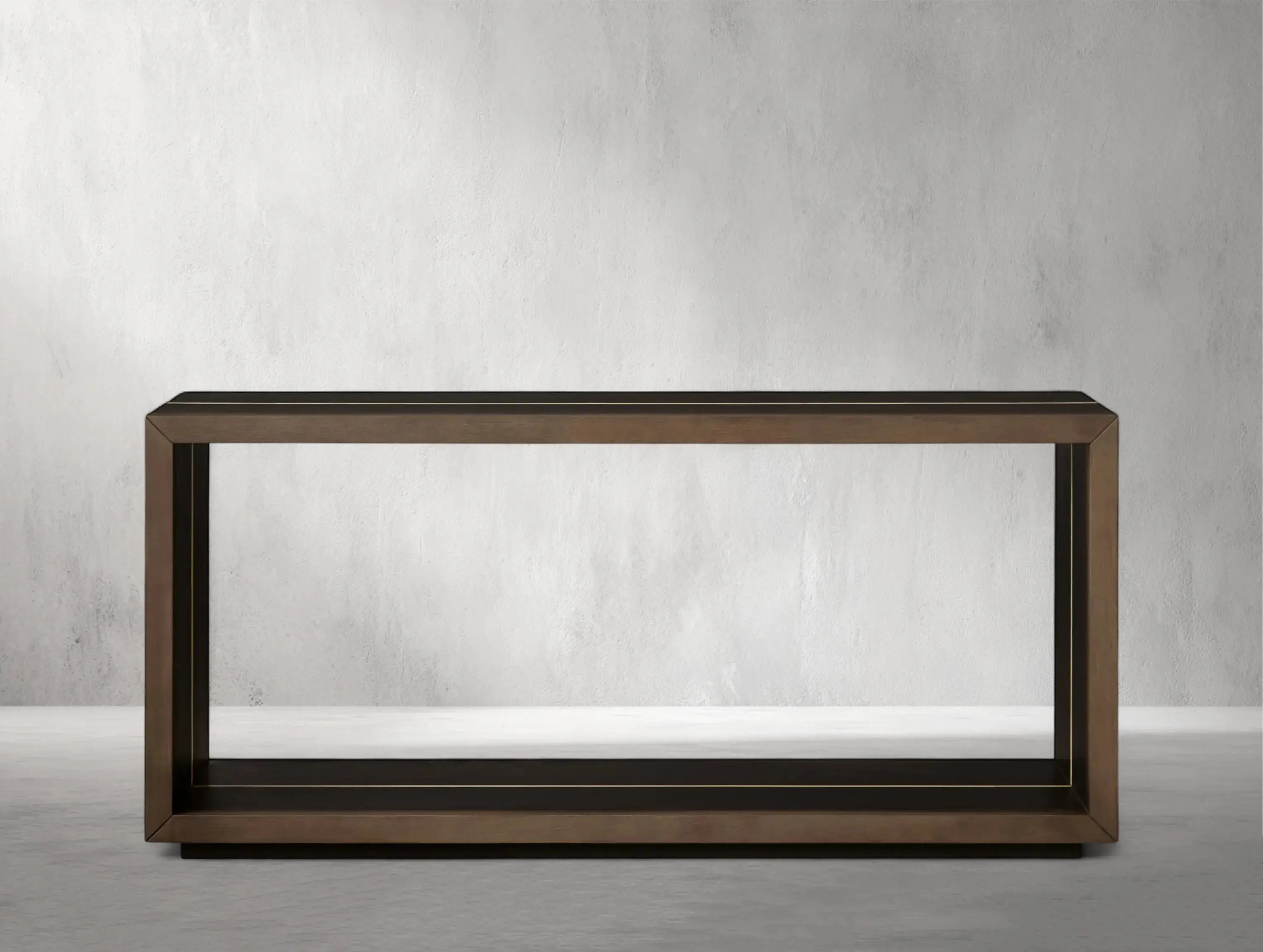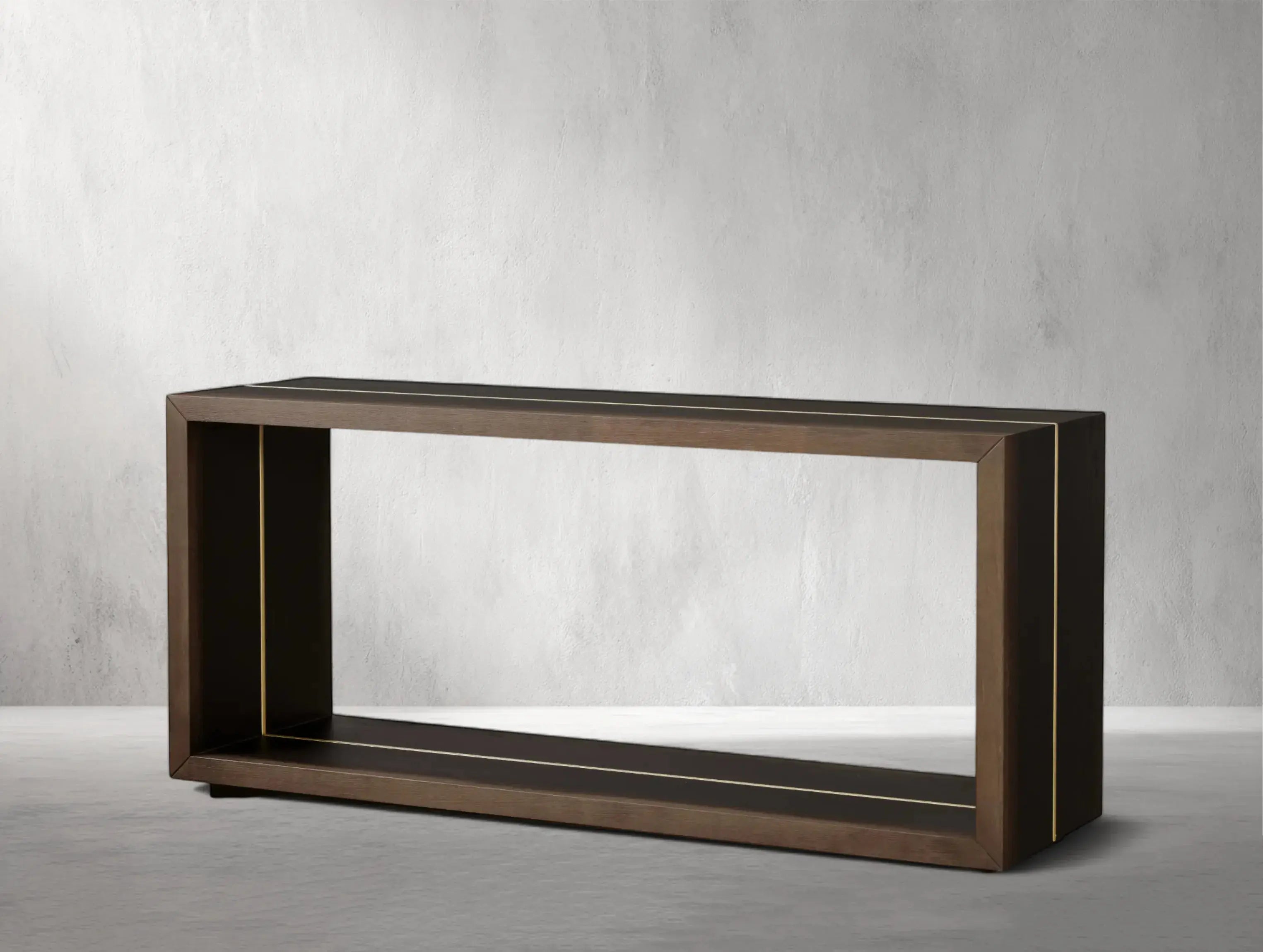 Inspired by the deep hues of aged wine barrels, this sculptural console table celebrates negative space through clean, architectural lines. Each piece is handcrafted in Romania from solid wood and completed with a multi-day finishing process that enhances its natural grain. Brass- or bronze-like carved accents add a subtle touch of luster, echoing the artistry of old-world cooperage.