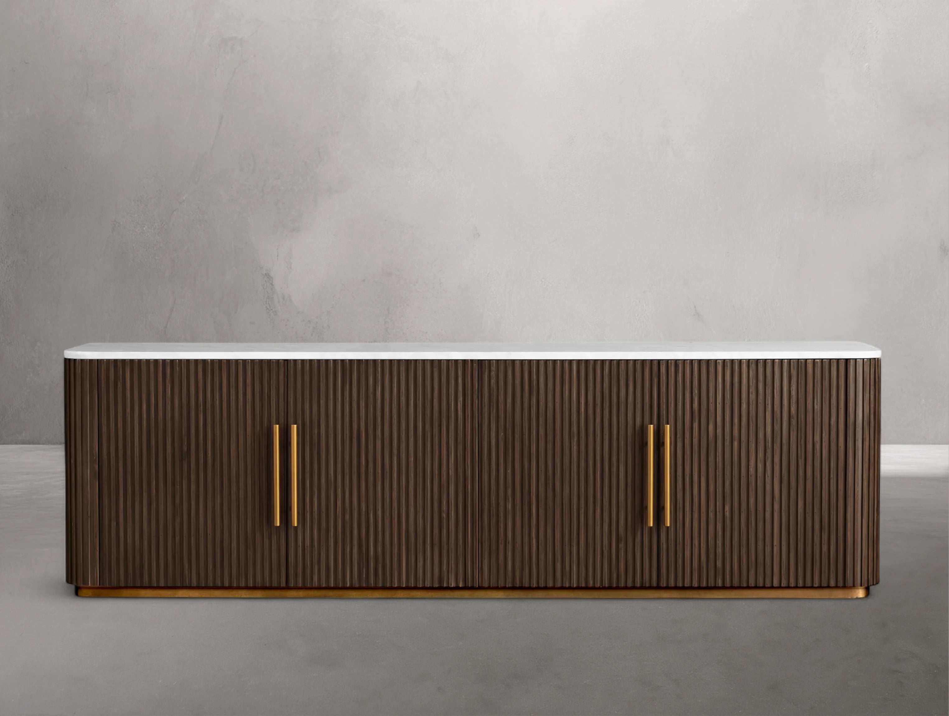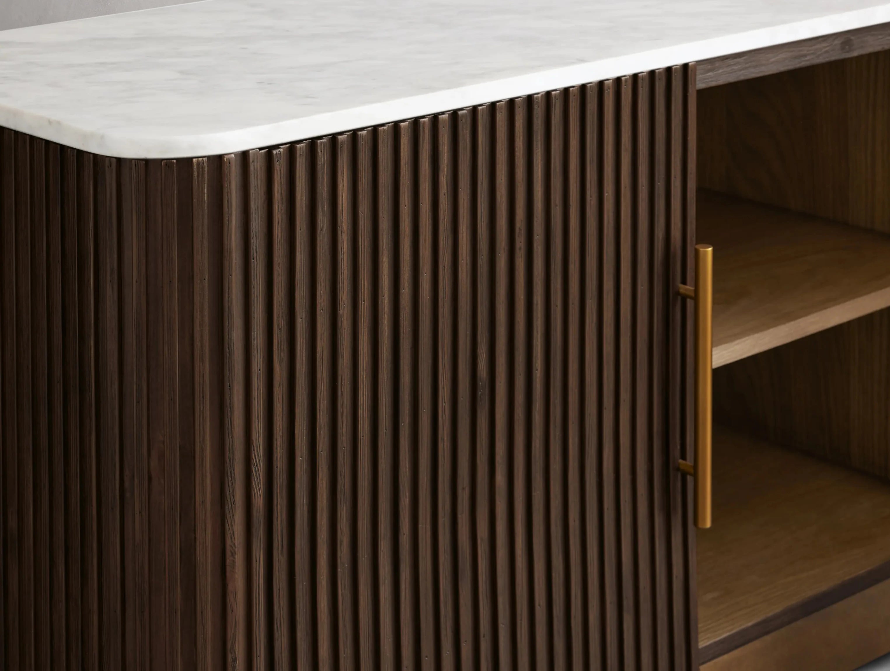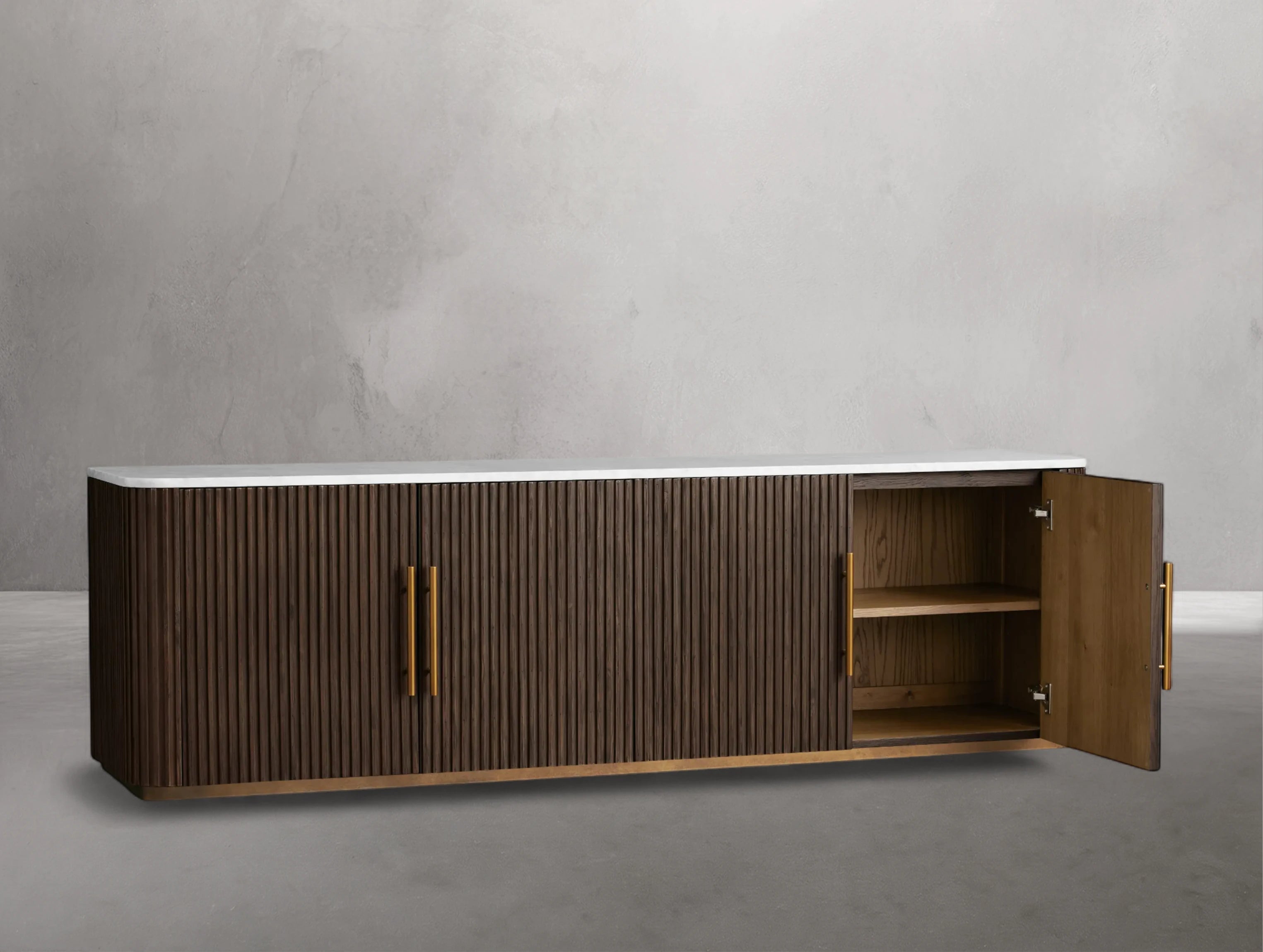 The Rolphin media console blends rich natural textures with refined craftsmanship in a sophisticated mixed-material design. Hand-finished Finnish pine or premium white oak is enhanced with reeded oak detailing and topped with your choice of white marble or bluestone. Featuring cord management for electronics, generous storage drawers with light brass-finished pulls, and levelers for perfect stability, this piece transitions seamlessly from living and dining rooms to bedrooms and office spaces.