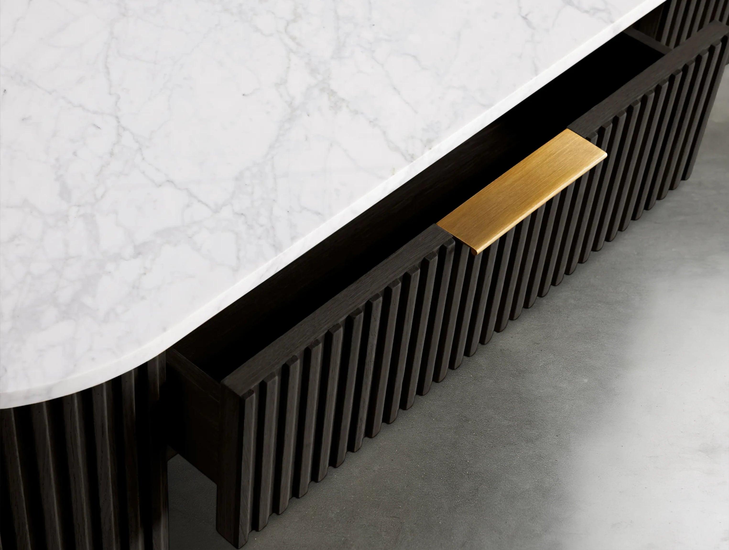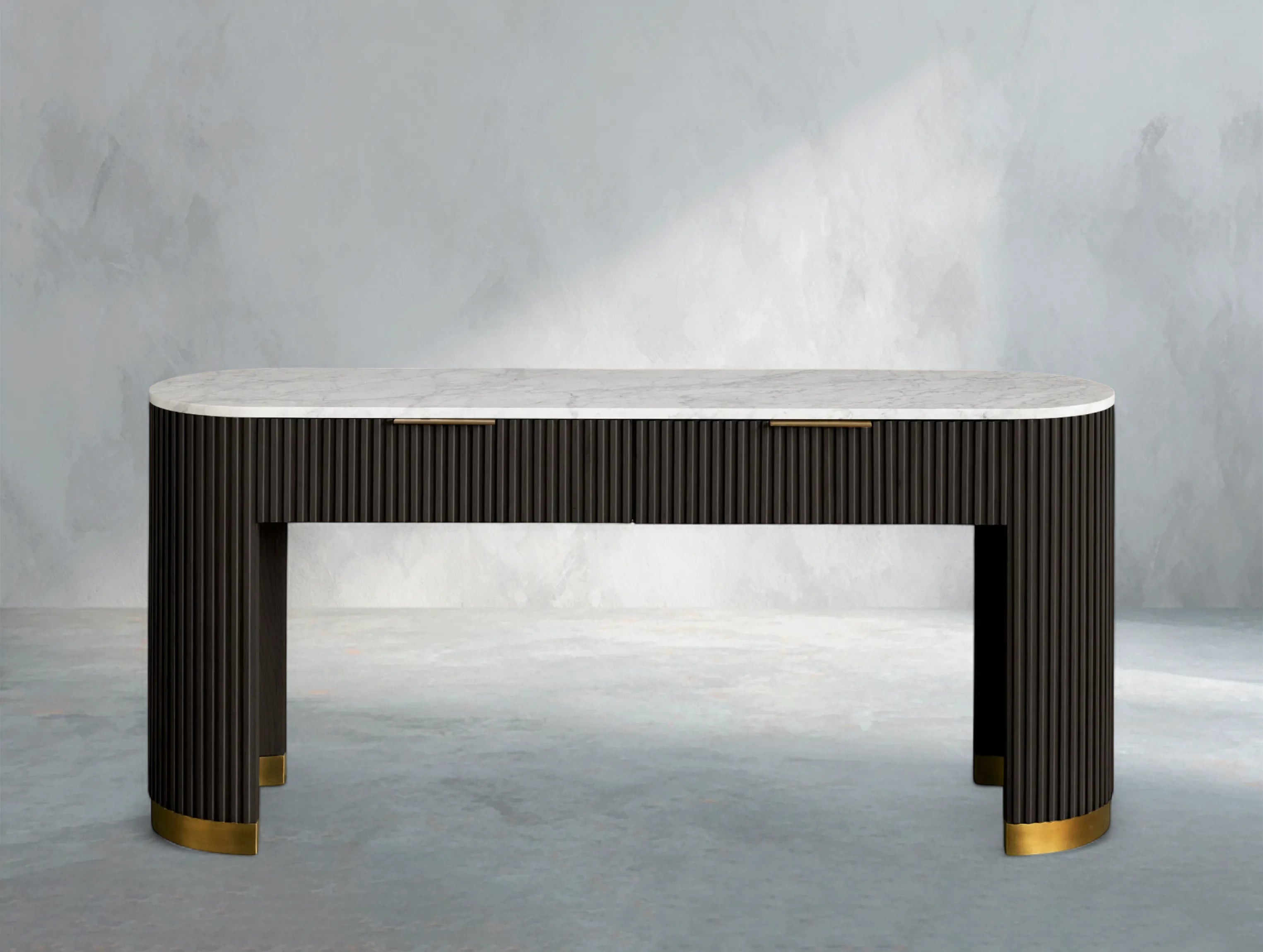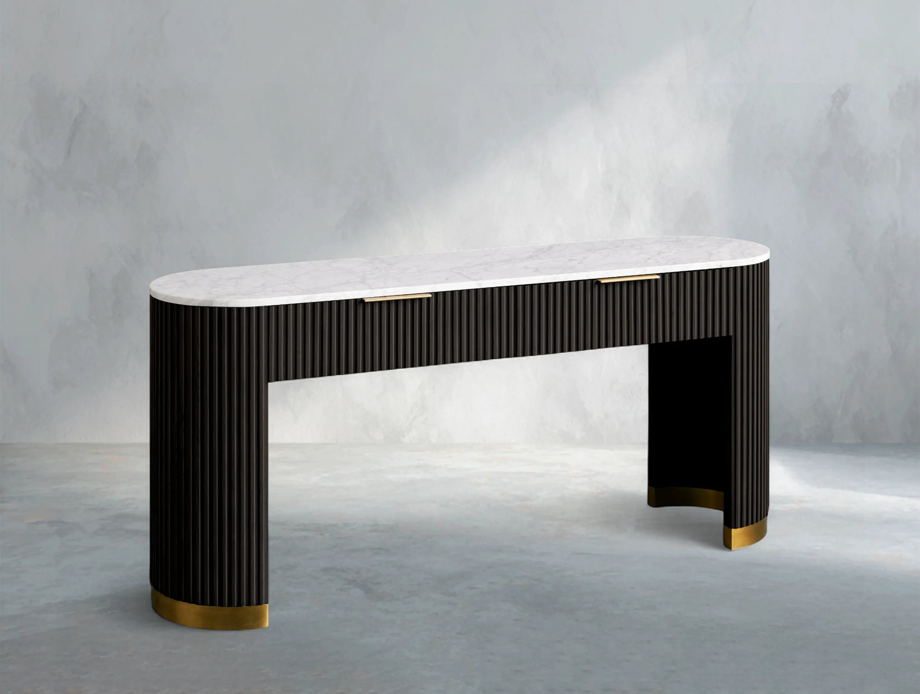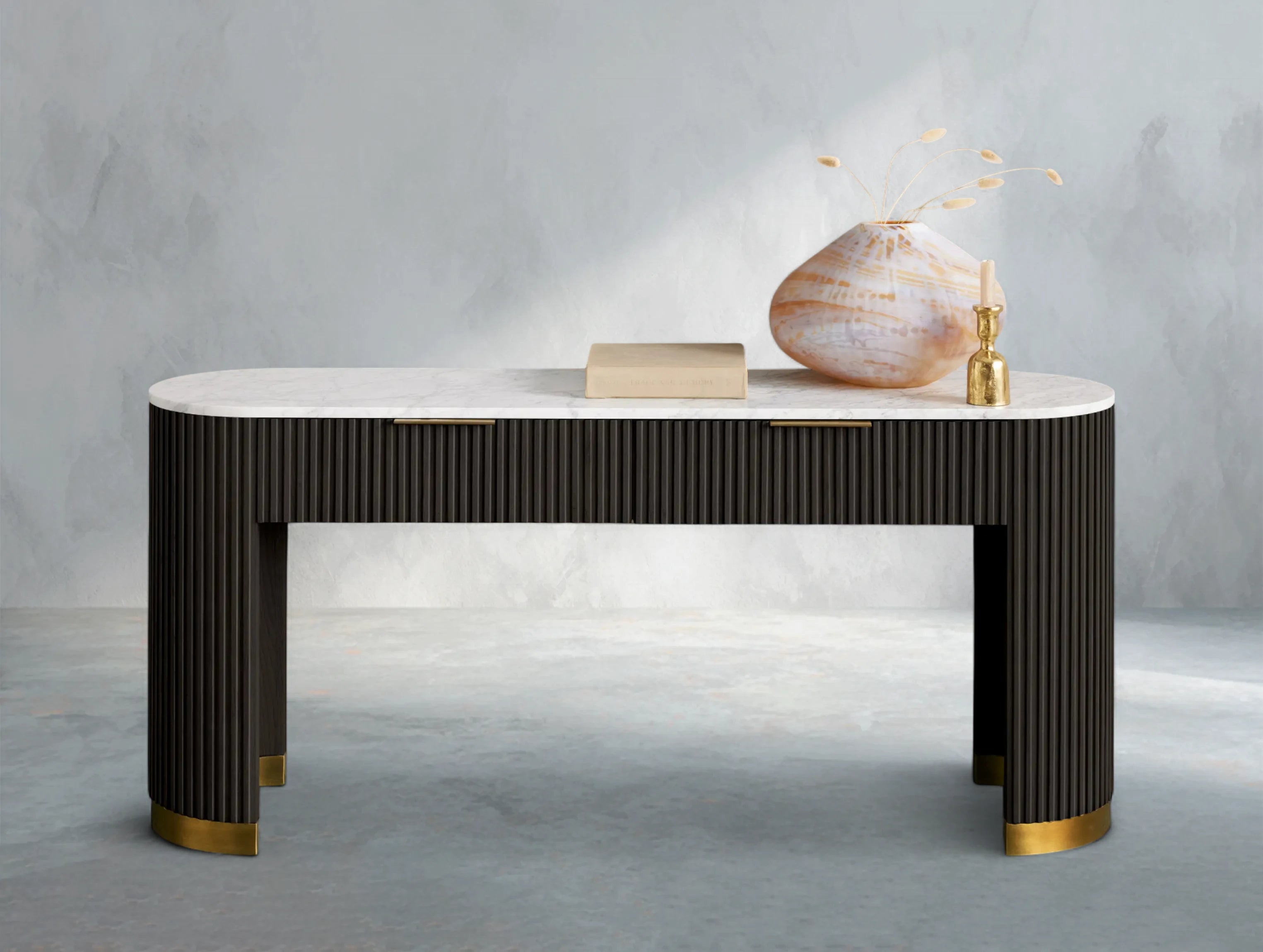 Part of the Rolphin Collection, the Rolphin Storage Console Table combines natural materials with refined craftsmanship. A luxurious stone top rests on reeded oak detailing and a brass-finished plinth base, blending strength with sculptural elegance. Perfect for hallways, living rooms, or dining spaces, it offers both function and timeless appeal.