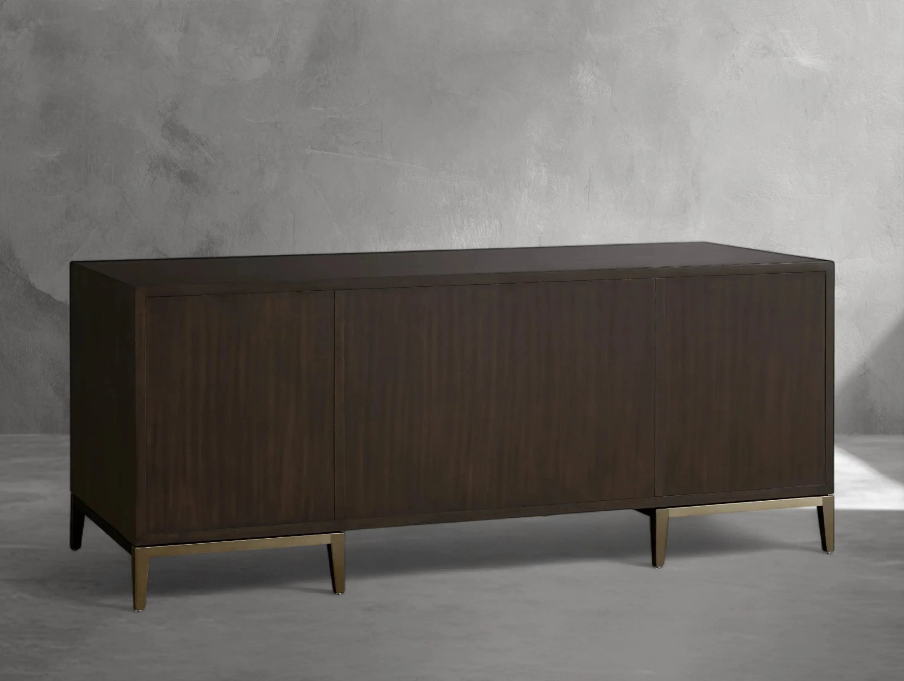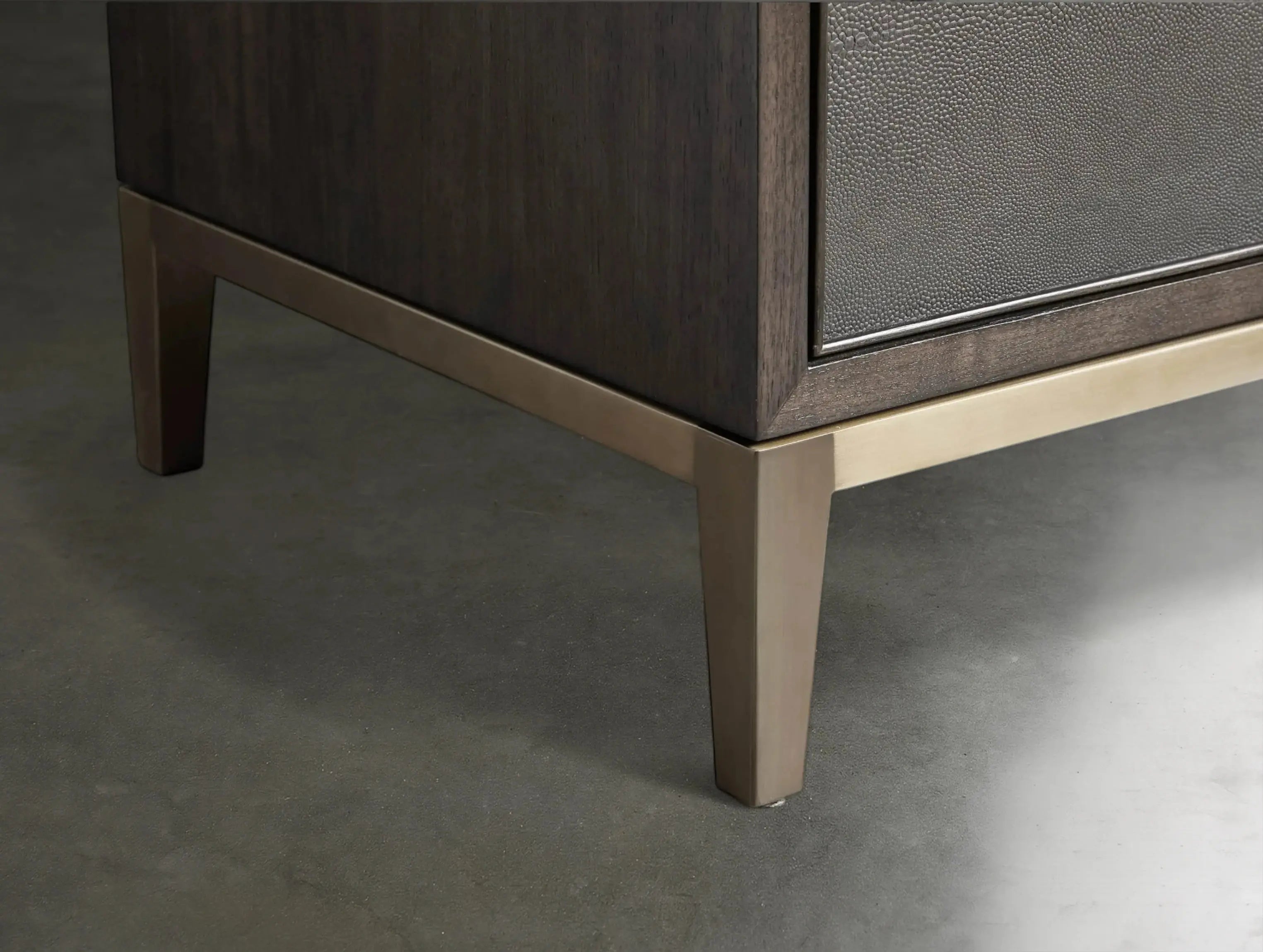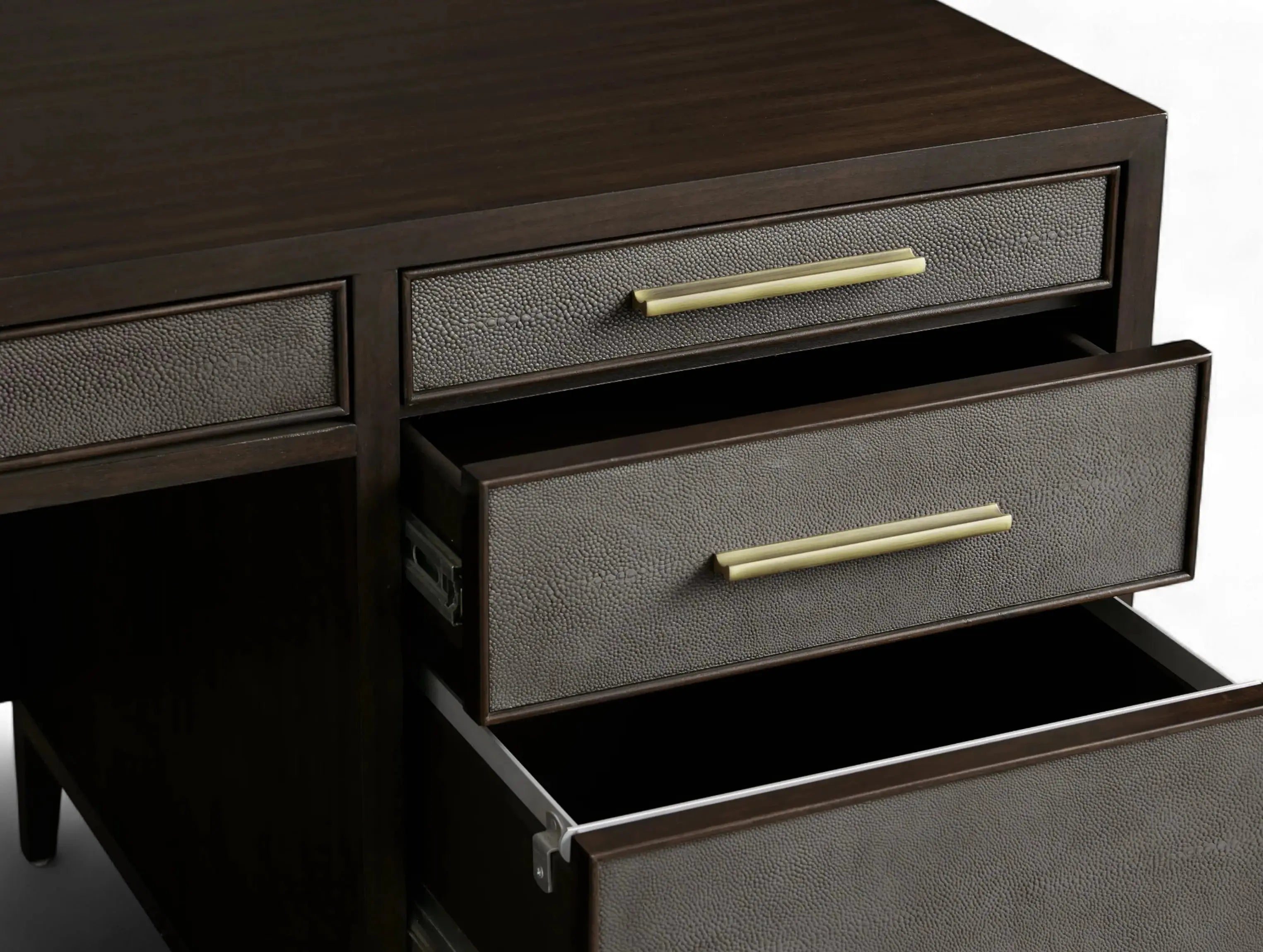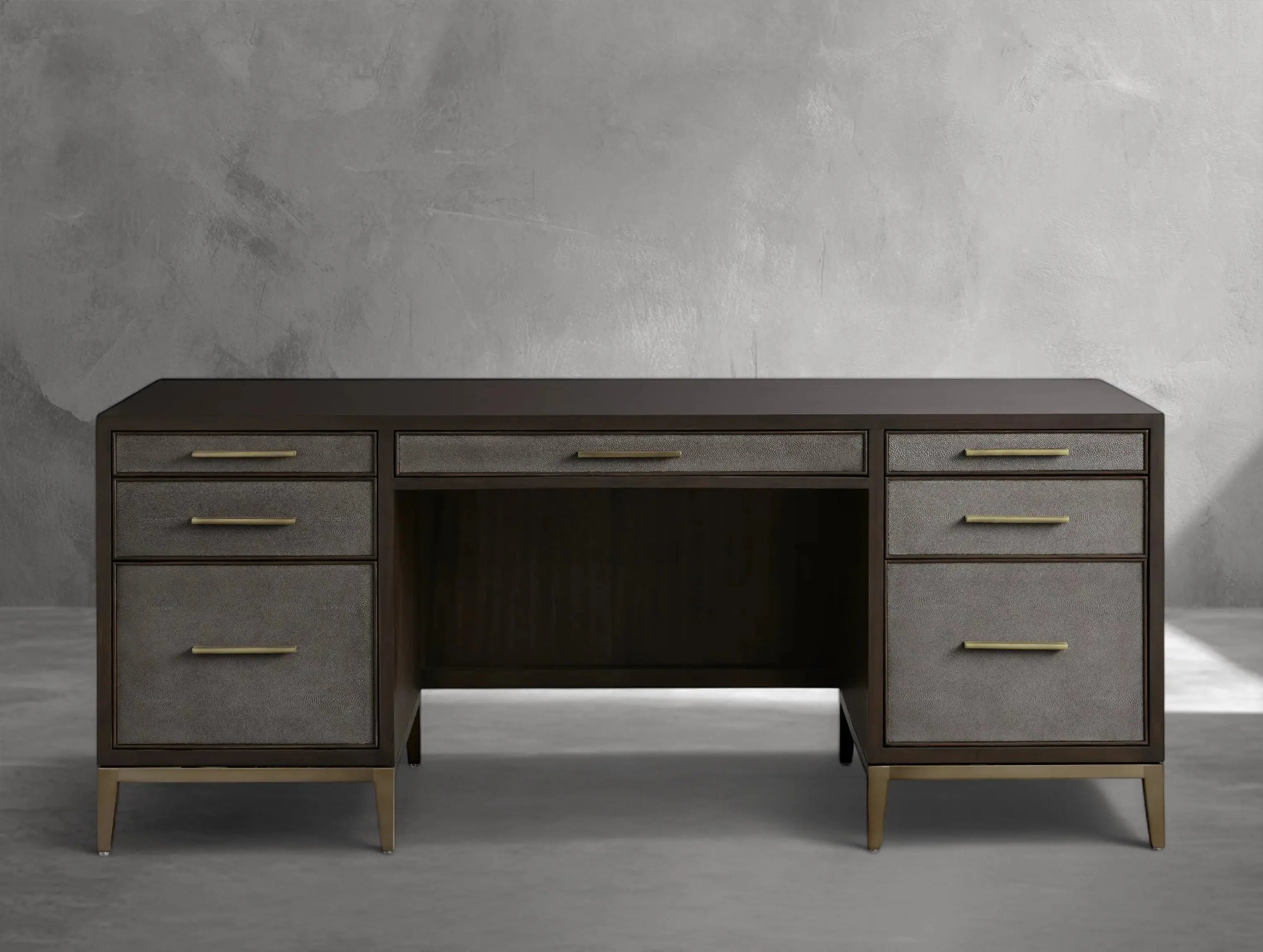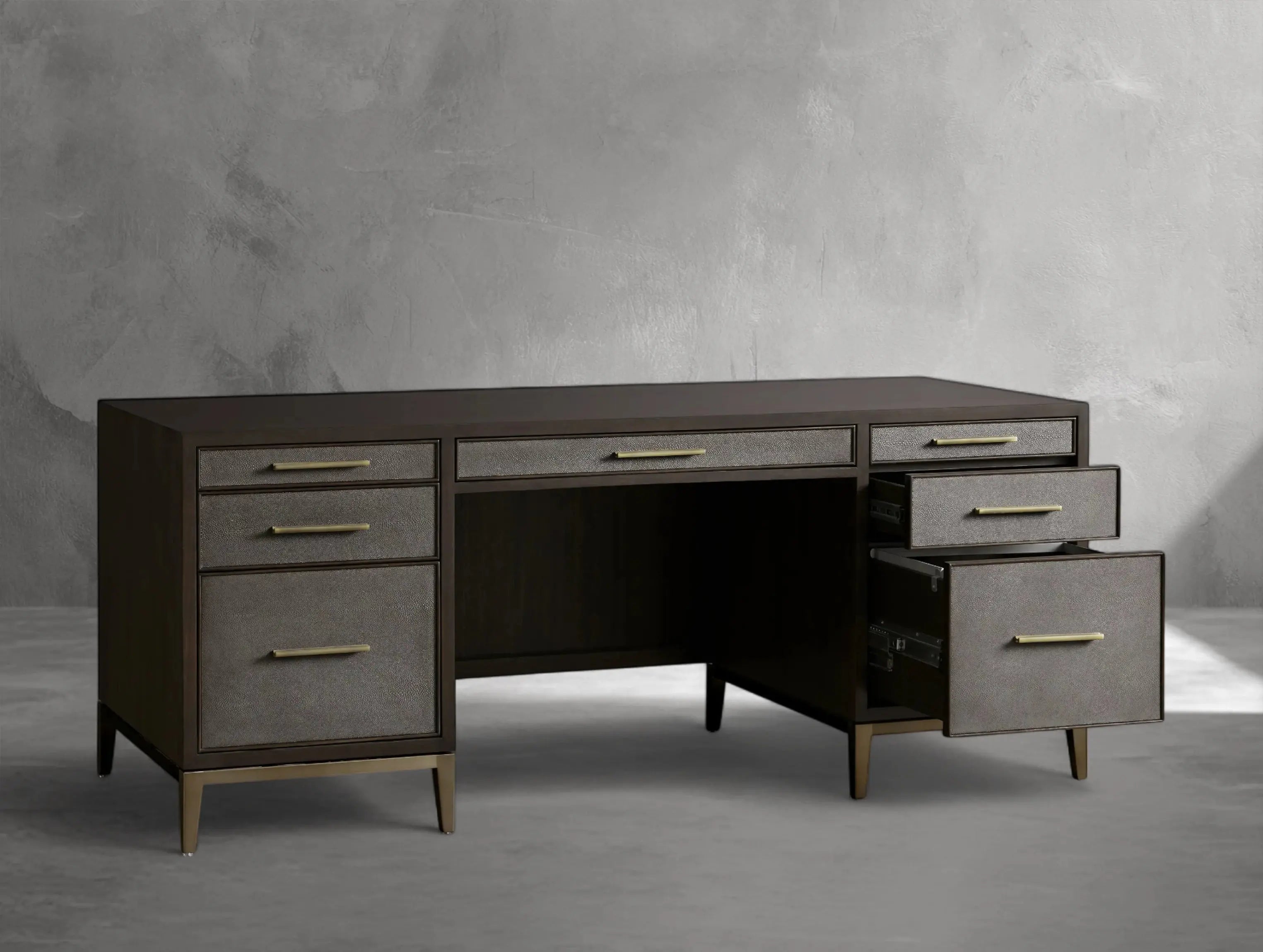 The Ephlou Executive Desk is where modern design meets rich craftsmanship. Built from solid parawood or oak—depending on your selected finish—and surfaced with walnut or elm veneers, it features shagreen-embossed leather insets and a sleek brass-finished steel base.