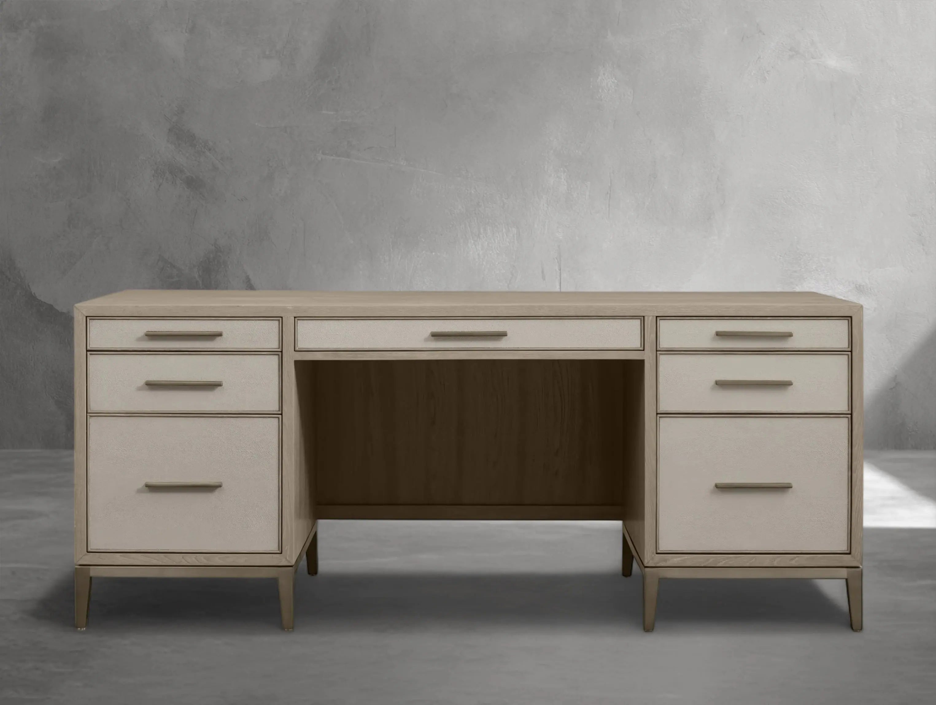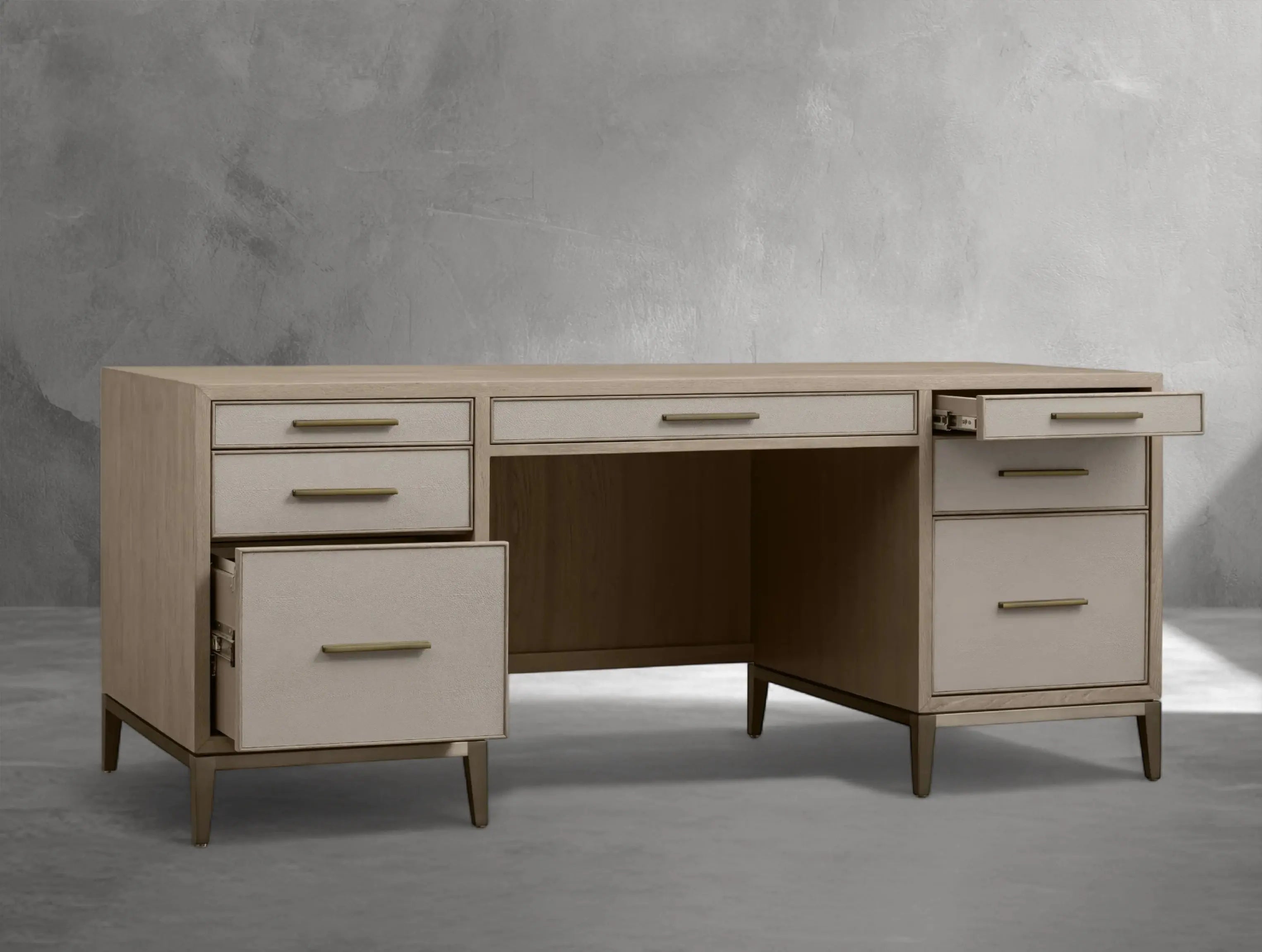 The Ephlou Executive Desk is where modern design meets rich craftsmanship. Built from solid parawood or oak—depending on your selected finish—and surfaced with walnut or elm veneers, it features shagreen-embossed leather insets and a sleek brass-finished steel base.