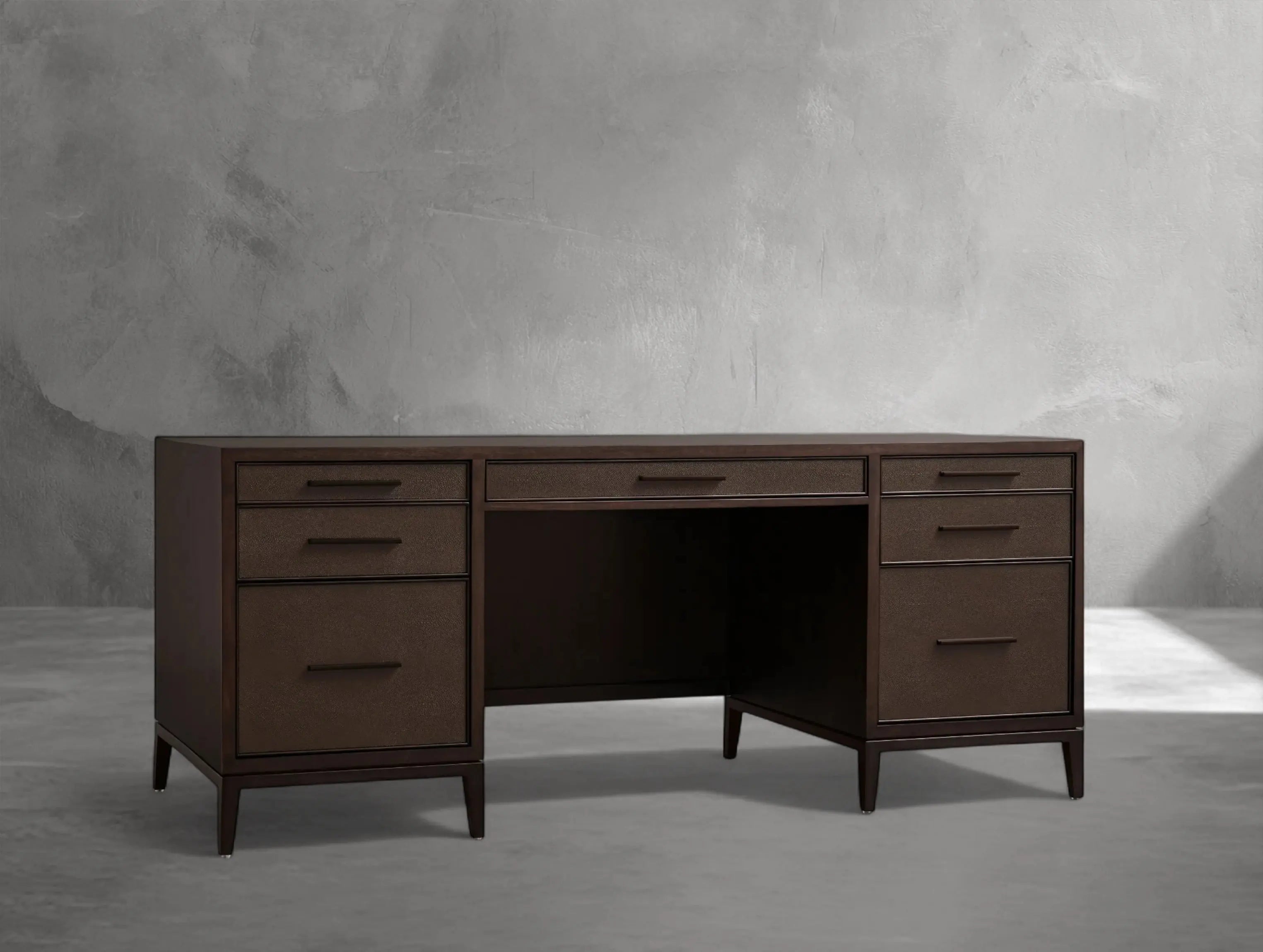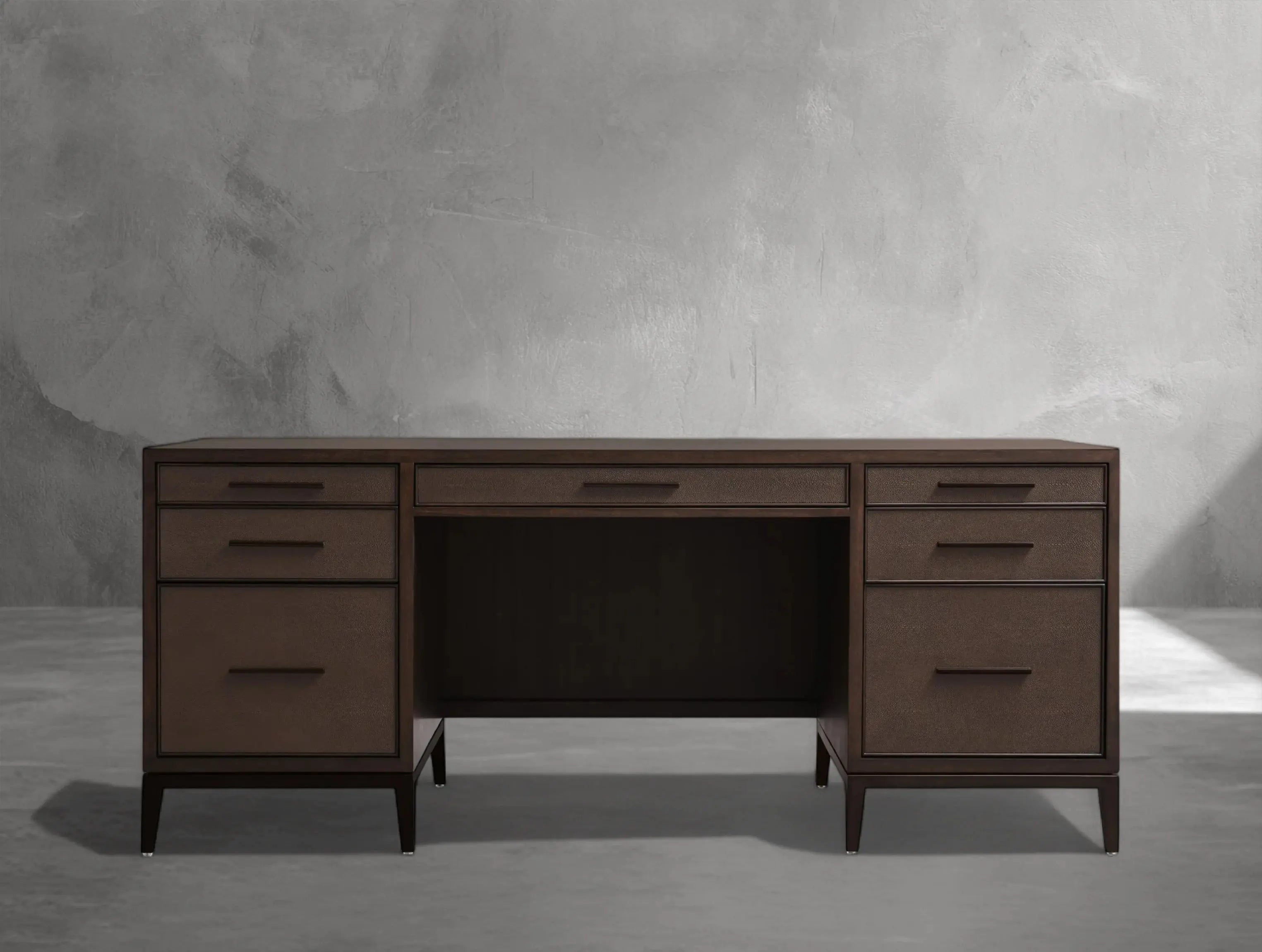 The Ephlou Executive Desk is where modern design meets rich craftsmanship. Built from solid parawood or oak—depending on your selected finish—and surfaced with walnut or elm veneers, it features shagreen-embossed leather insets and a sleek brass-finished steel base.