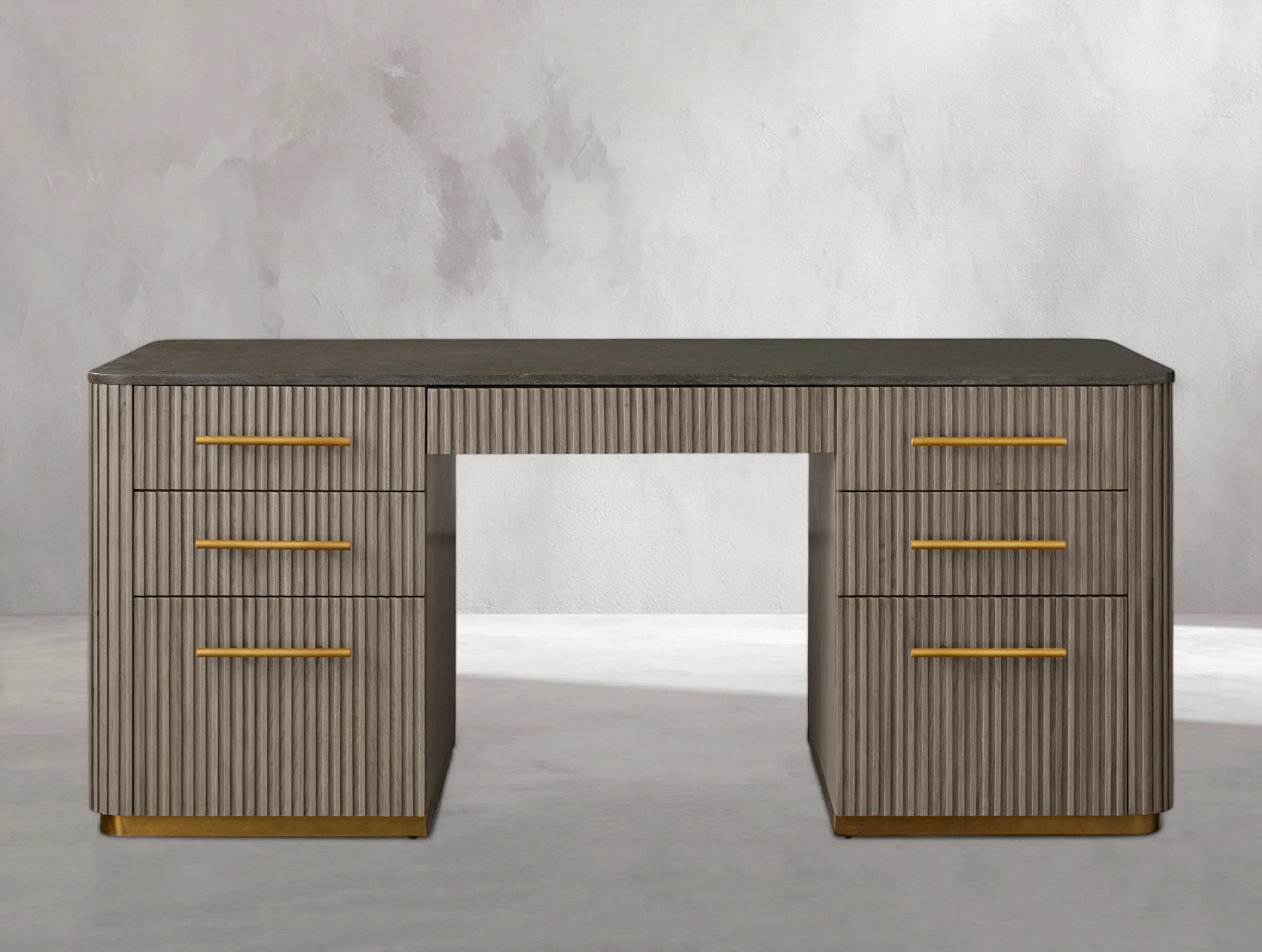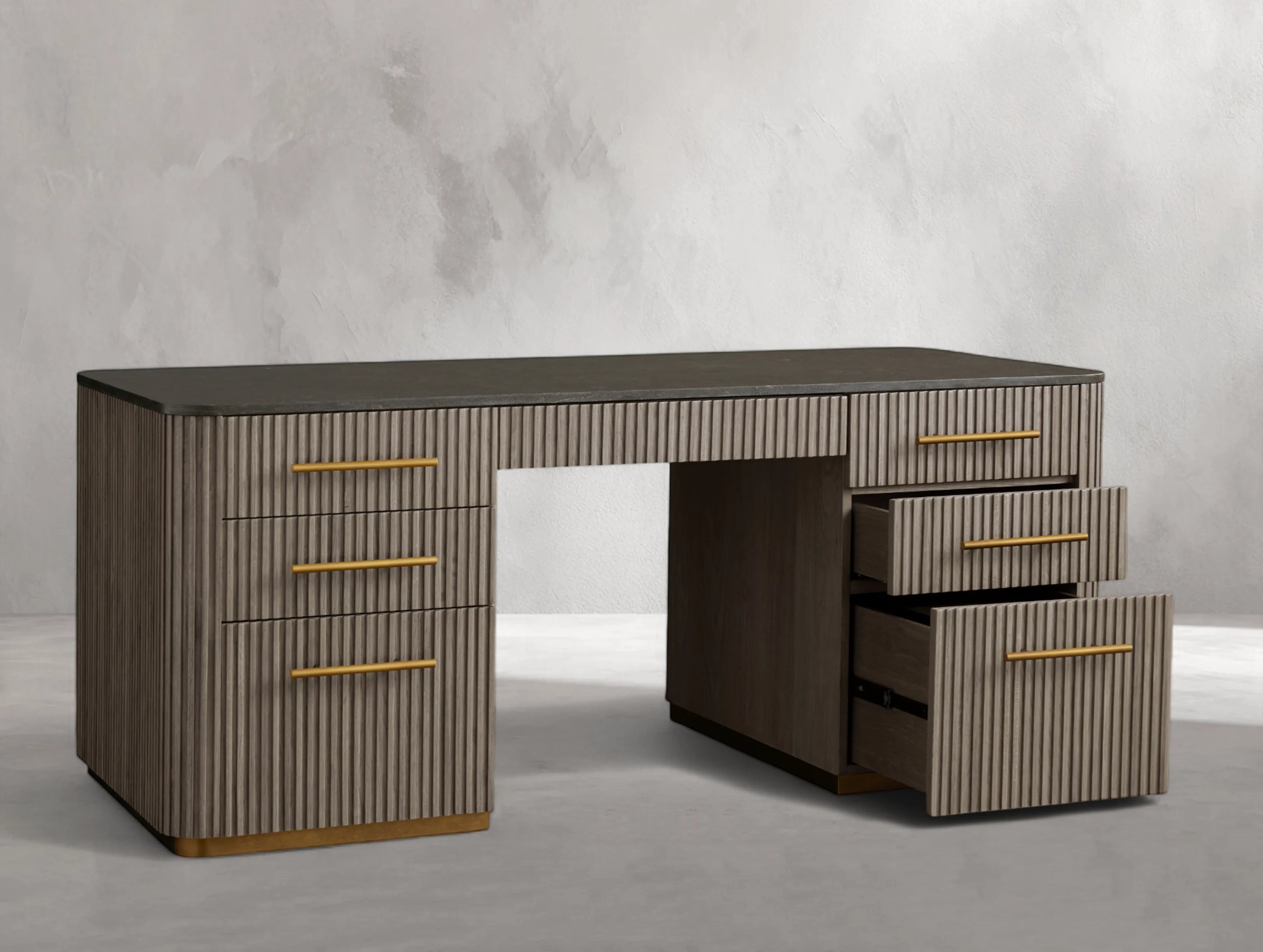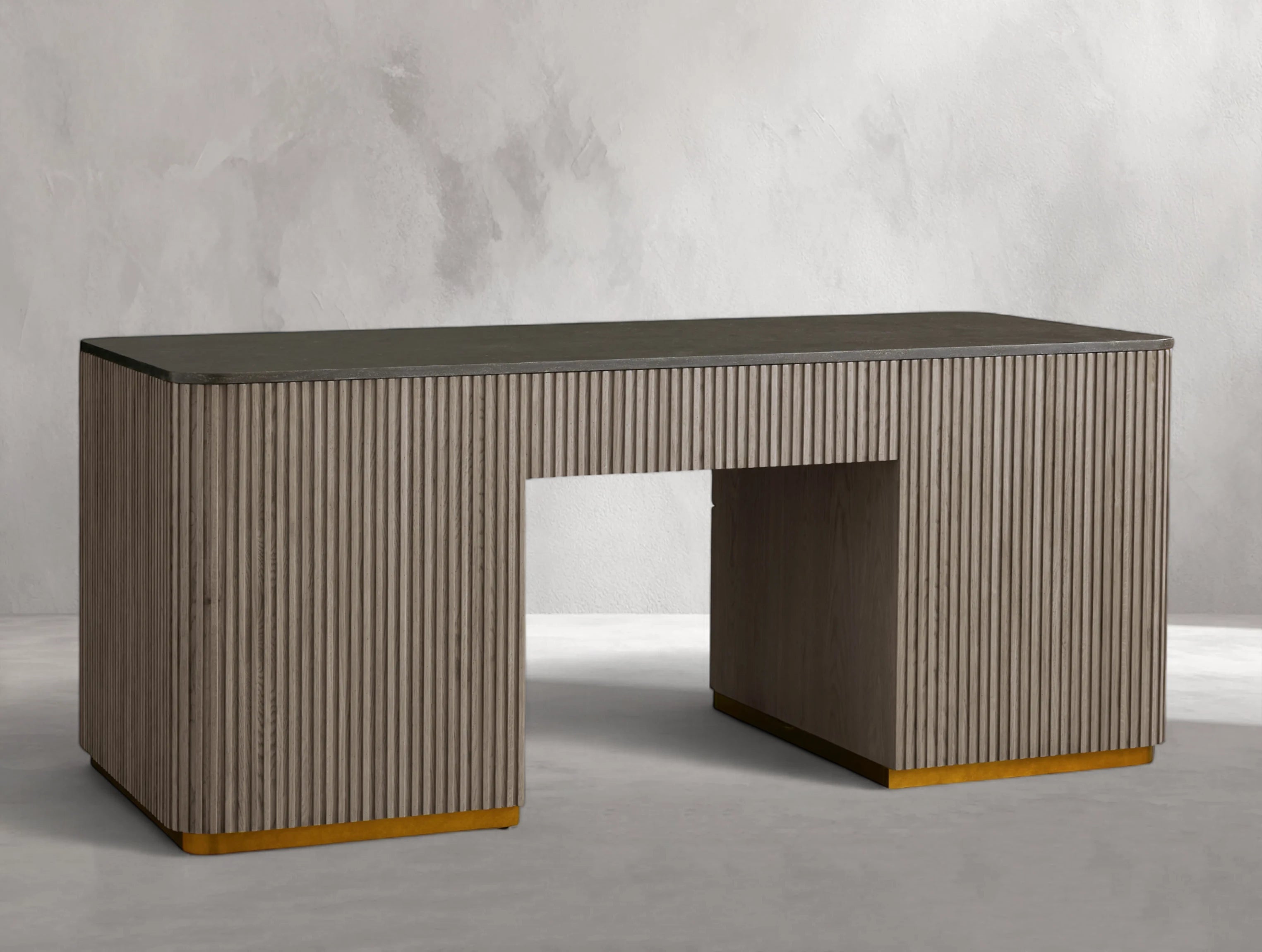 The Rolphin executive desk brings timeless elegance and refined function into your office with a striking mixed-material design. Crafted from hand-finished Finnish pine or European white oak, it is accented with reeded oak detailing, brass hardware, and topped with natural stone. Built with file storage drawers and cord management, this desk is designed for productivity while adding sophistication to your workspace.