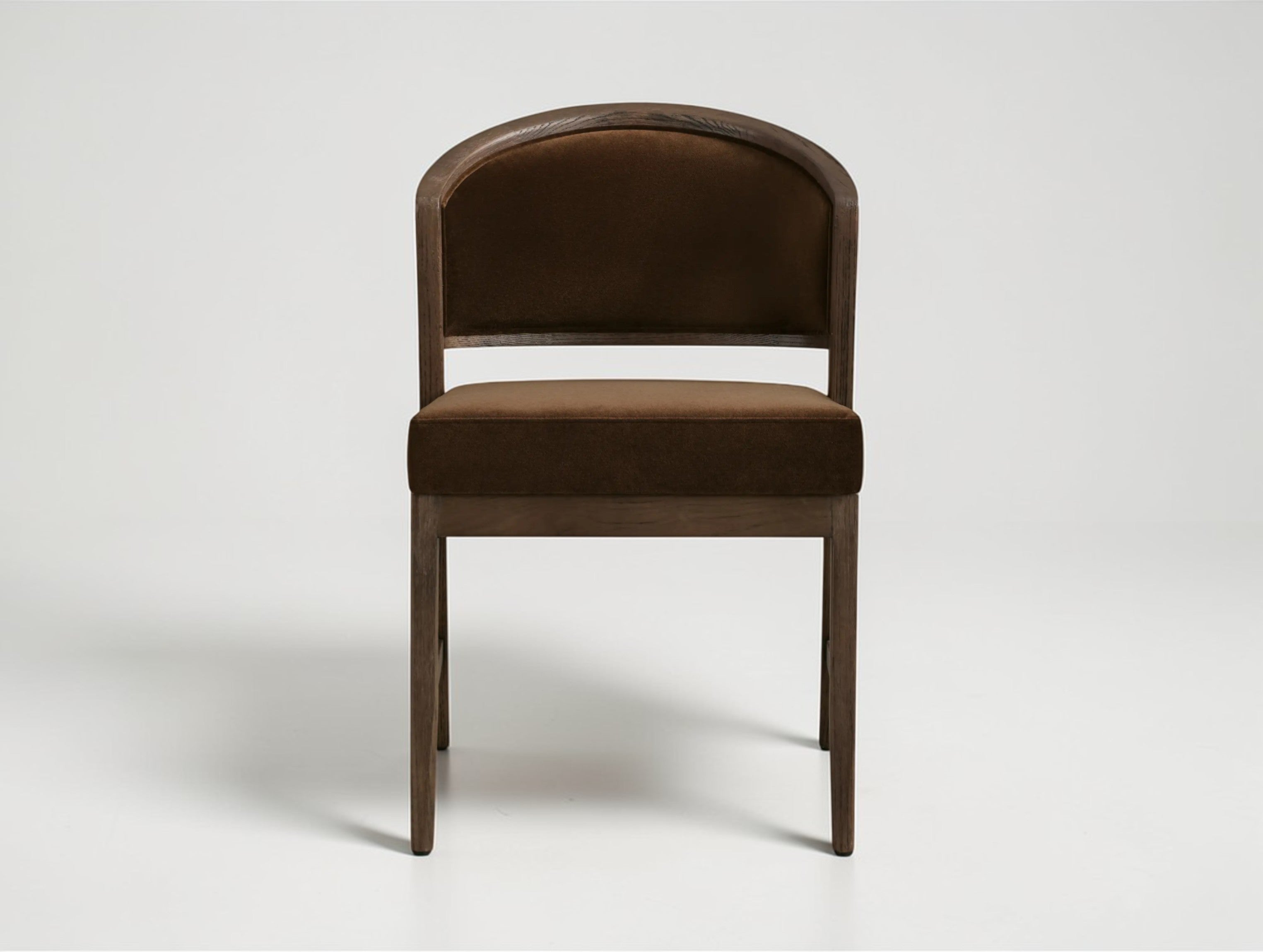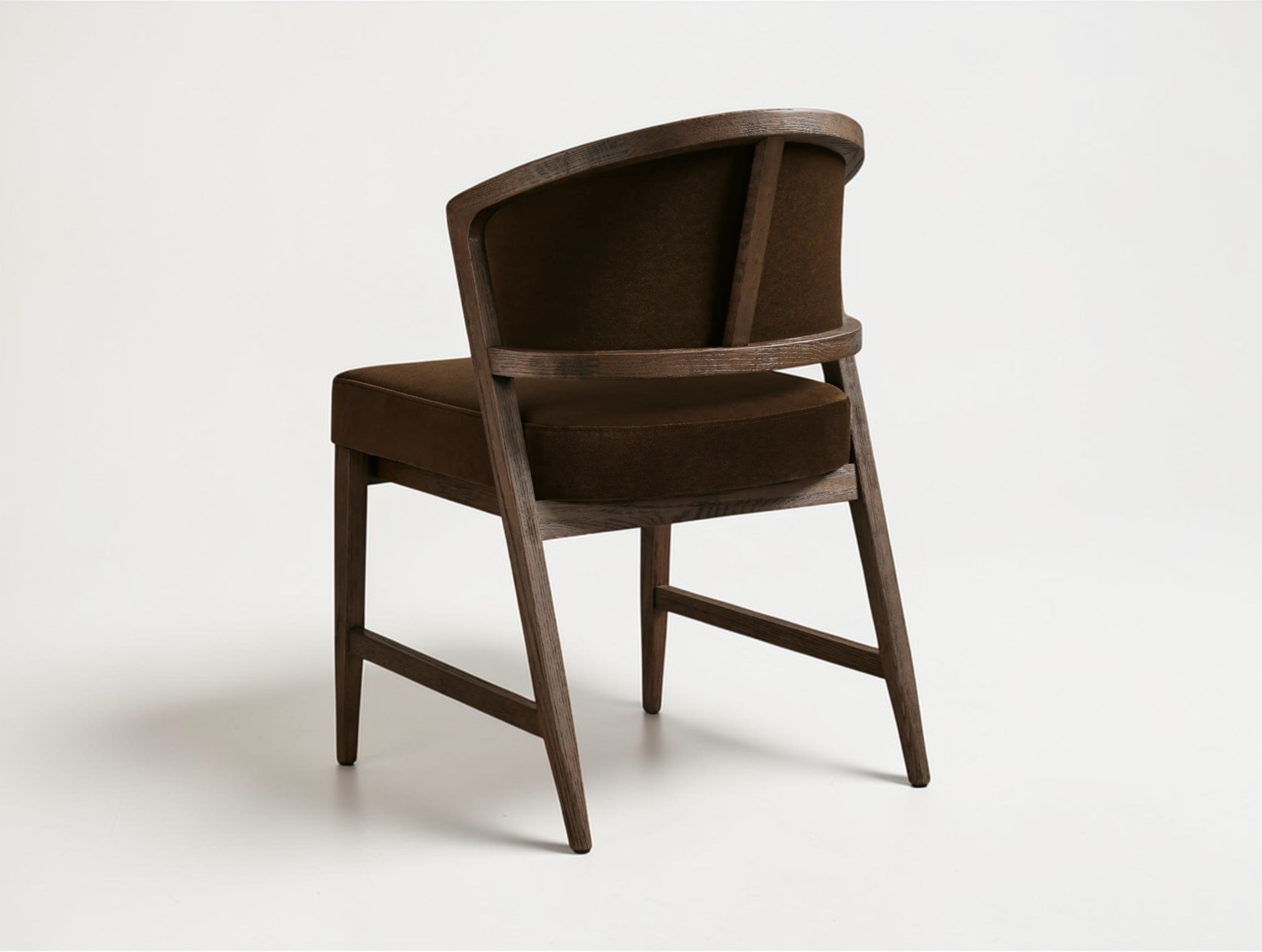 This upholstered dining side chair beautifully blends classic French elegance with midcentury modern design. The softly curved back and flared legs create a sculptural, balanced silhouette, while the solid oak frame offers lasting durability. Generously upholstered back and seat cushions ensure exceptional comfort, making it a versatile and stylish choice for dining rooms, kitchens, or study spaces.