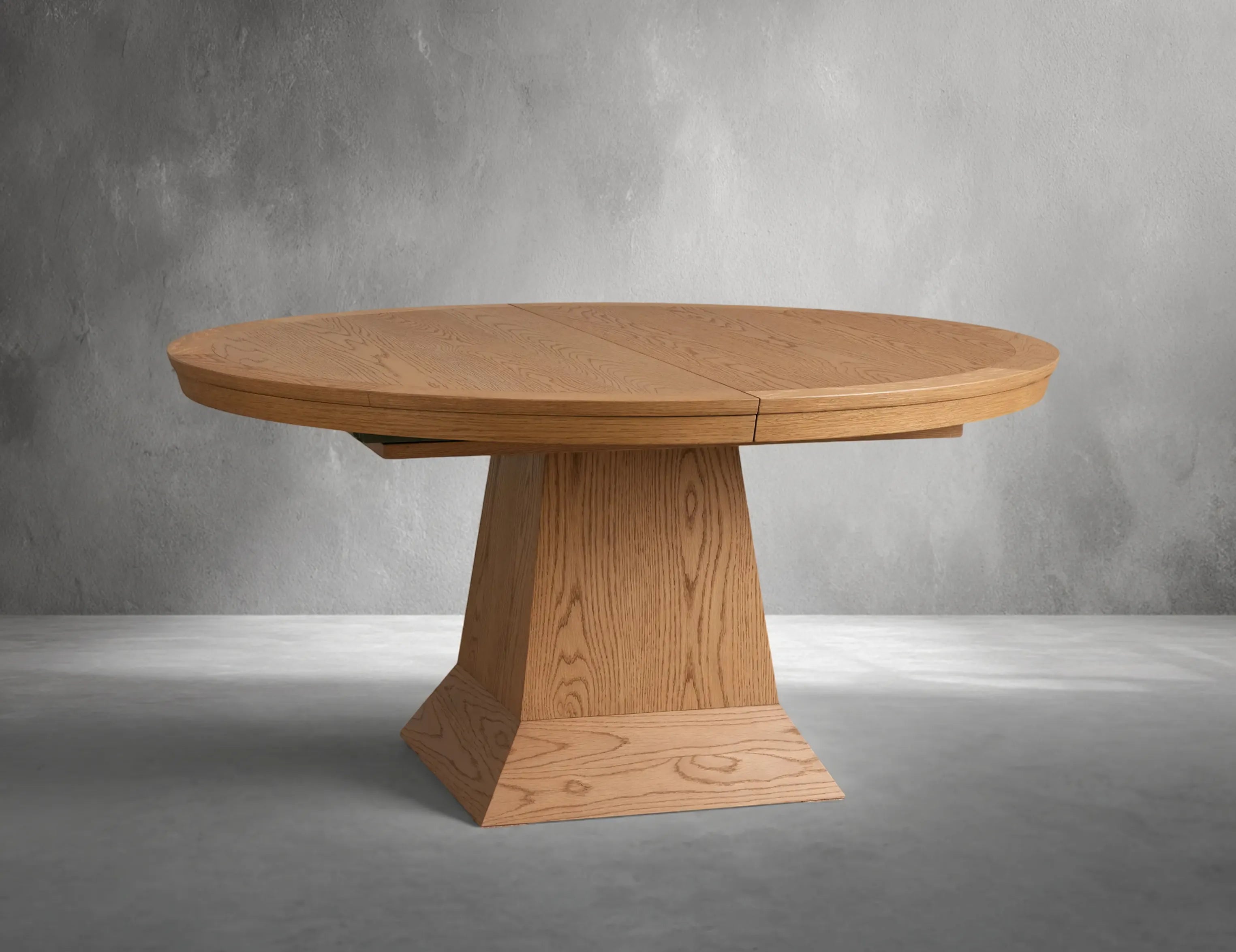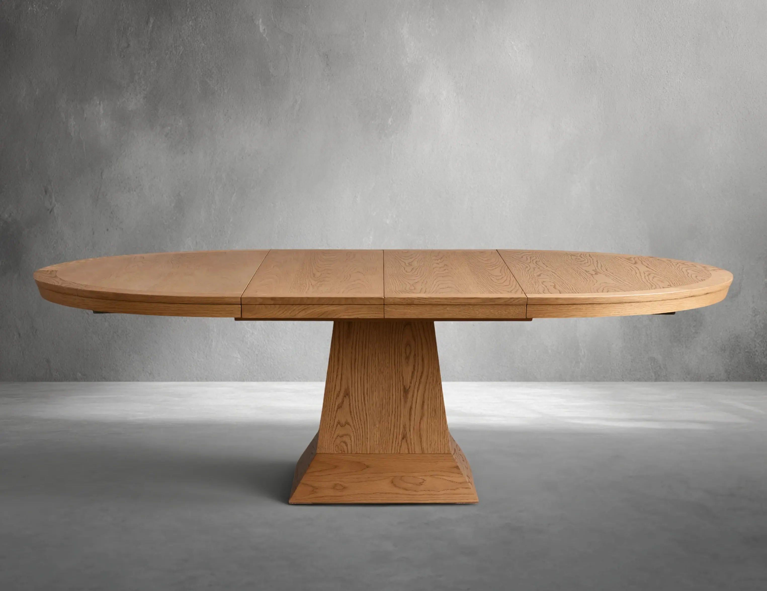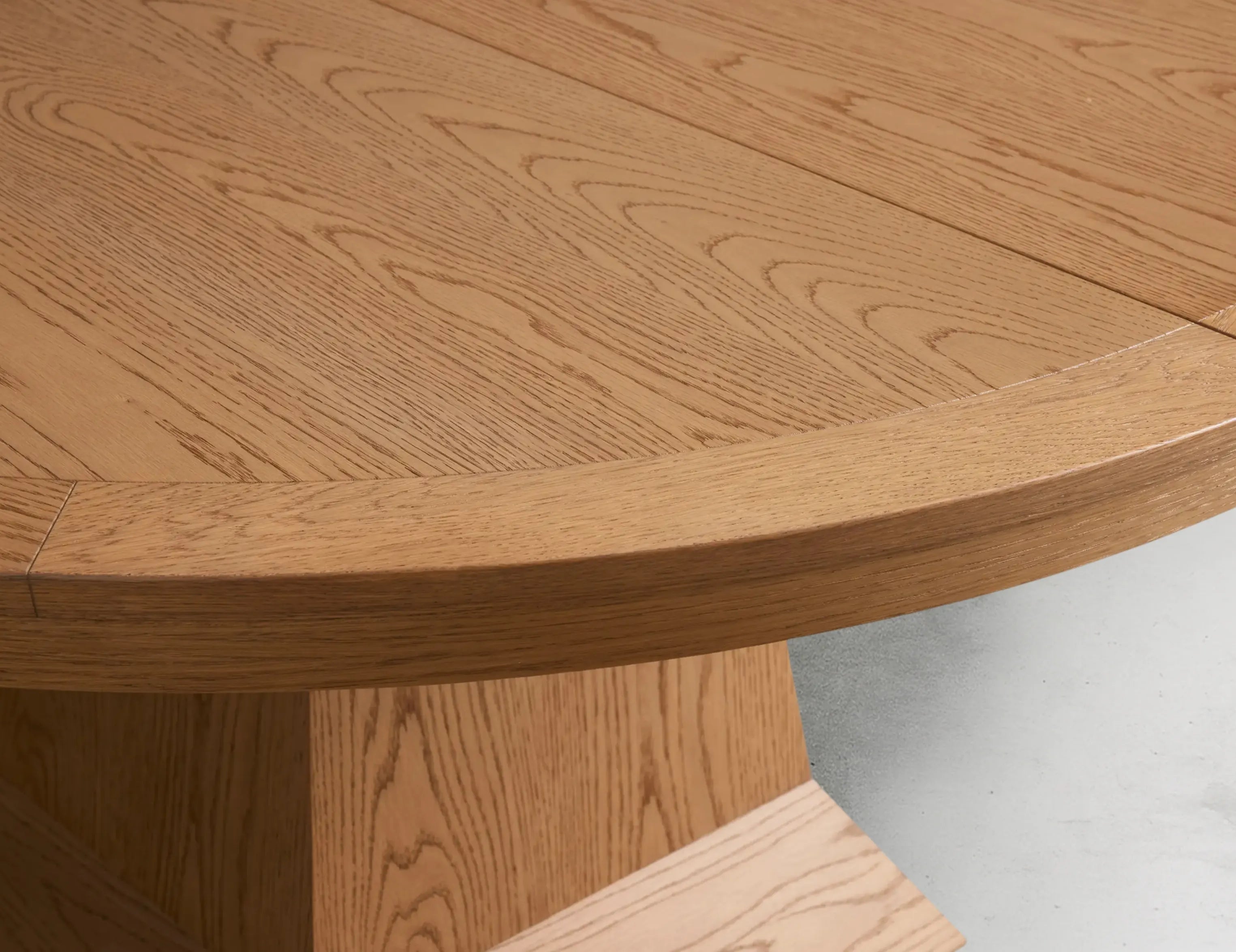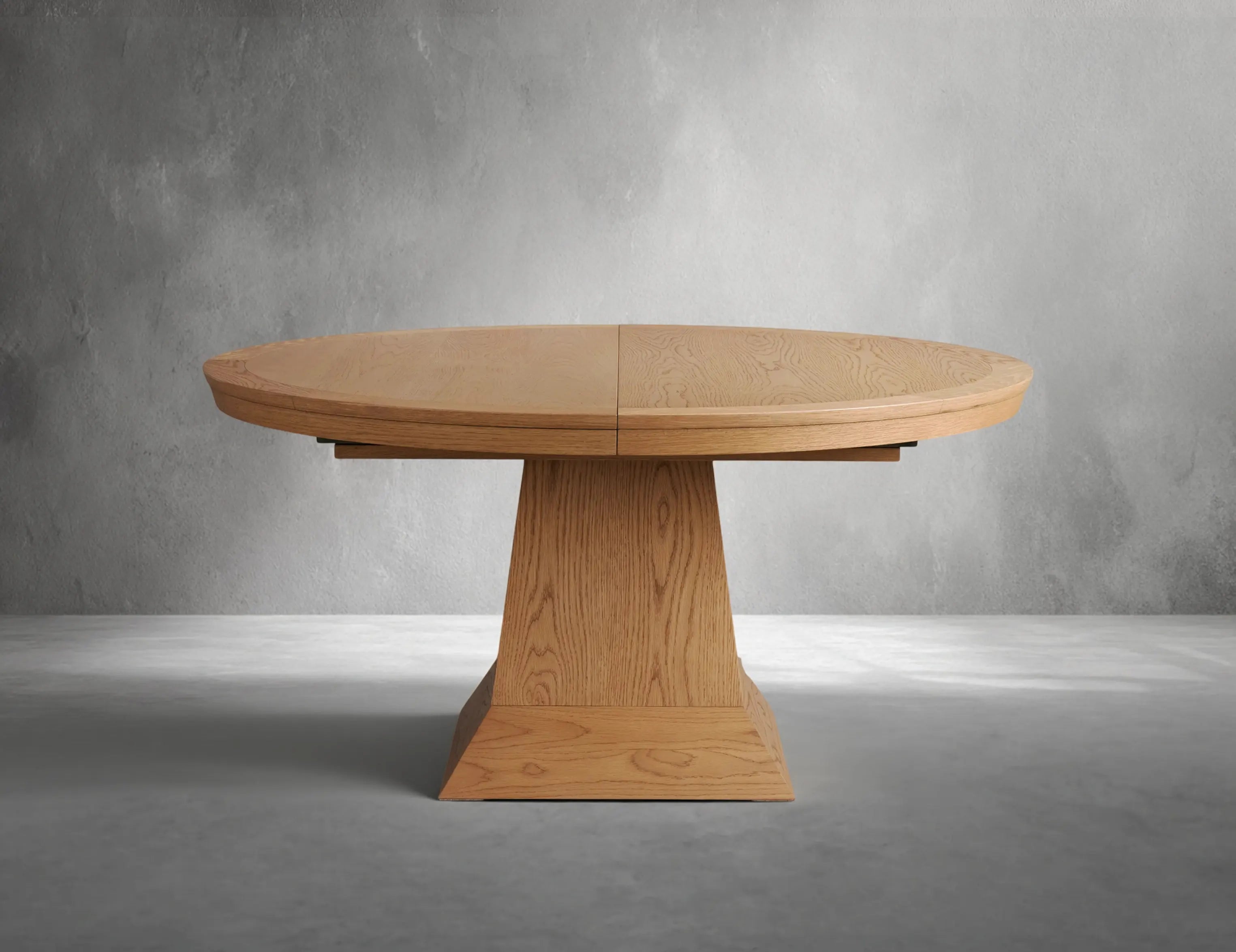 The Laindton Extension Dining Table blends timeless craftsmanship with flexible, modern functionality. Its sculpted pedestal base and hand-finished surfaces showcase the natural movement of the wood, bringing warmth and presence to any dining space. Each table is handcrafted in Chinese by skilled artisans who sand, stain, glaze, and lacquer the surface entirely by hand—creating depth, texture, and subtle variations that make every piece distinctive.