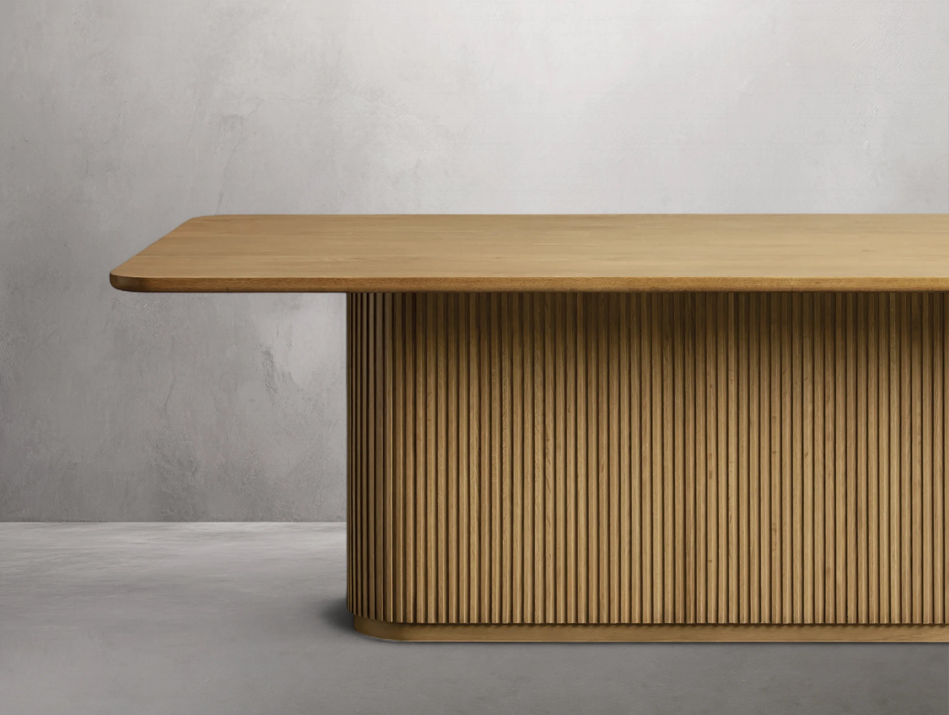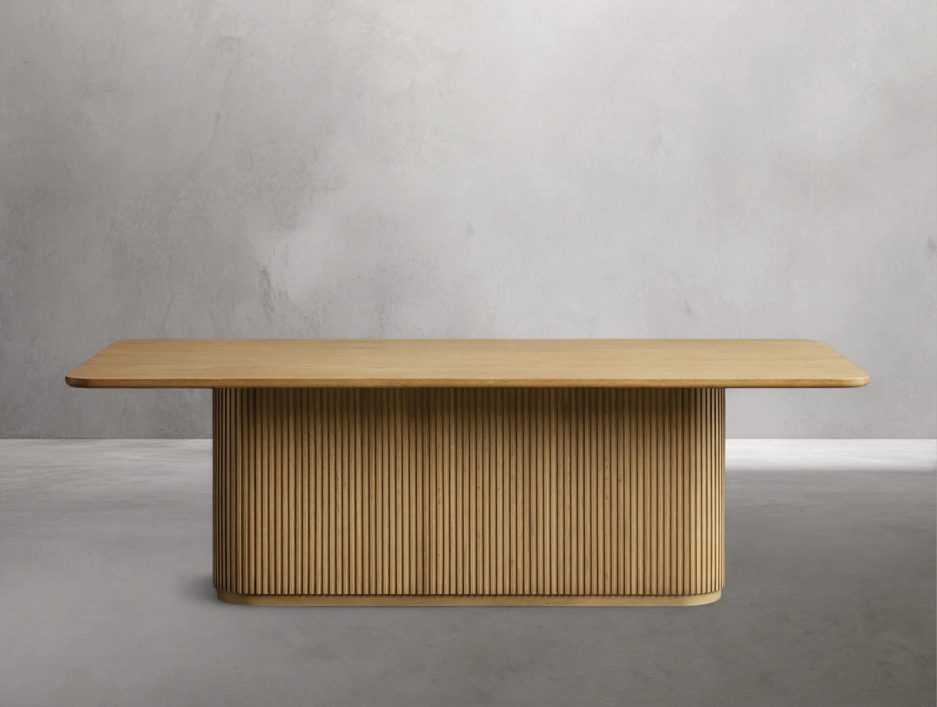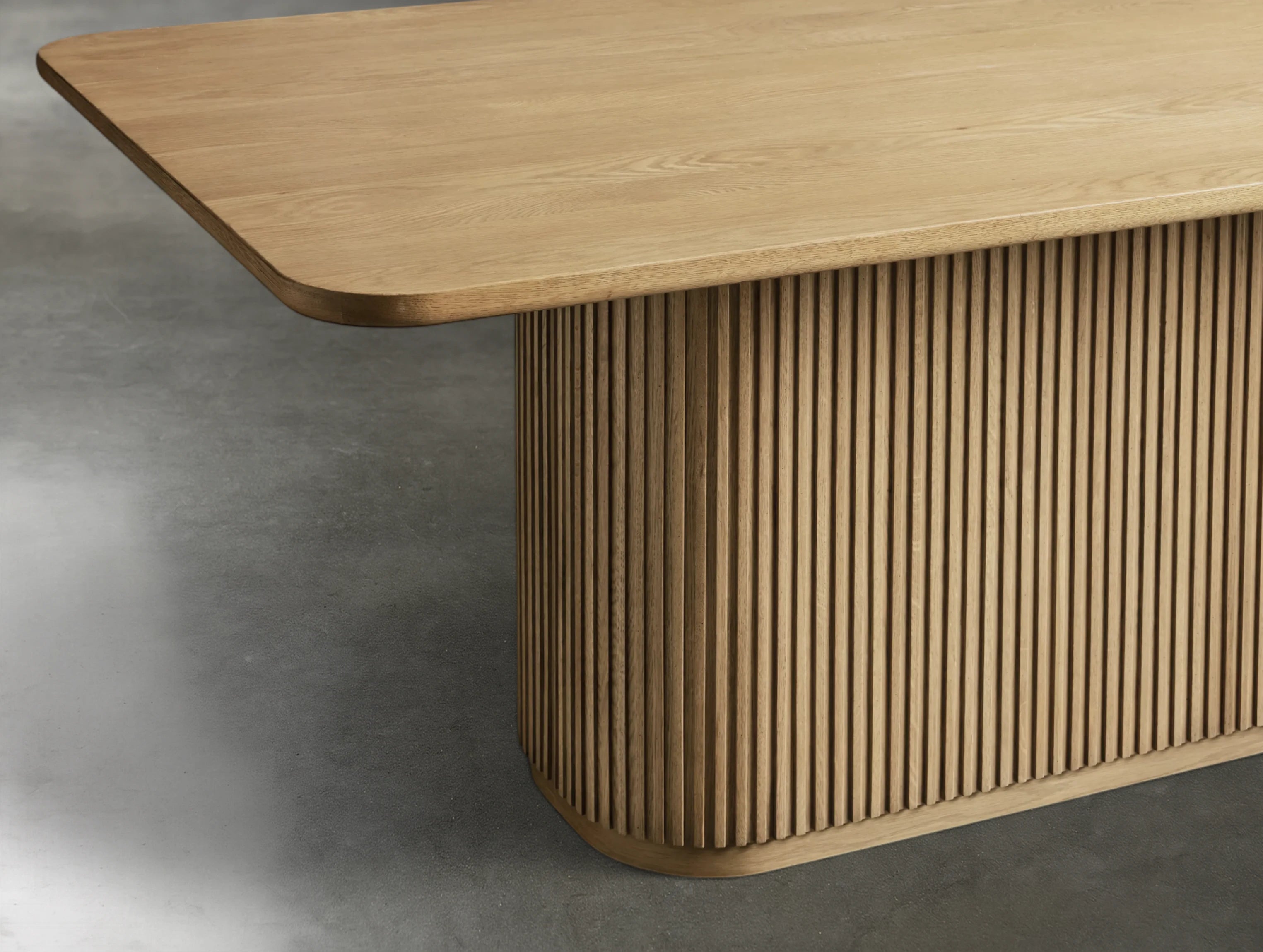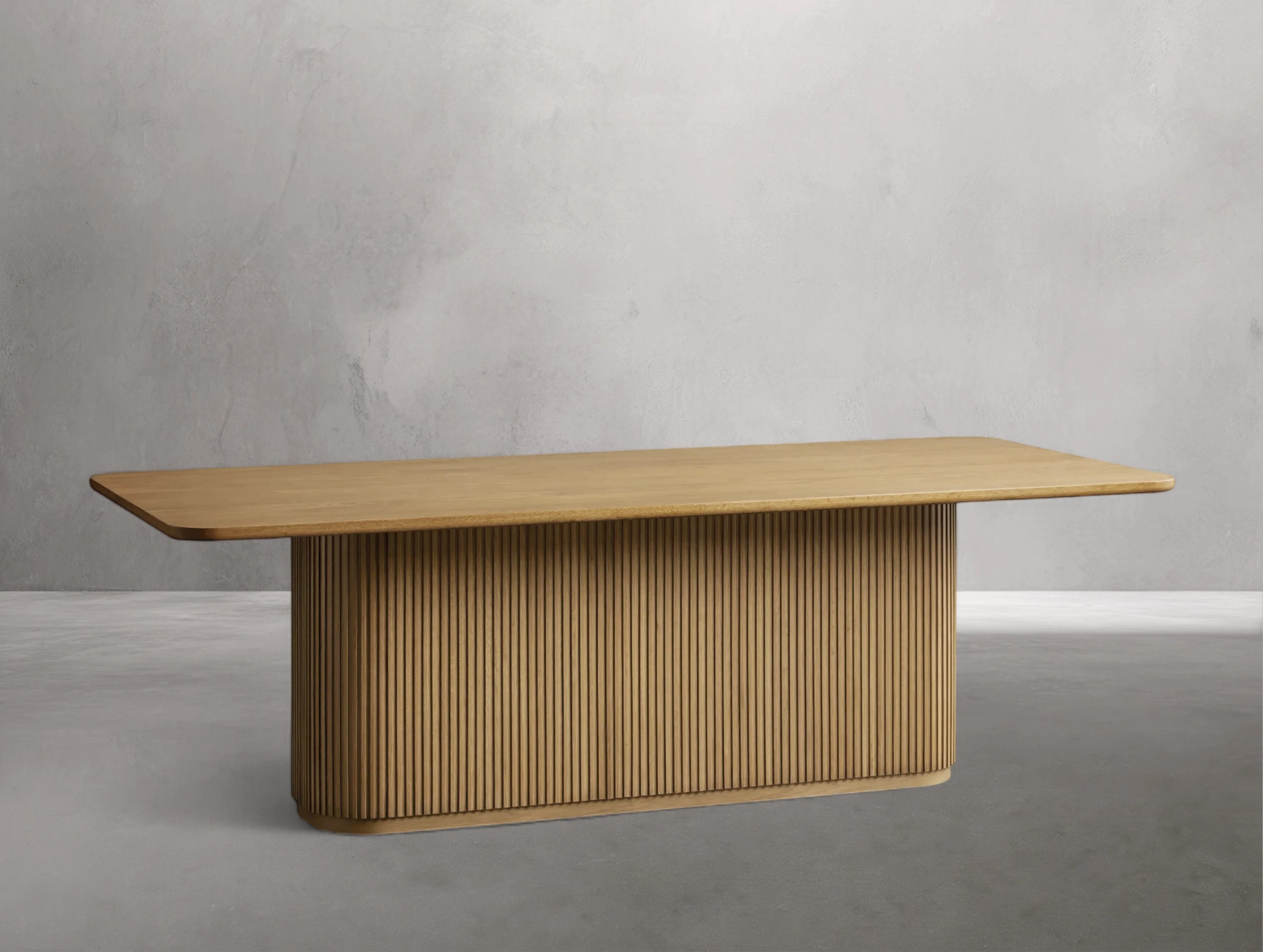 The Rolphin wood dining table showcases a refined reeded design that instantly elevates any dining space. Crafted by skilled artisans from hand-finished Finnish pine or premium white oak, it blends natural warmth with timeless style—making it perfect for long, lingering gatherings. Each piece is carefully finished to highlight the wood’s beauty while ensuring durability for years to come.