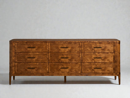 This nine-drawer dresser highlights the expressive beauty of mappa burl through a refined silhouette defined by gentle curves and tapered legs. Rich swirling grain patterns add warmth and depth, while antique brass hardware introduces a subtle vintage-inspired accent. Designed for both function and elegance, it features spacious drawers with soft-close glides, making it a sophisticated storage solution for modern bedrooms.