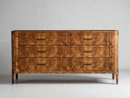 This six-drawer dresser highlights the expressive beauty of mappa burl through a refined silhouette with gentle curves and tapered legs. Rich swirling grain patterns bring warmth and depth, while antique brass hardware adds a subtle vintage-inspired accent. Designed for both function and elegance, it features spacious soft-close drawers and a balanced profile that complements a wide range of bedroom interiors.