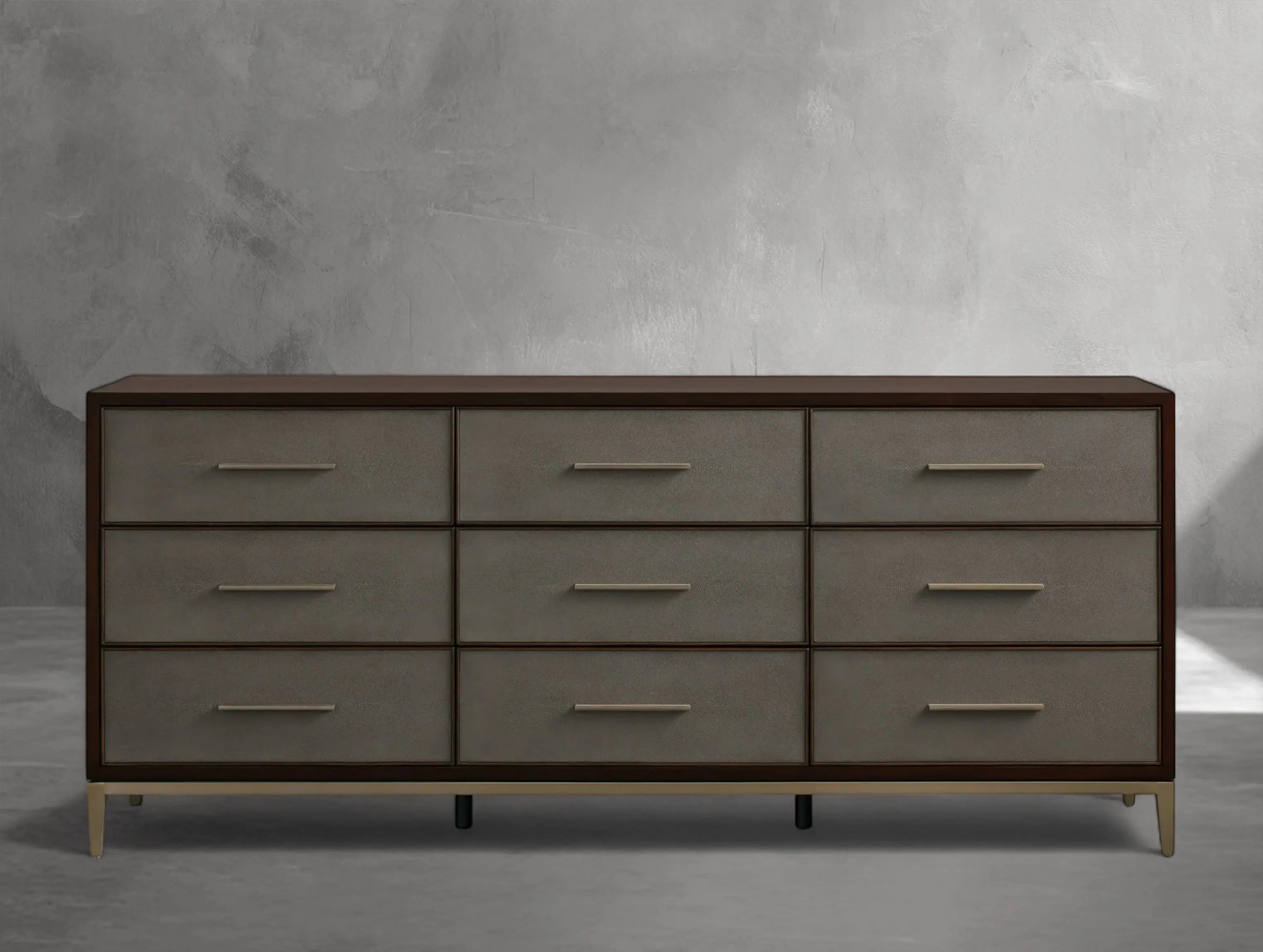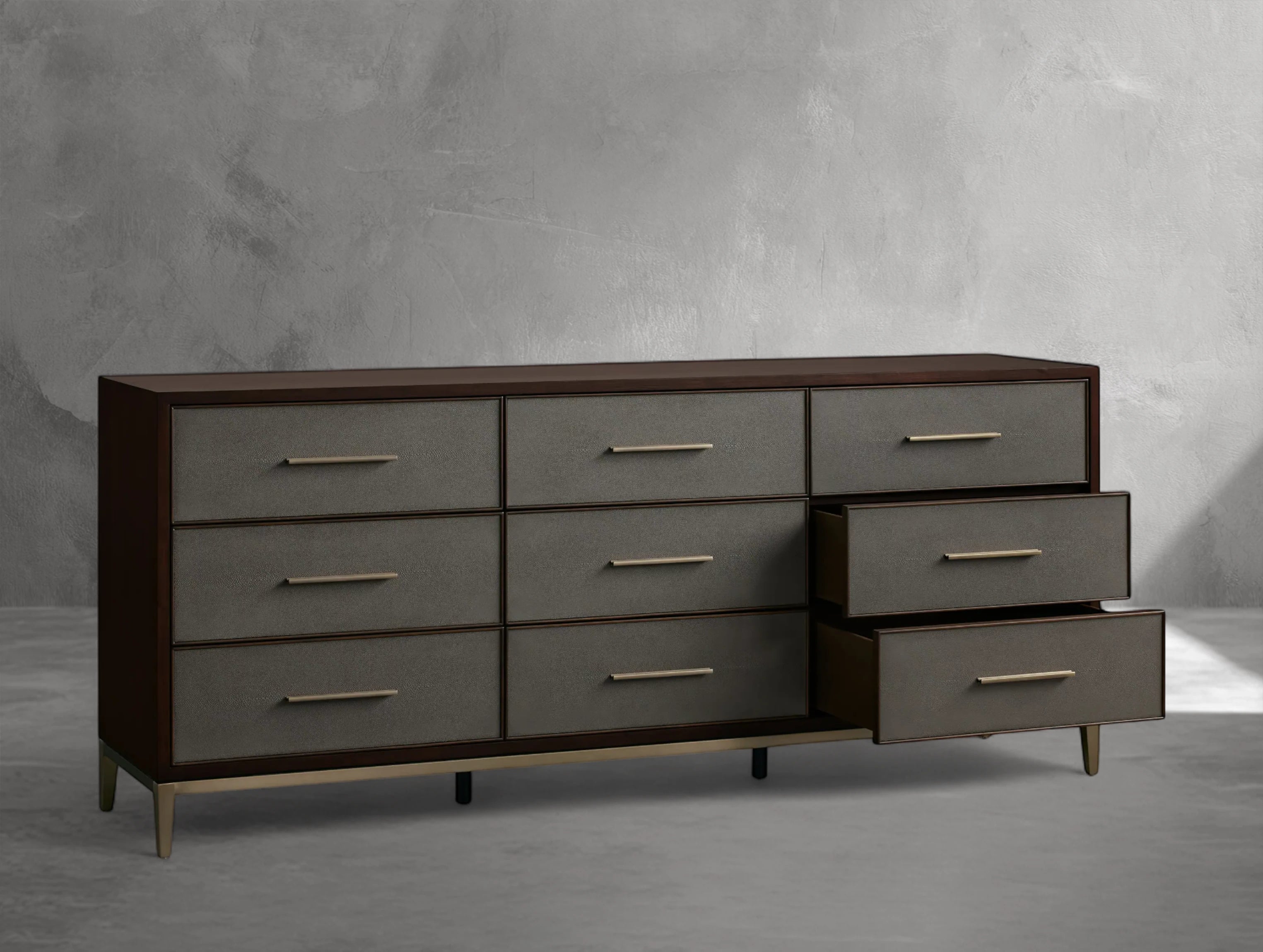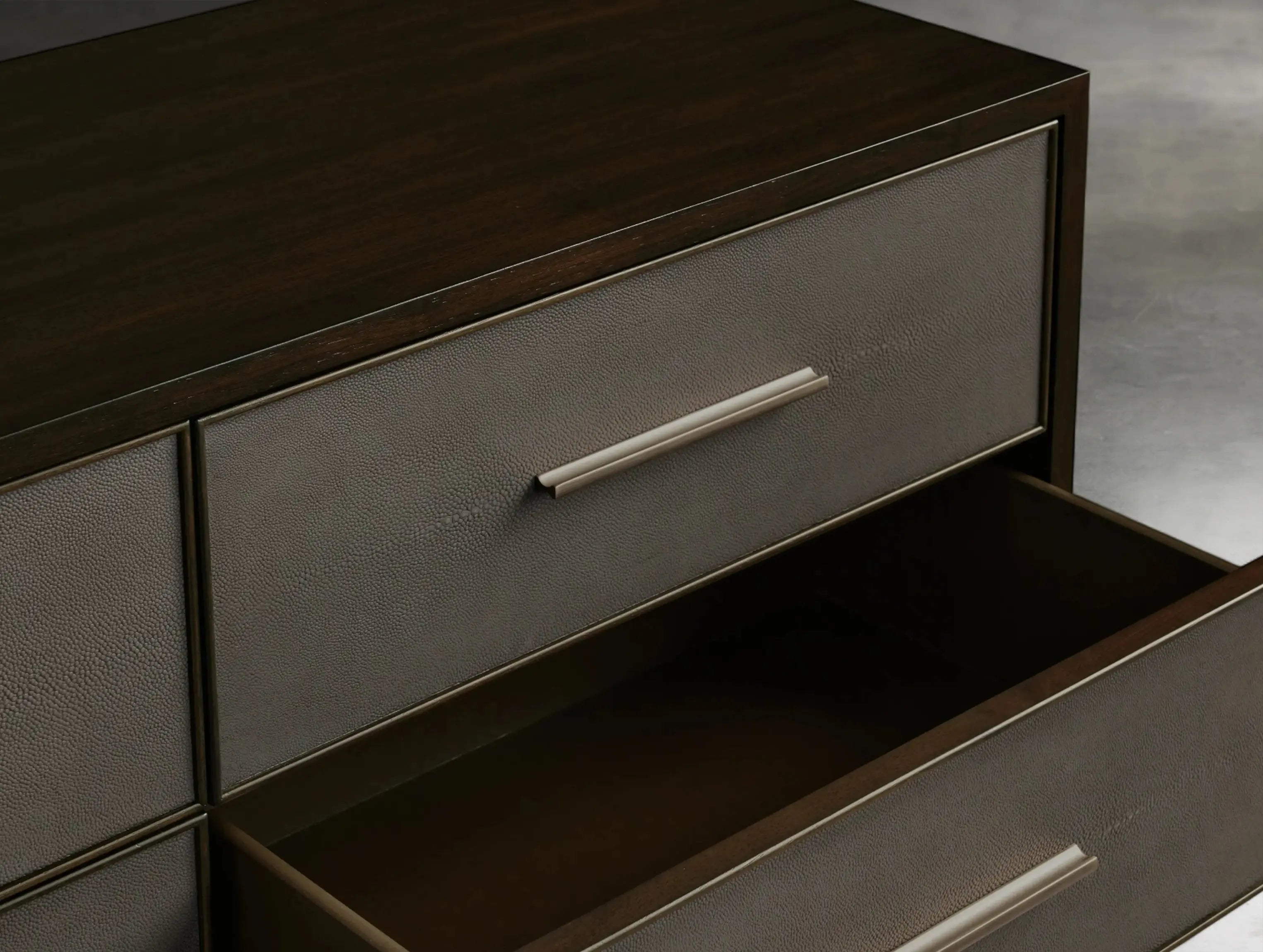 The Ephlou Nine-Drawer Dresser is a modern classic—sleek in profile, rich in detail. Artisan-crafted from solid parawood or oak and surfaced with walnut or elm veneers, its expansive storage is enhanced by shagreen-embossed leather insets and hand-applied finishes.