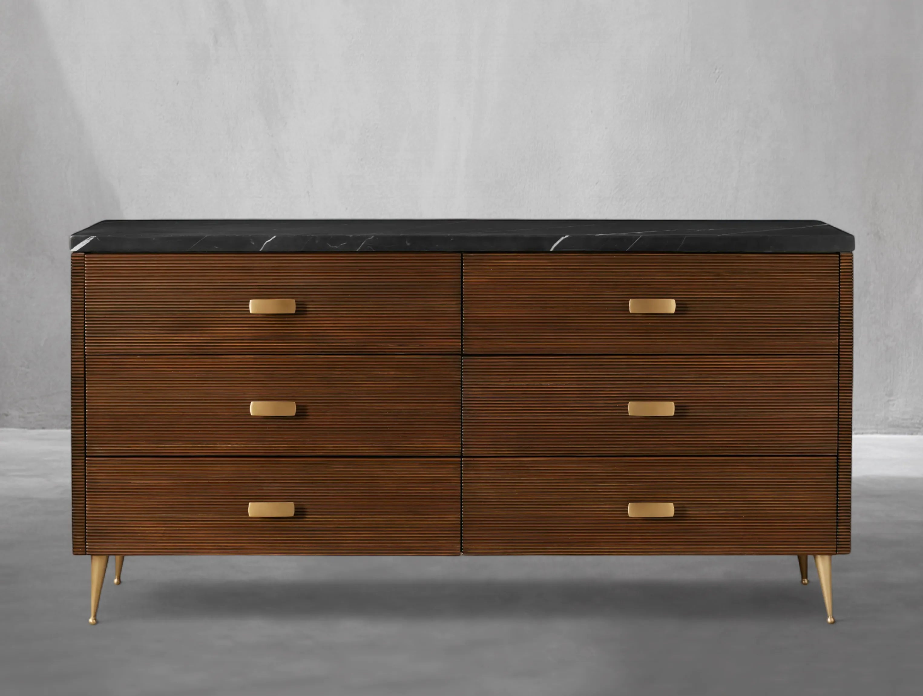 Timeless elegance meets modern texture in the Gilce Six-Drawer Dresser. Inspired by antique European design, its fluted mahogany frame is finished in rich Canaletto tones, paired with a swirling black Marquina veneer top for striking contrast. Brass hardware and soft-close drawers elevate both its style and function—offering ample, refined storage for any bedroom.