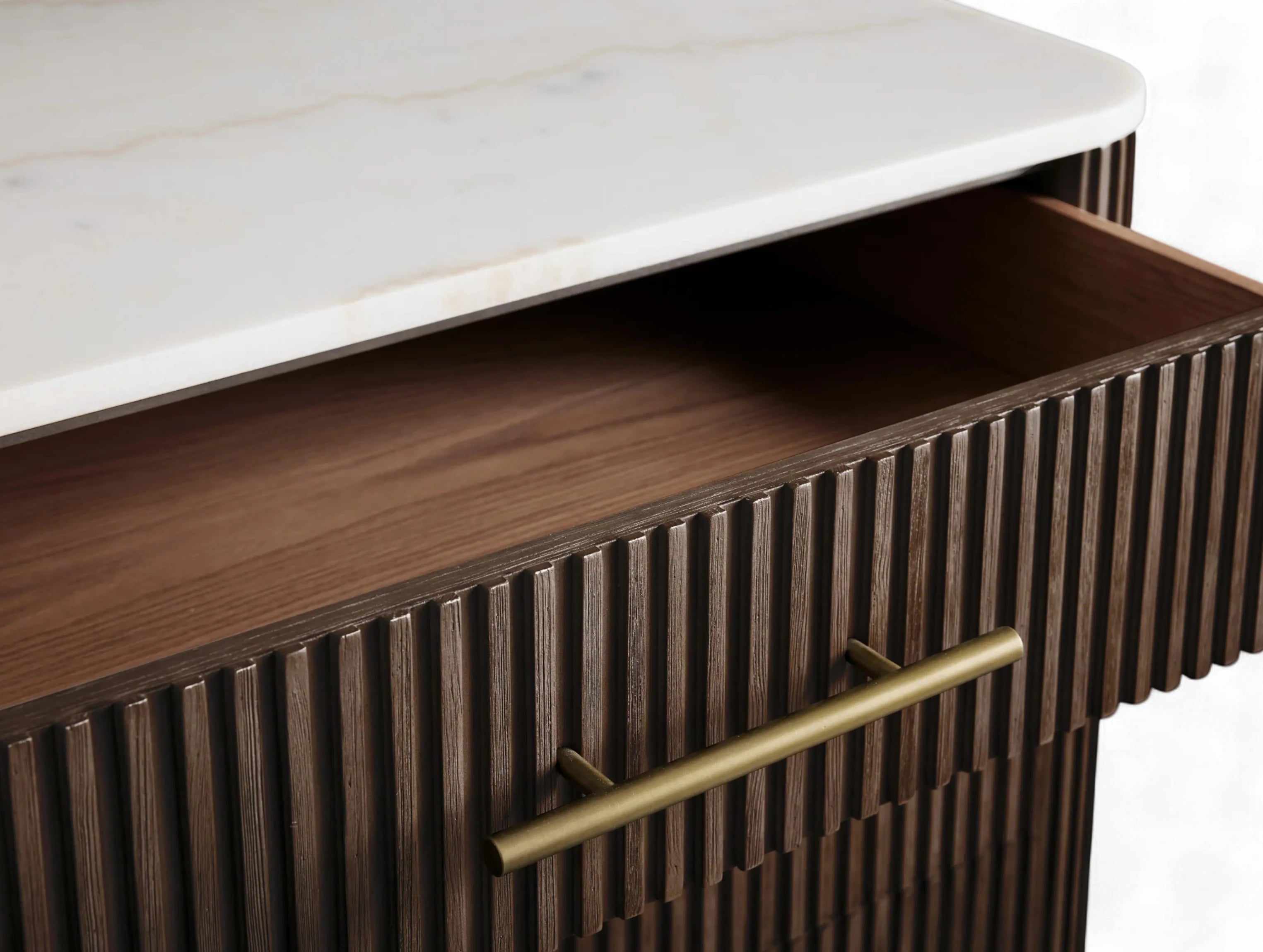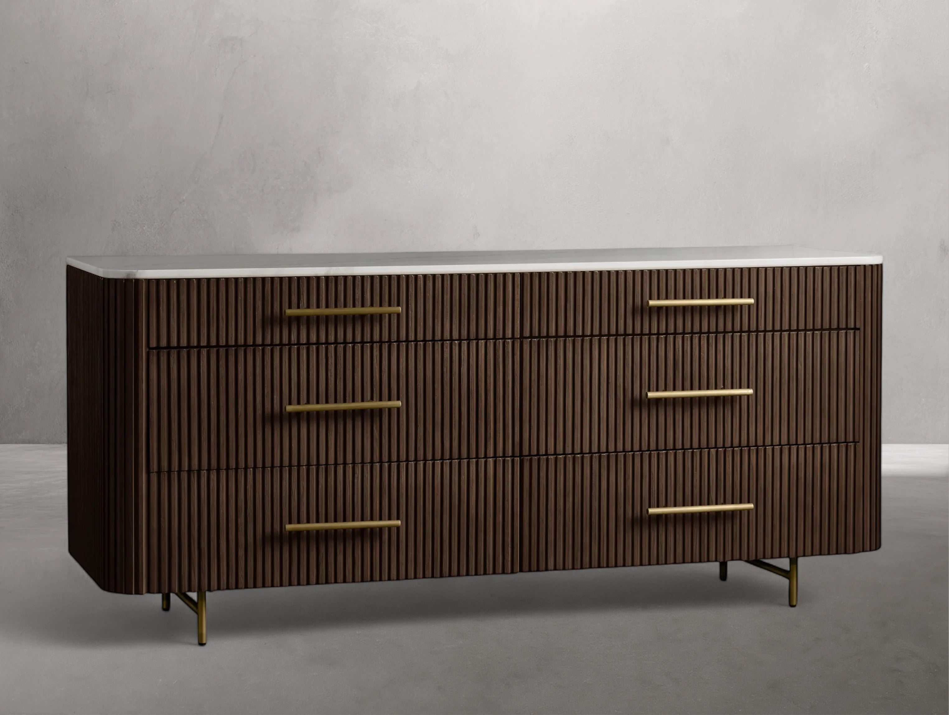 The Rolphin six-drawer dresser blends natural textures with refined elegance in a striking mixed-material design. Hand-finished Finnish pine or premium white oak is enhanced with reeded oak detailing and topped with your choice of Carrara marble, white marble, or bluestone. Crafted by skilled artisans, this dresser offers ample storage with a timeless look that elevates any bedroom.