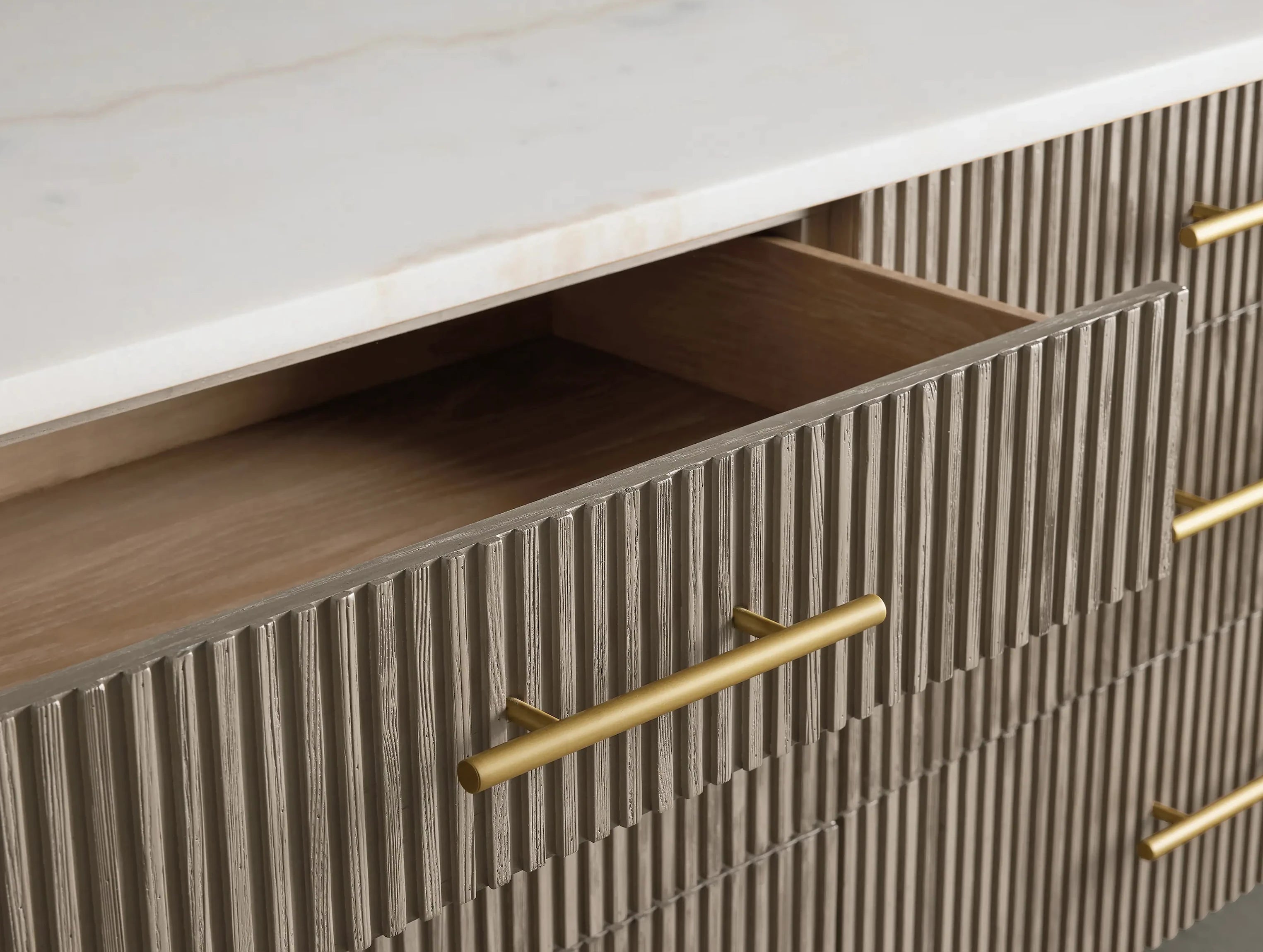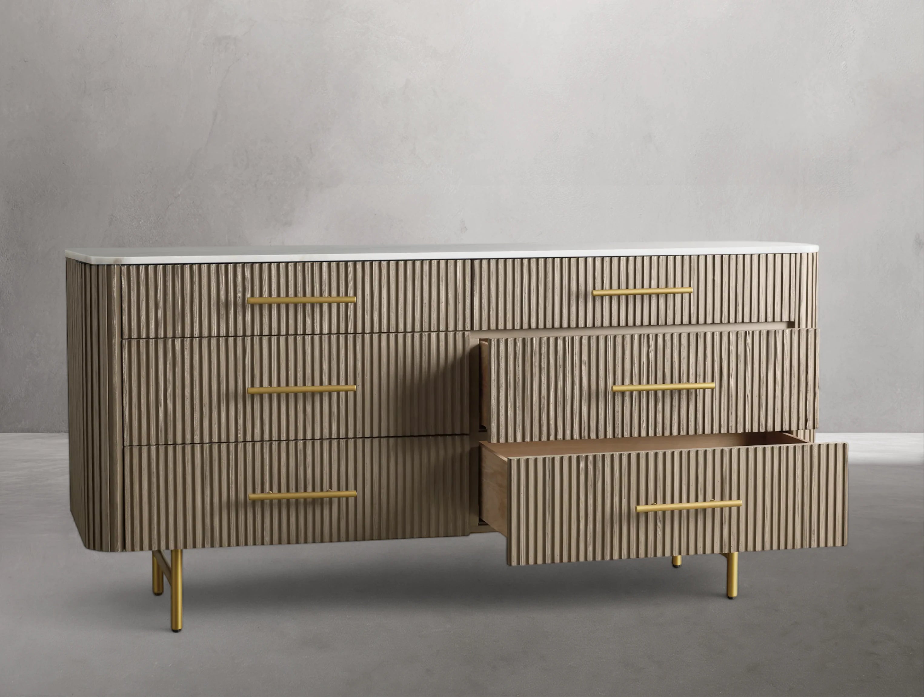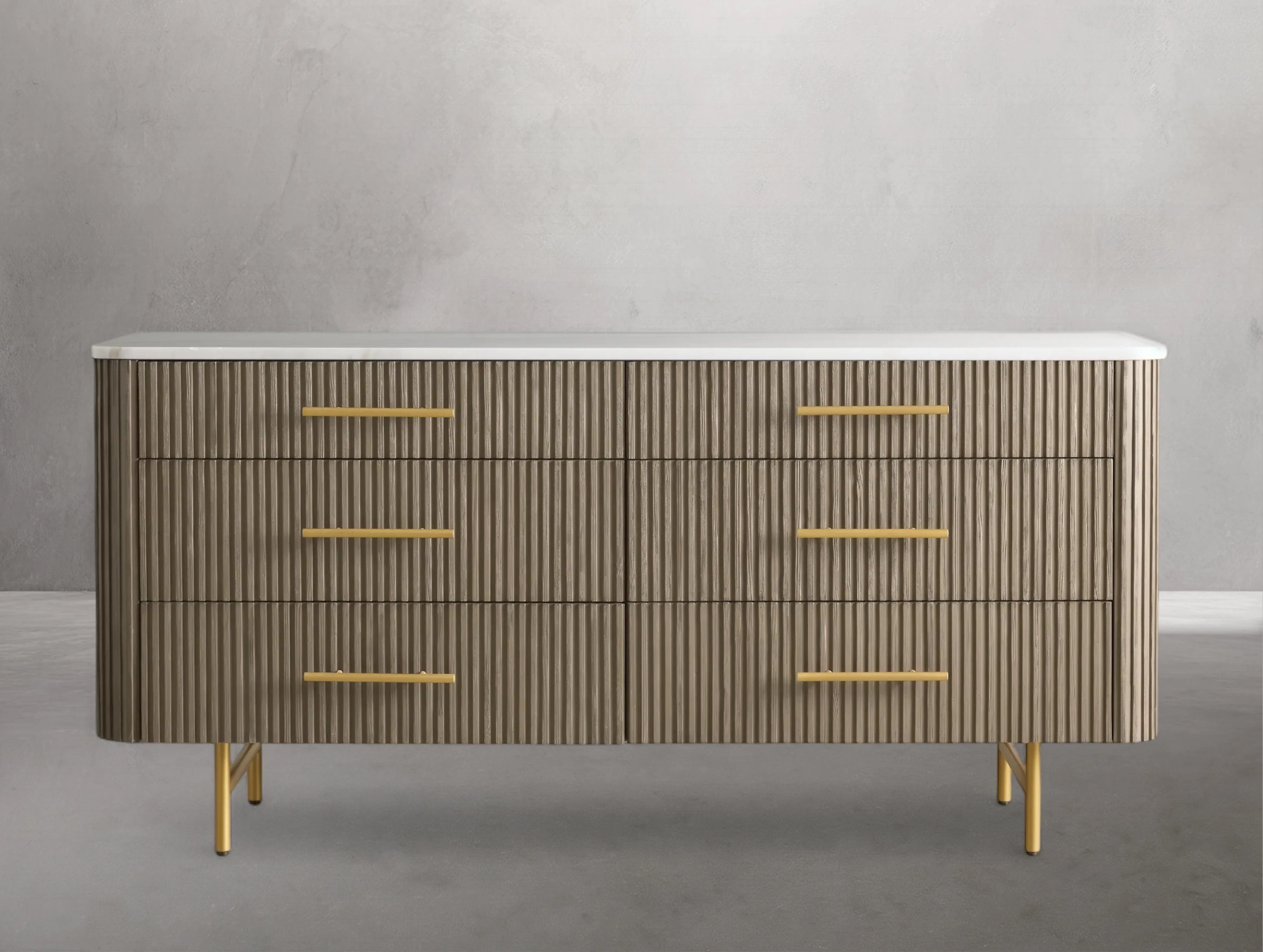 The Rolphin six-drawer dresser blends natural textures with refined elegance in a striking mixed-material design. Hand-finished Finnish pine or premium white oak is enhanced with reeded oak detailing and topped with your choice of Carrara marble, white marble, or bluestone. Crafted by skilled artisans, this dresser offers ample storage with a timeless look that elevates any bedroom.