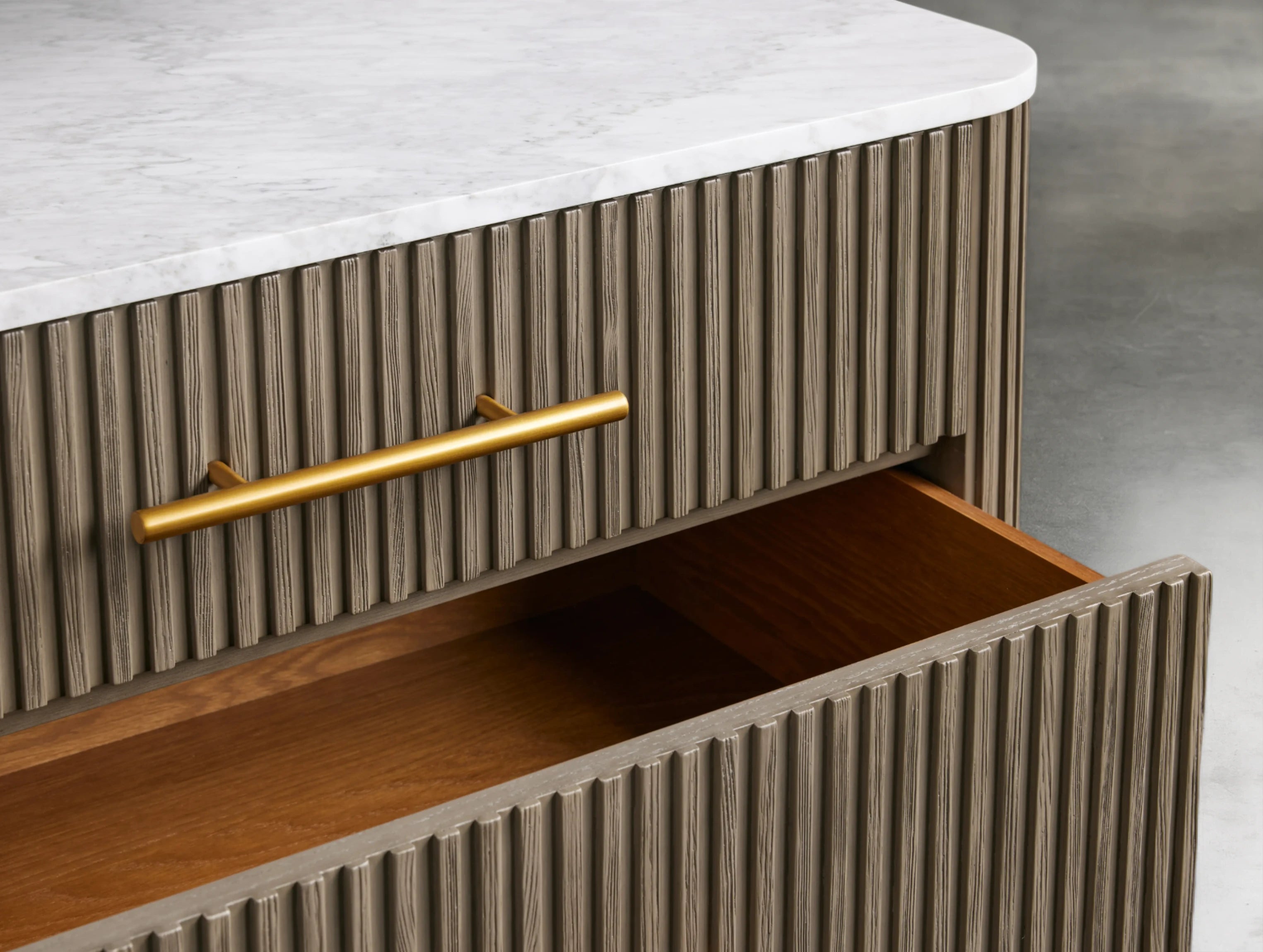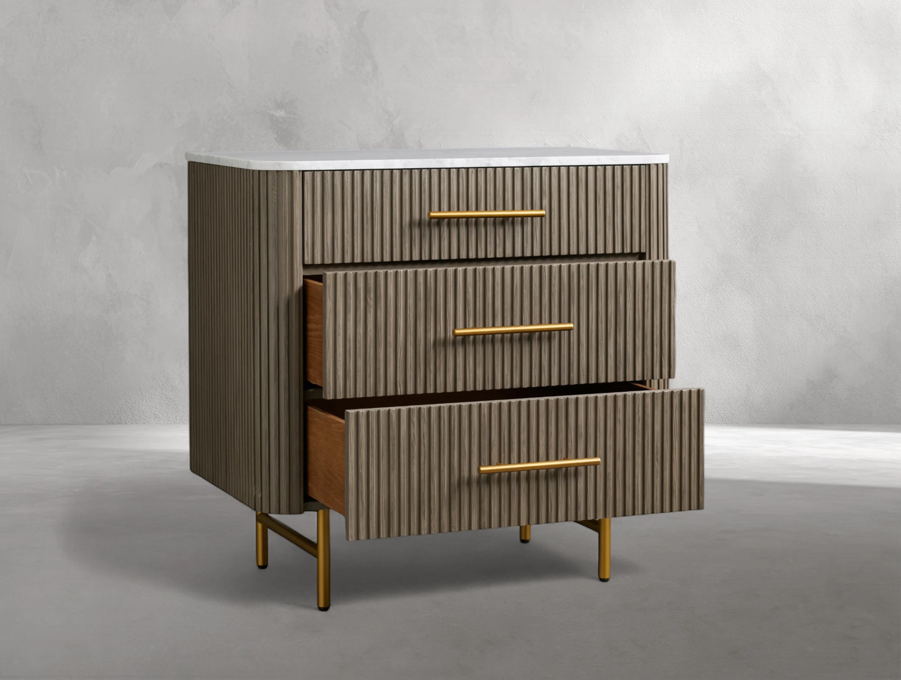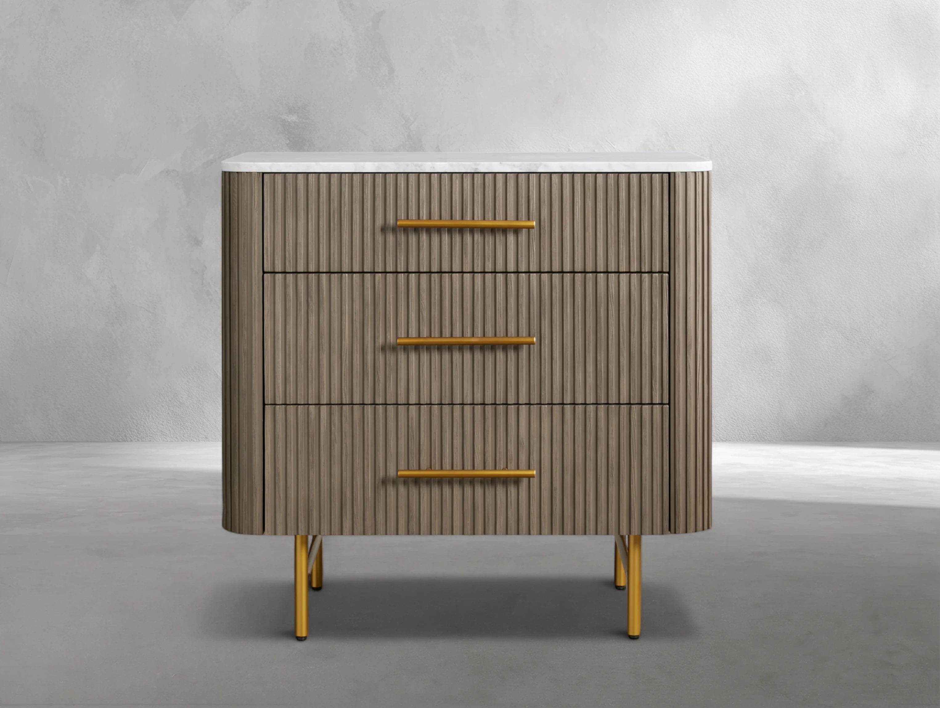 The Rolphin three-drawer chest blends natural textures with refined details in a striking mixed-material design. Crafted from hand-finished Finnish pine or premium white oak, it features reeded oak accents, brass hardware, and a natural stone top—available with unique variations in color and veining that make every piece one of a kind. With generous storage and timeless elegance, it’s the perfect addition to any bedroom.
