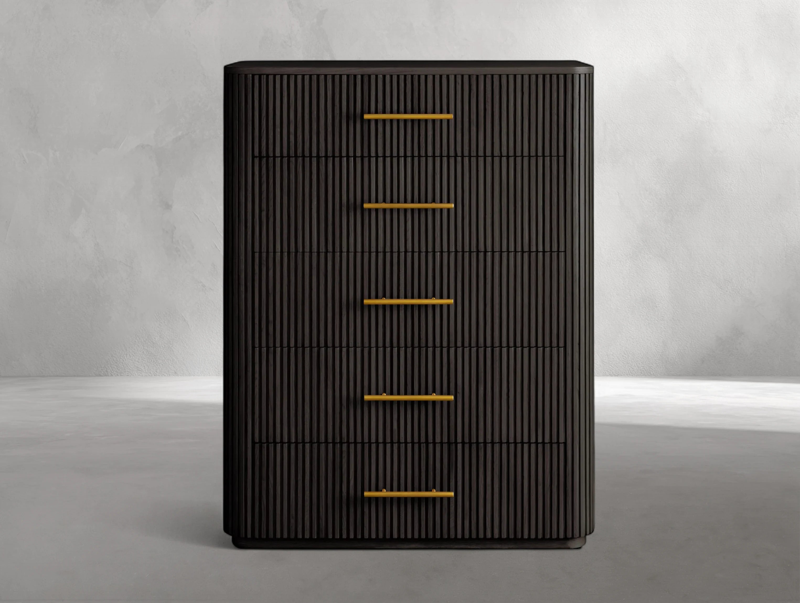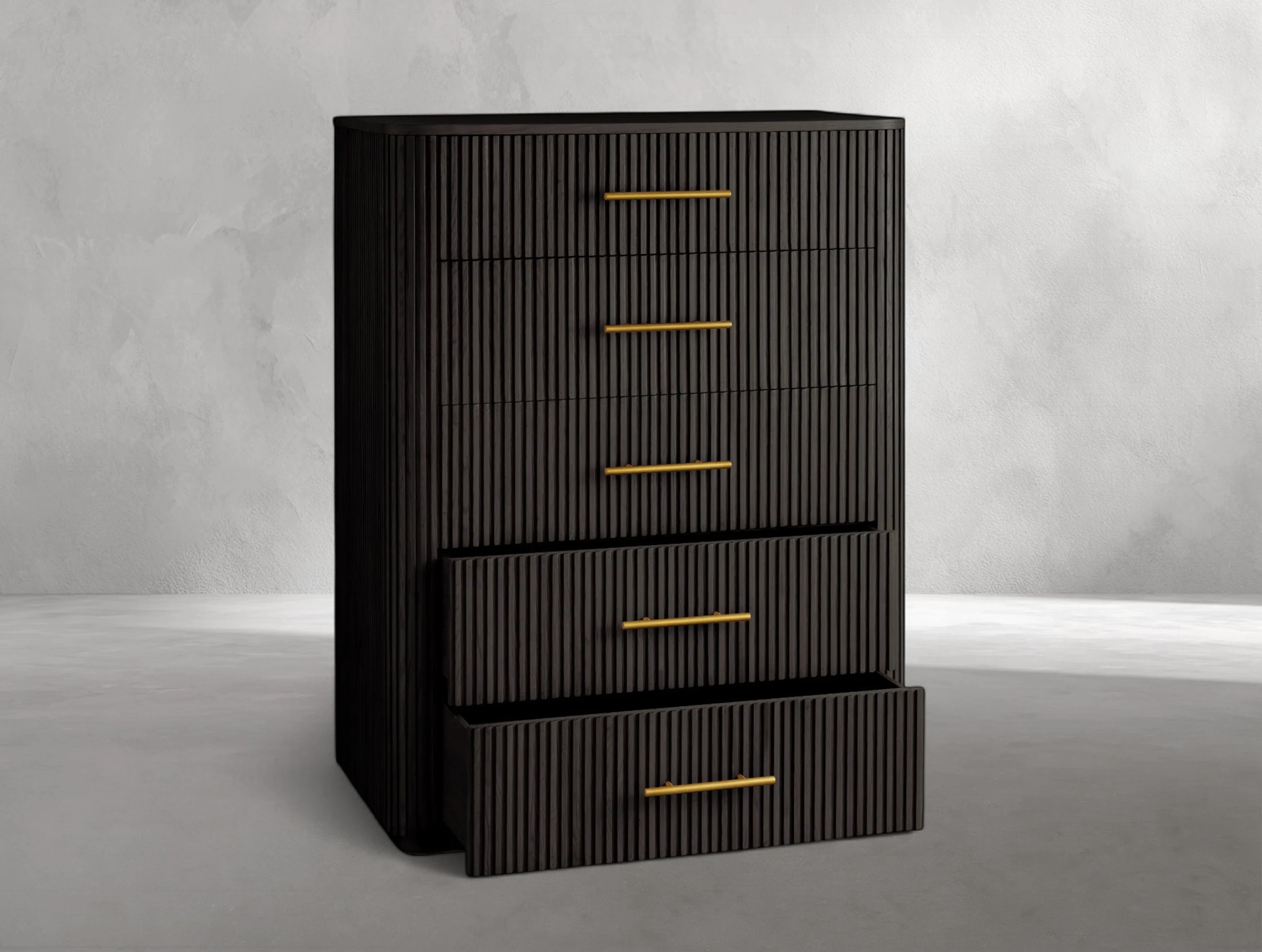 The Rolphin five-drawer dresser combines natural wood craftsmanship with refined stone detailing in a striking mixed-material design. Hand-finished Finnish pine or premium white oak is paired with reeded oak accents and topped with natural stone, making each piece one of a kind. With generous storage and timeless style, this dresser brings elevated character to any bedroom.