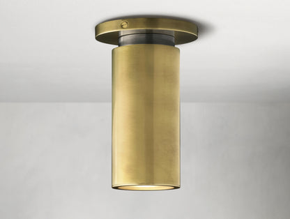 A refined reinterpretation of the utilitarian can light, this flushmount elevates a 1970s standard into a piece of sculptural elegance. Crafted from solid brass with luxe finishes, the design maintains the clean geometry of the original form while adding warmth and sophistication. Ideal for bathrooms, hallways, or covered outdoor spaces, it delivers understated light with timeless appeal.