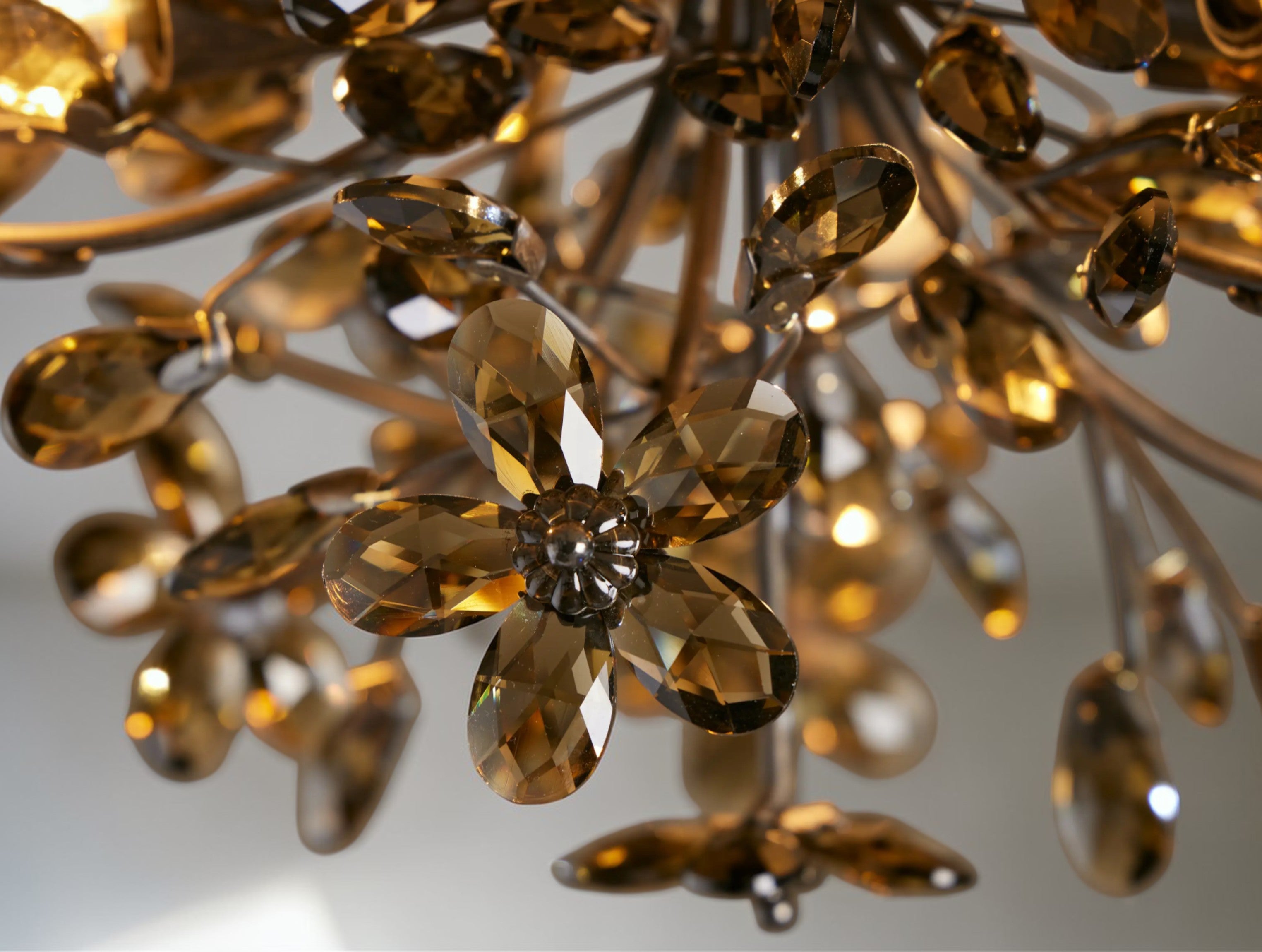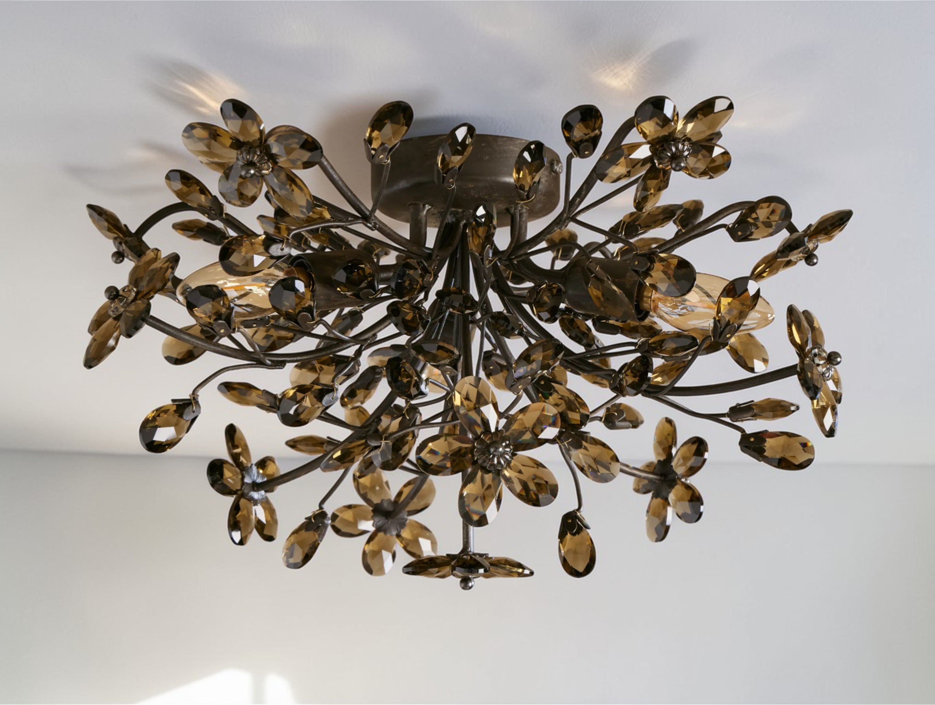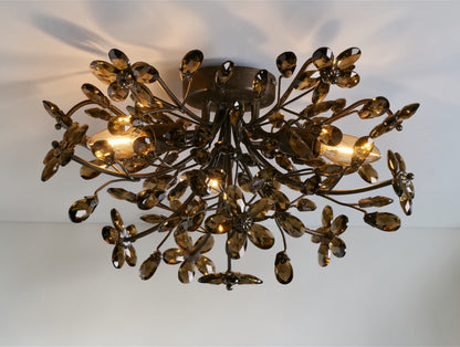 The Fiona Flush Mount brings the elegance of hand-finished Italian ironwork and sparkling crystal florals to spaces with lower ceilings. Crafted in Italy from solid iron with silver, gold, or bronze finishes, it features delicate botanical forms and includes E12 bulbs. This piece creates a radiant, nature-inspired accent in bathrooms, hallways, or bedrooms.