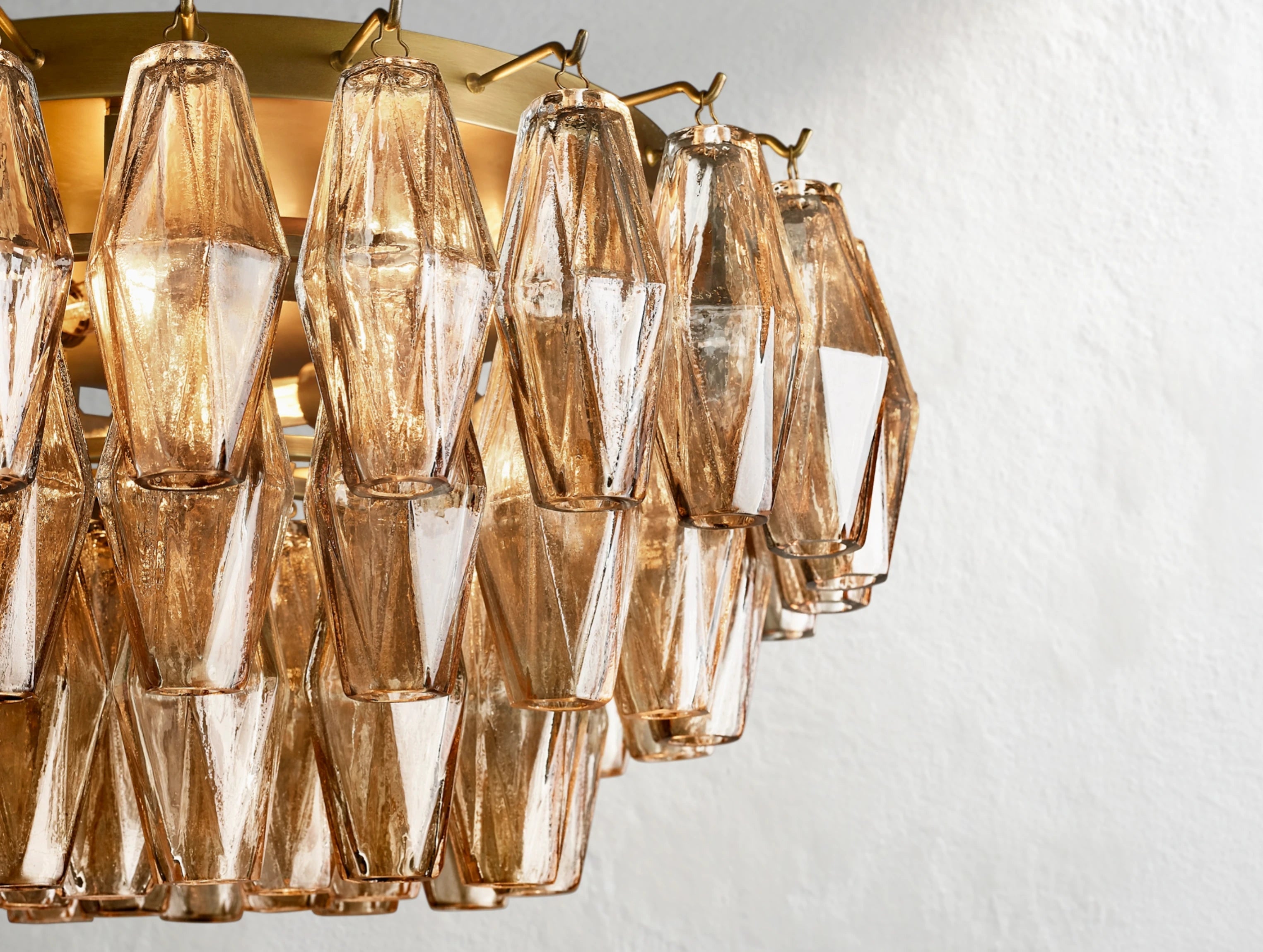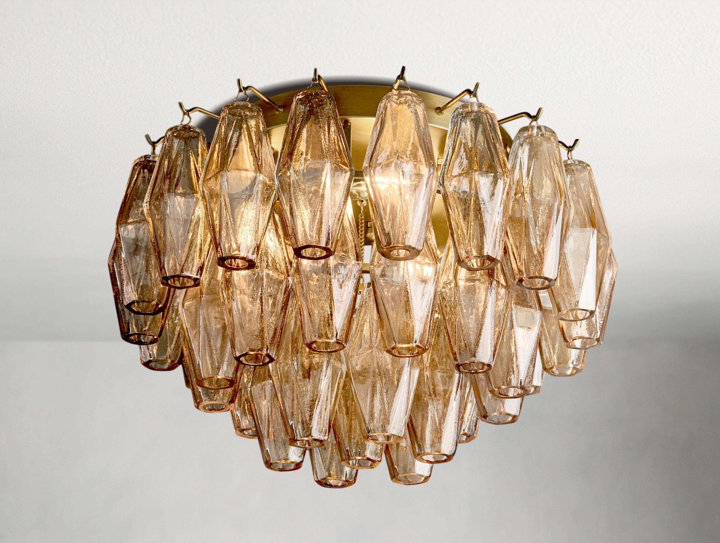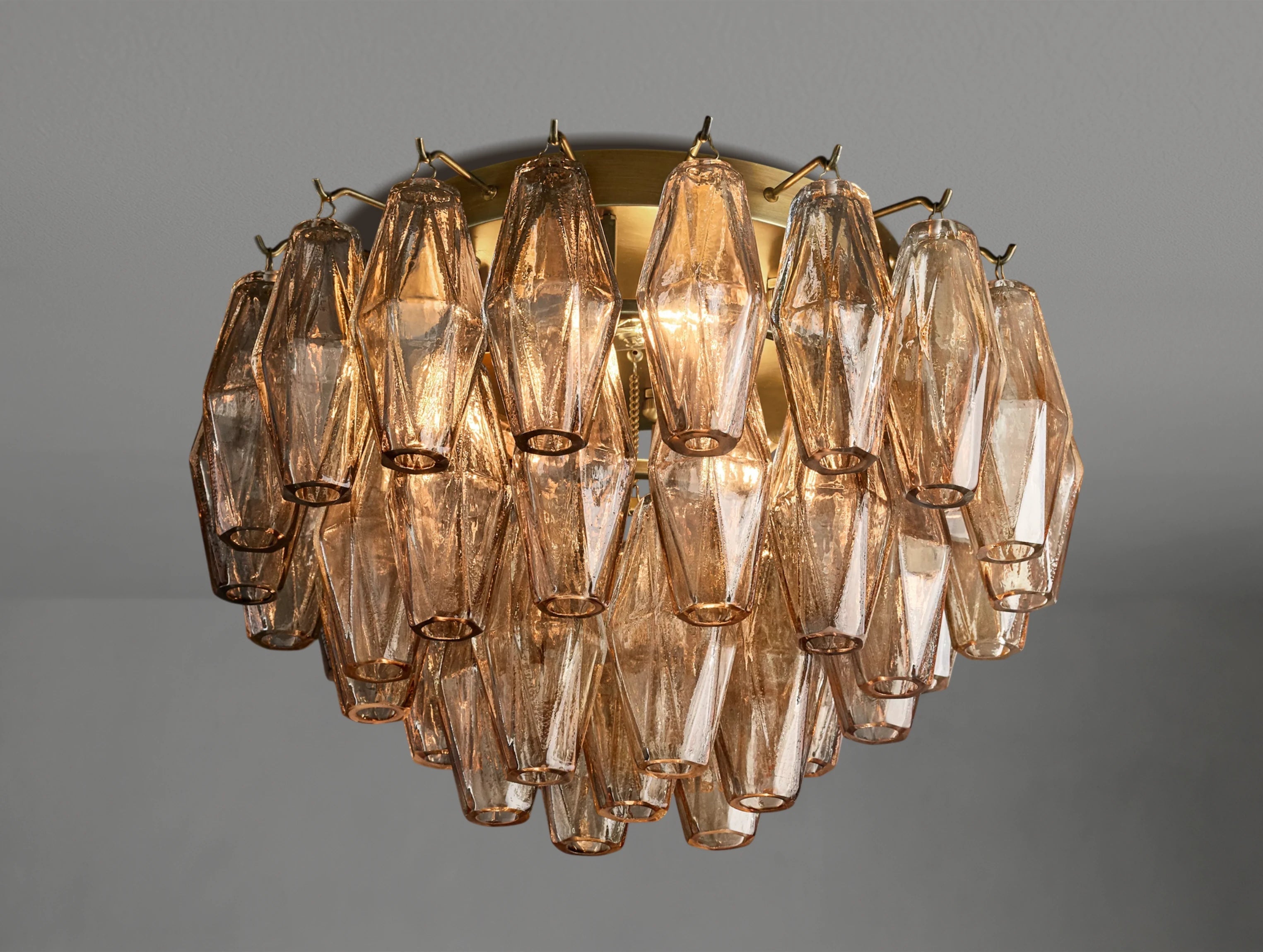 A modern heirloom with a sculptural twist. Inspired by 1950s Murano chandeliers, the Jayara Flushmount reframes the grandeur of blown glass into a space-saving silhouette. Handblown polyhedral pendants cascade from a compact steel mount, catching and reflecting the light like suspended gems. Ideal for entryways, powder rooms, or anywhere ceiling height is limited but elegance is not.