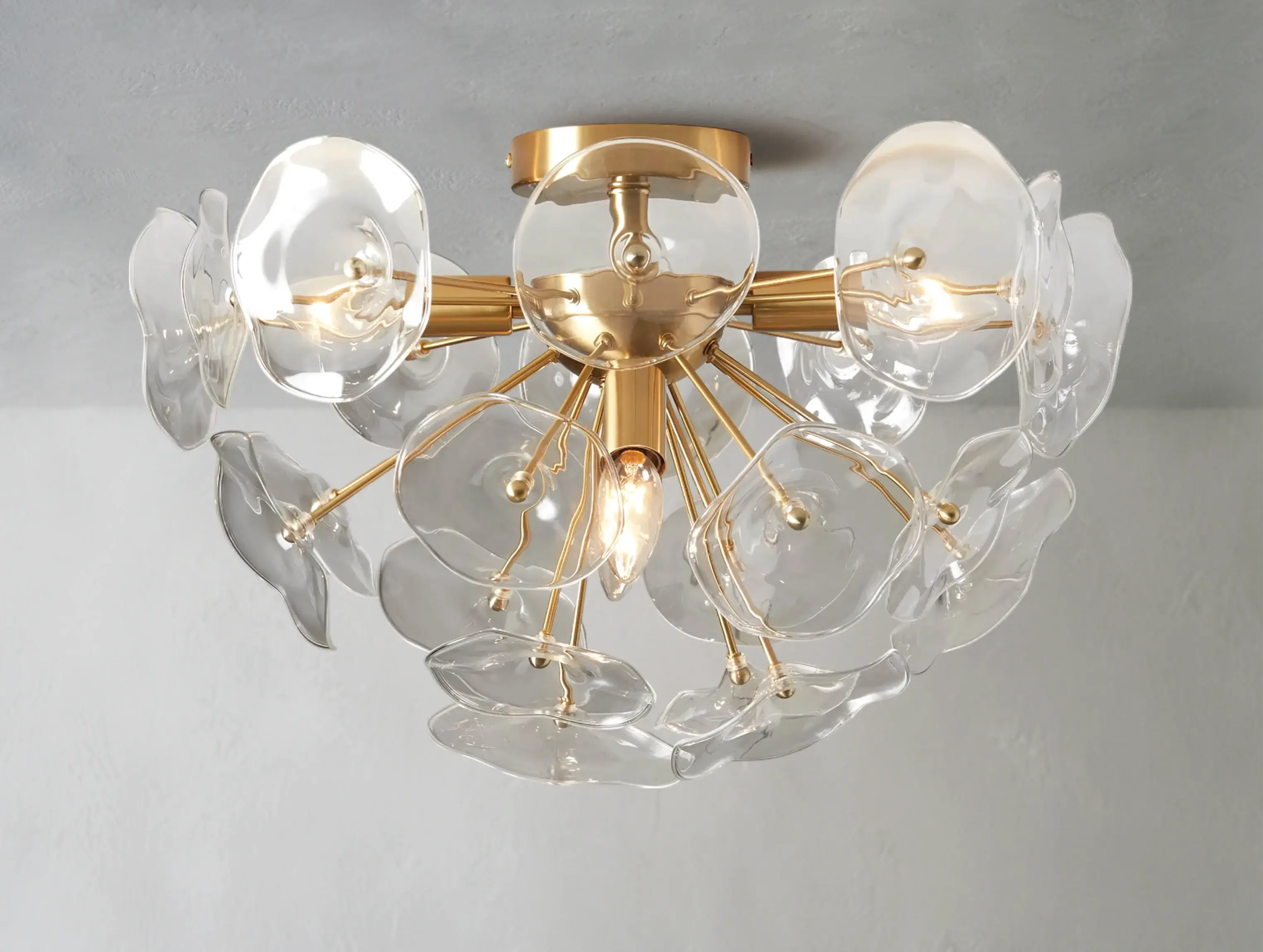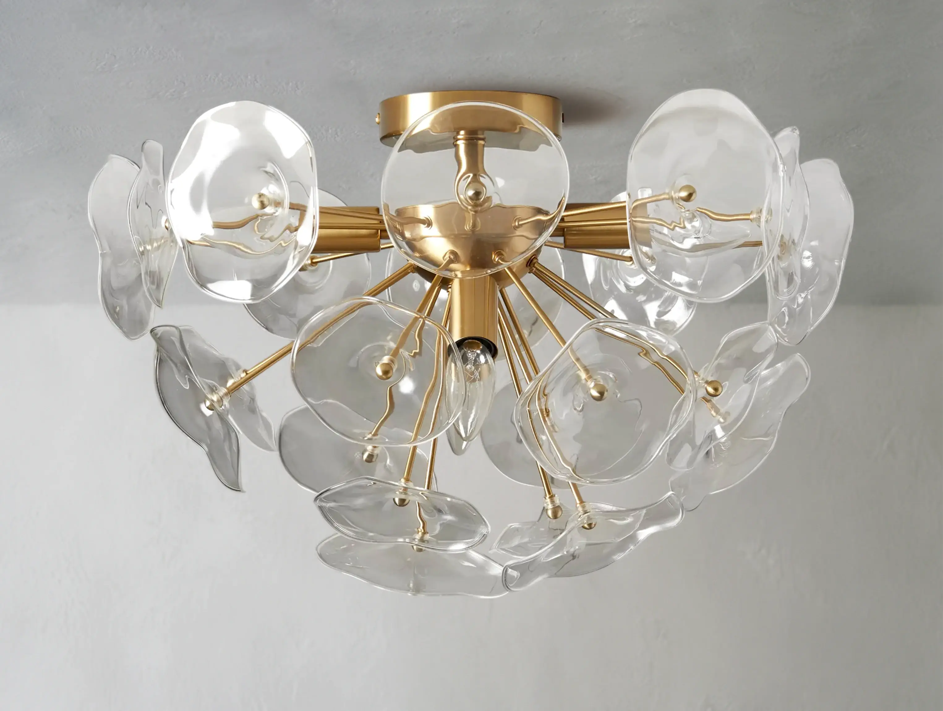 Delicate yet striking, the Morning Glory Flush Mount evokes the graceful bloom of its namesake flower. Framed in polished nickel or plated brass, and surrounded by 22 hand-set glass petals, this sculptural piece casts a warm, inviting glow. Includes four E12 bulbs and adds a floral-inspired statement to dining areas, entryways, or bedrooms.