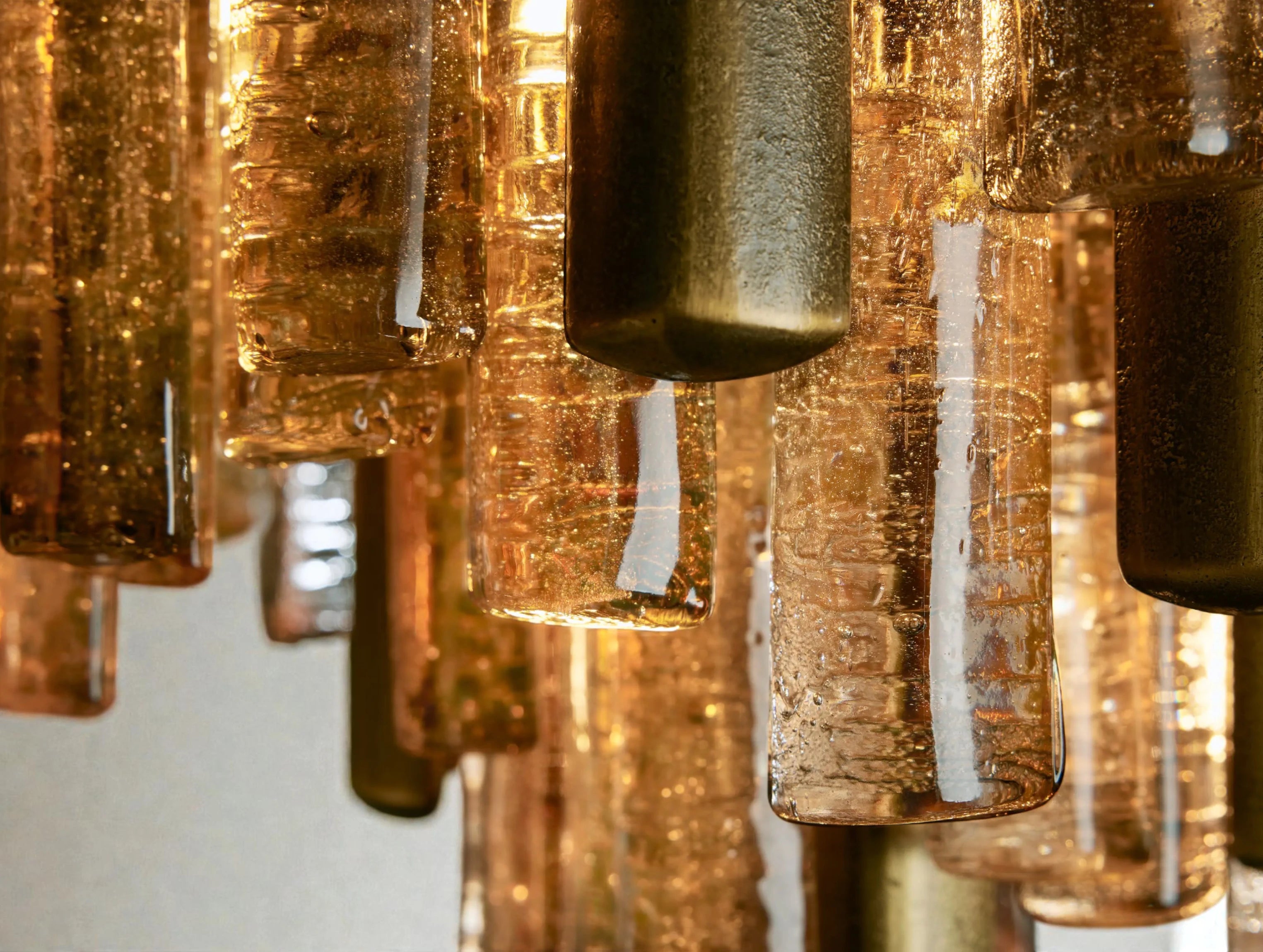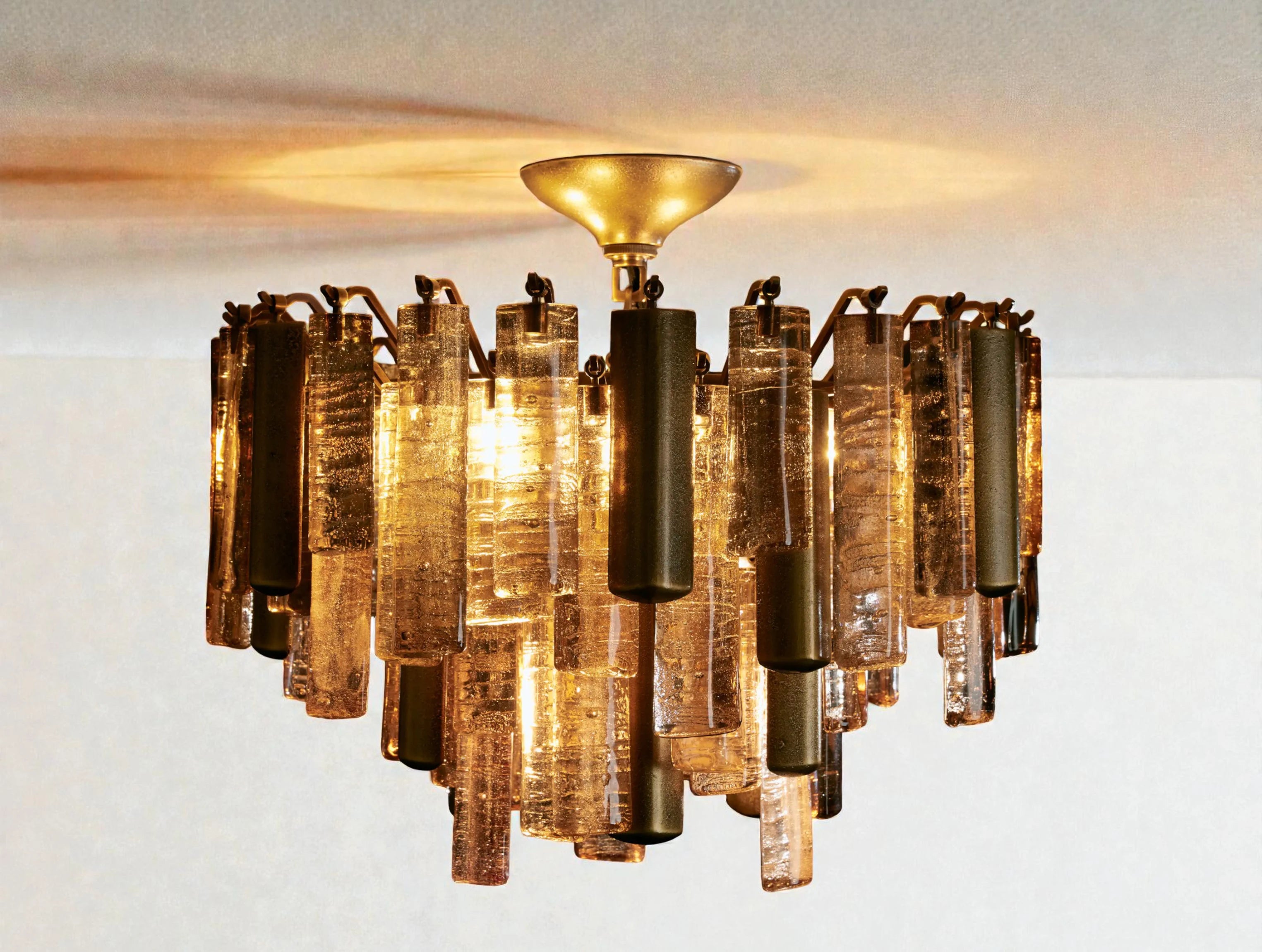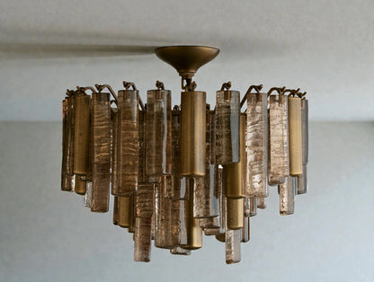 Inspired by traditional Italian Murano fixtures, this flush mount blends cast glass and metal into a richly layered, light-catching form. When illuminated, the glass softly diffuses light with sculptural depth, creating an elegant ambient glow. Its low-profile design makes it ideal for spaces where ceiling height is limited, without sacrificing visual presence or artisanal character.