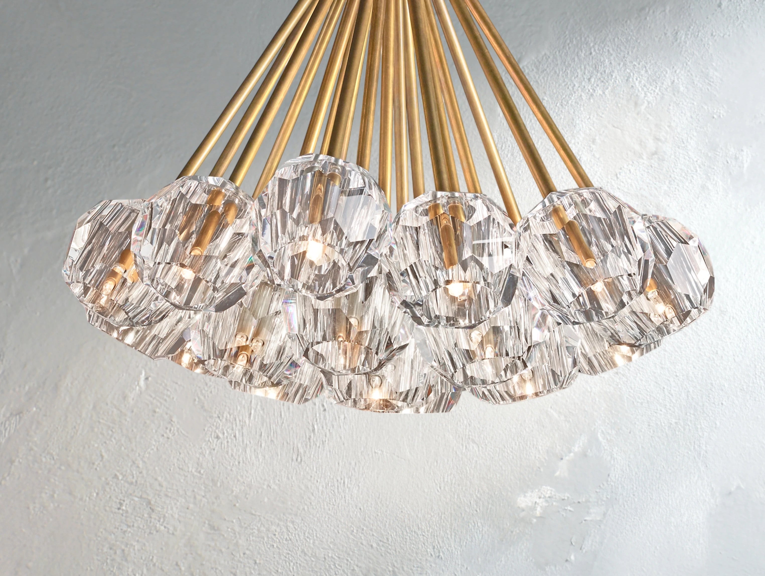 With its precise geometry and radiant materials, this flushmount light brings the refined drama of crystal to ceilings where space is limited but impact is essential. A series of faceted crystal spheres, polished by hand, refract and reflect light across the room—creating a sophisticated statement in both modern and transitional interiors.